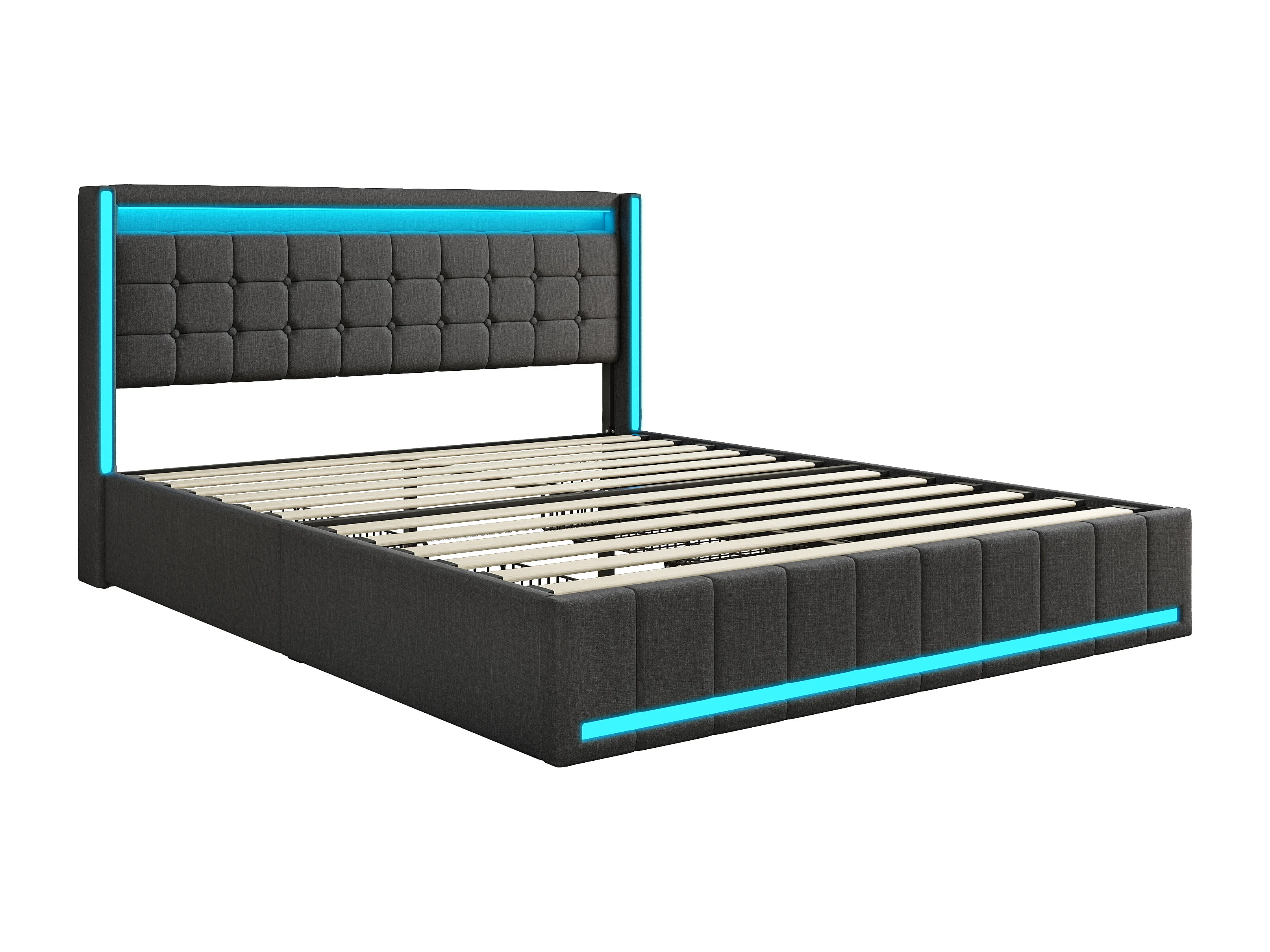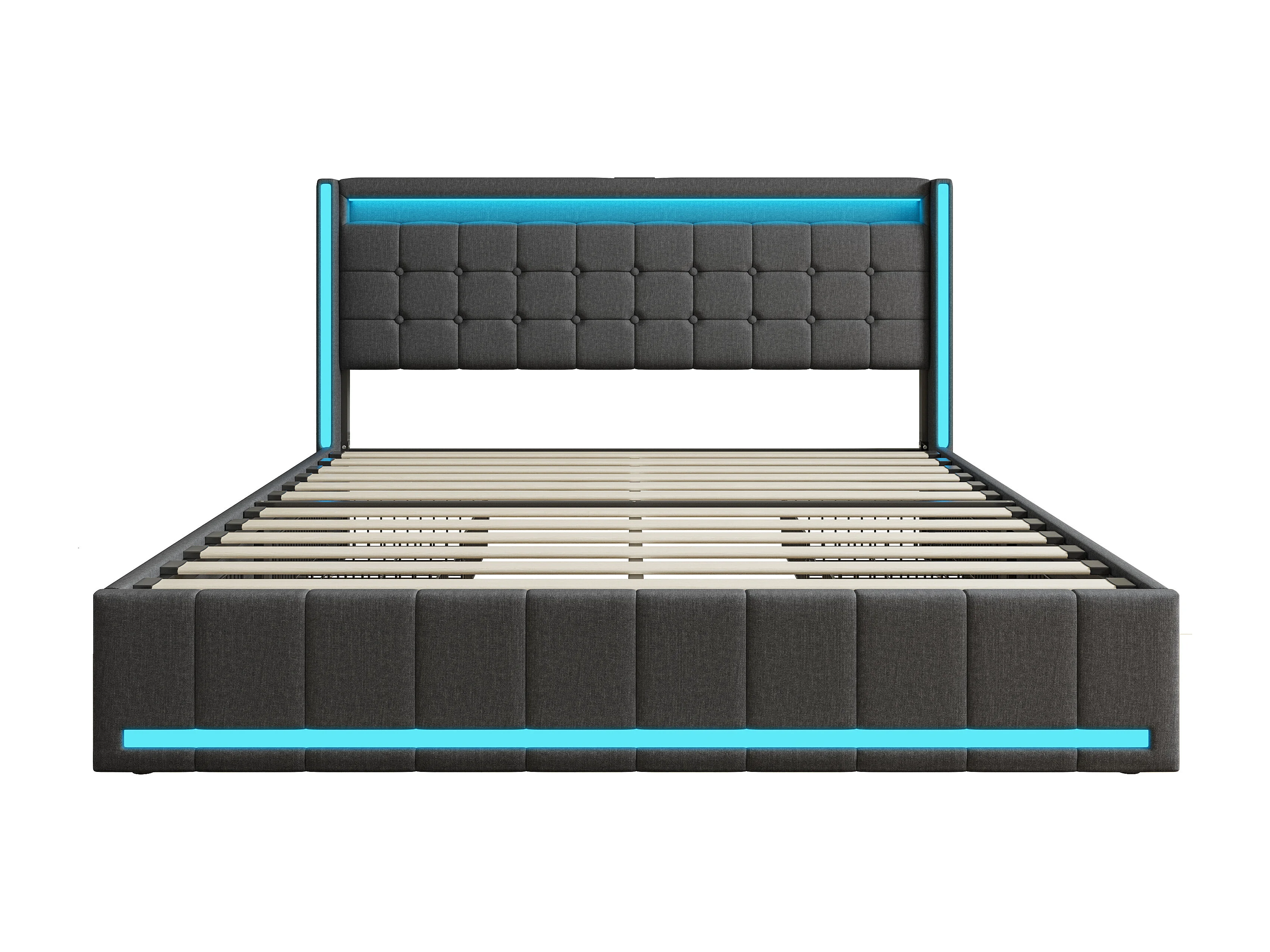 Letto contenitore 160x200 con LED e testiera, letto imbottito con rete a doghe, letto matrimoniale, grigio