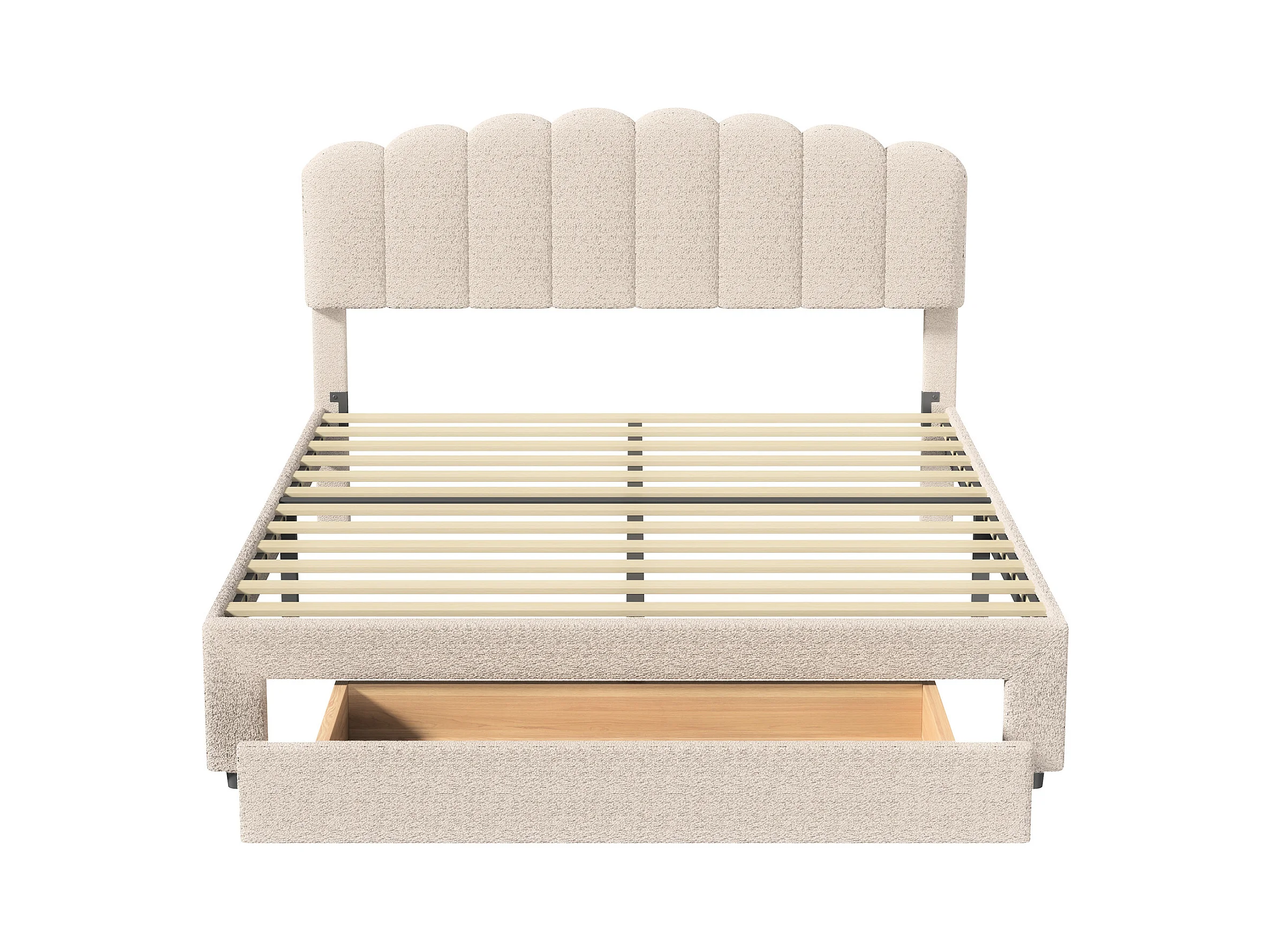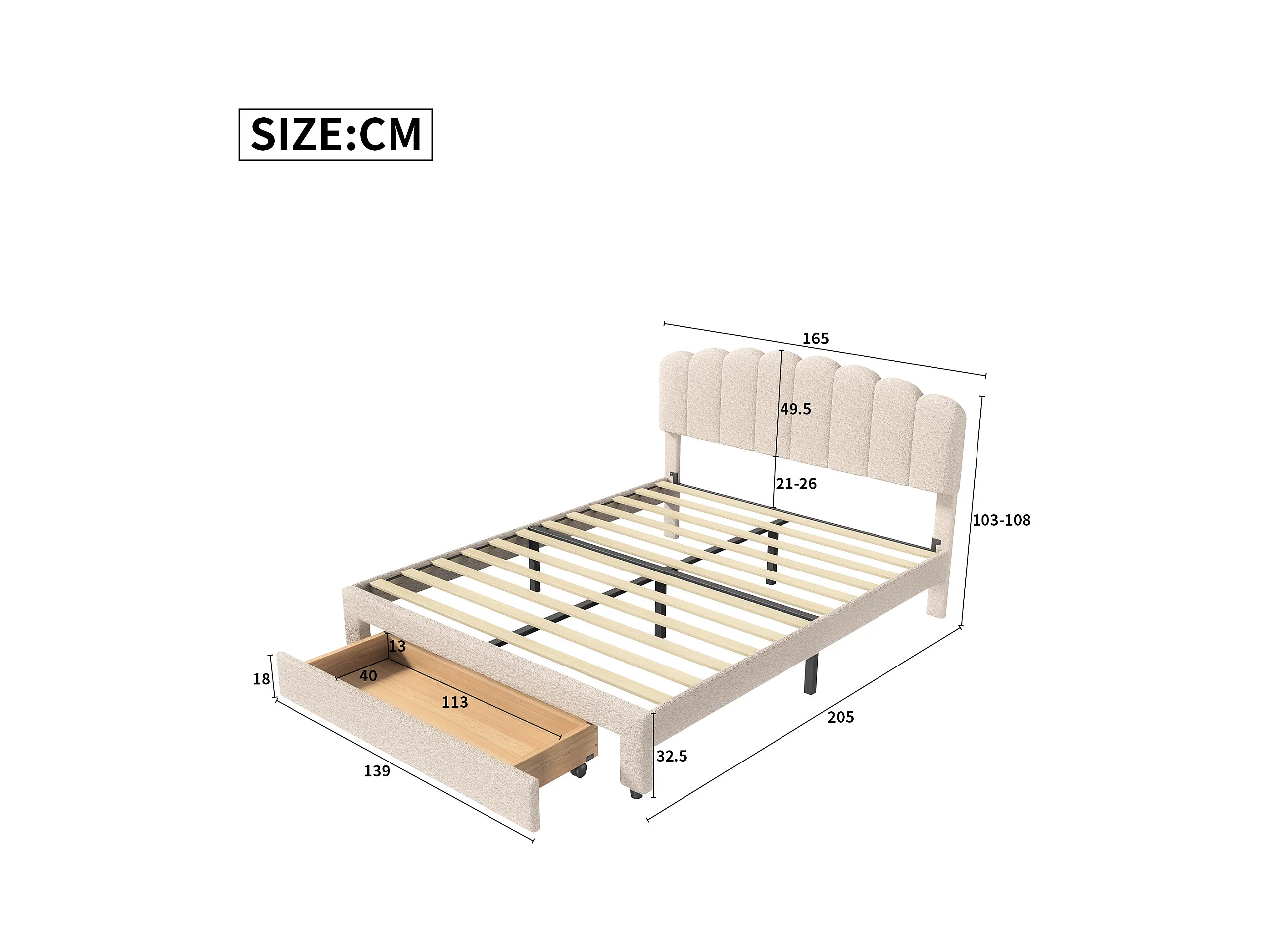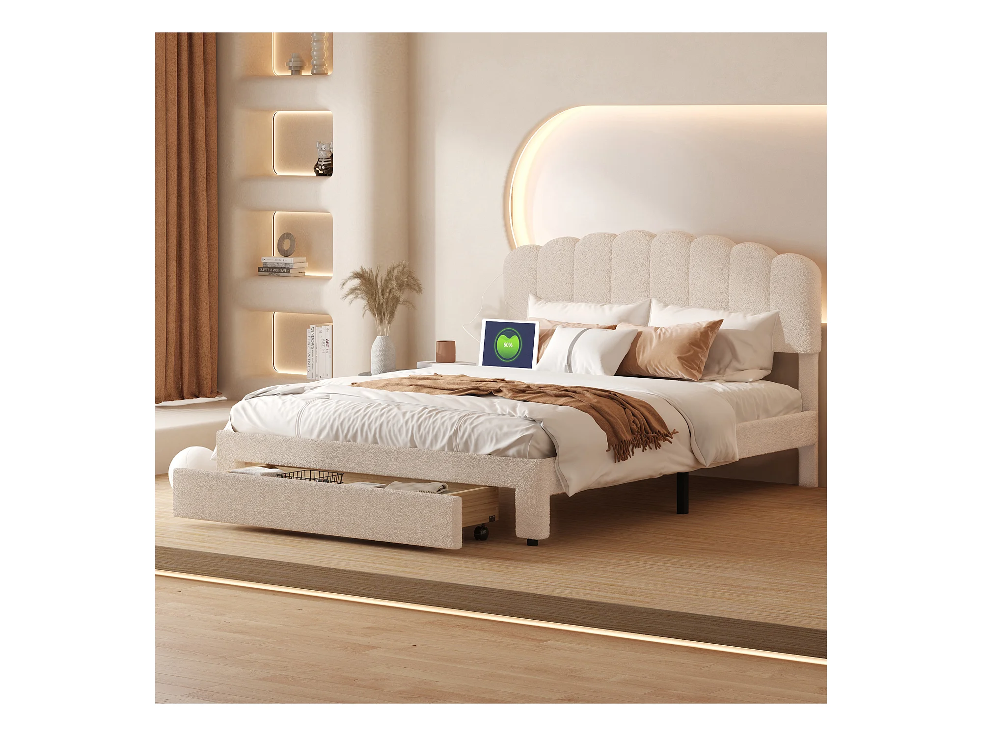 Letto matrimoniale imbottito 160x200cm con USB e cassetti grandi - tessuto sherpa - con rete a doghe - Beige