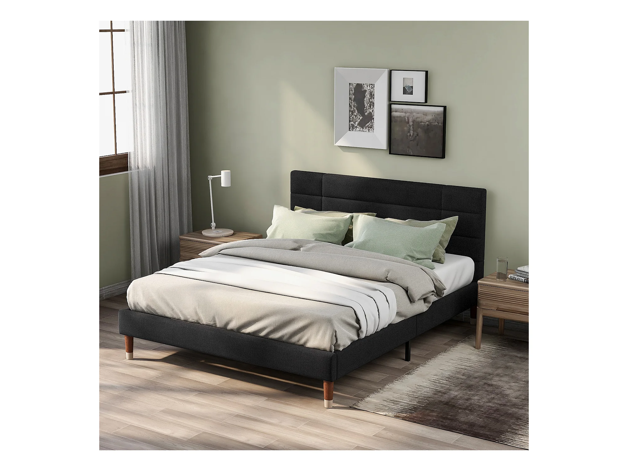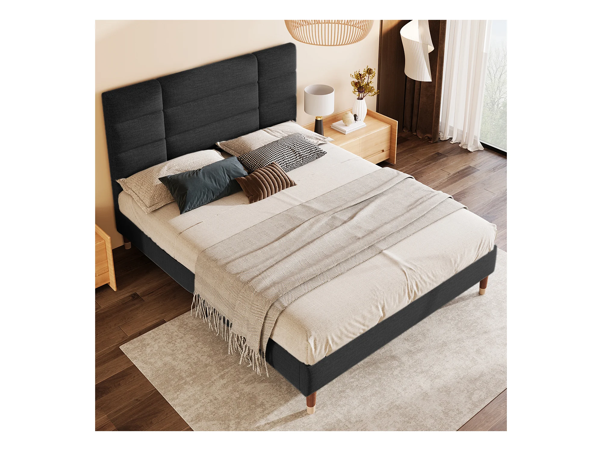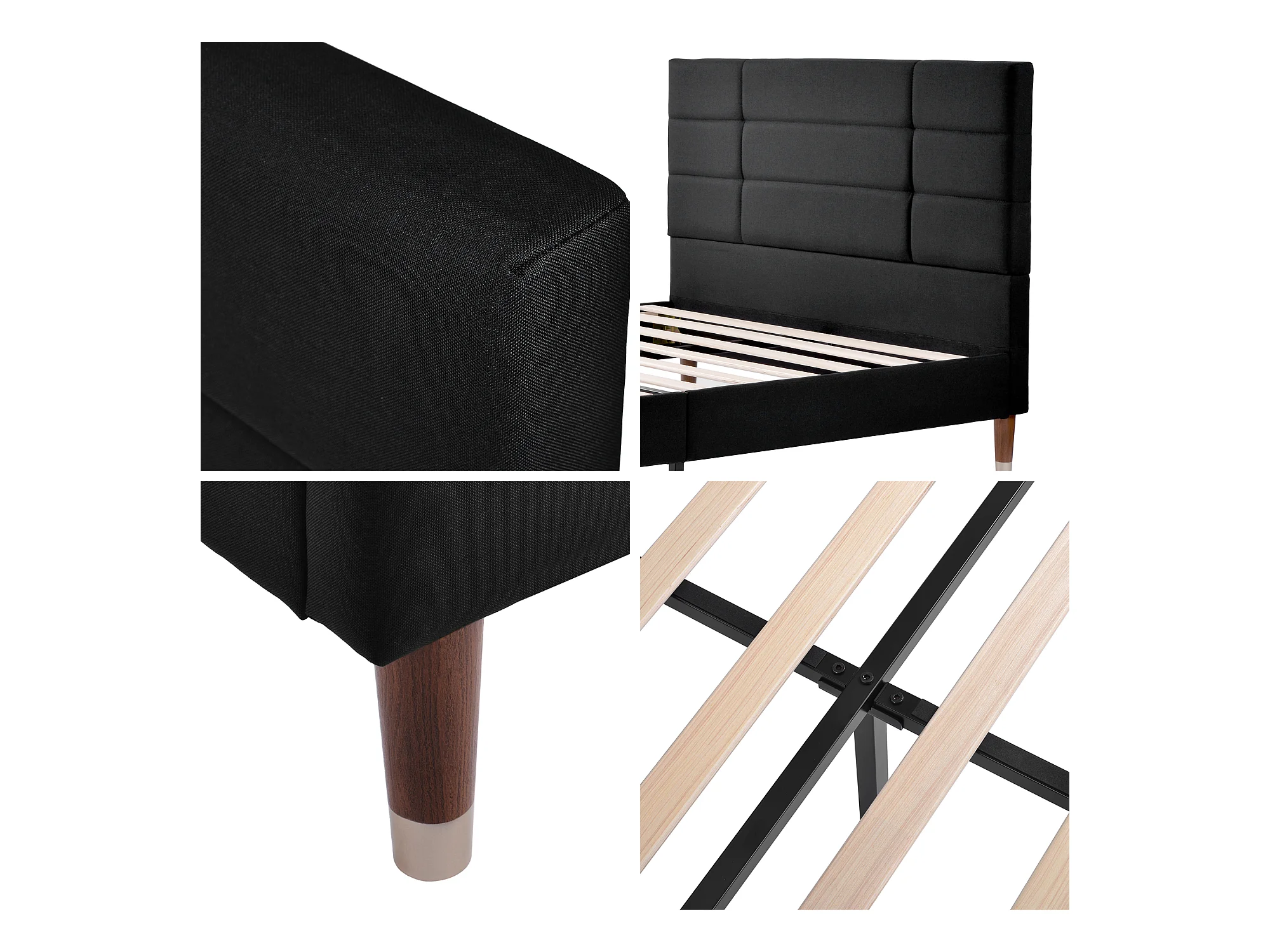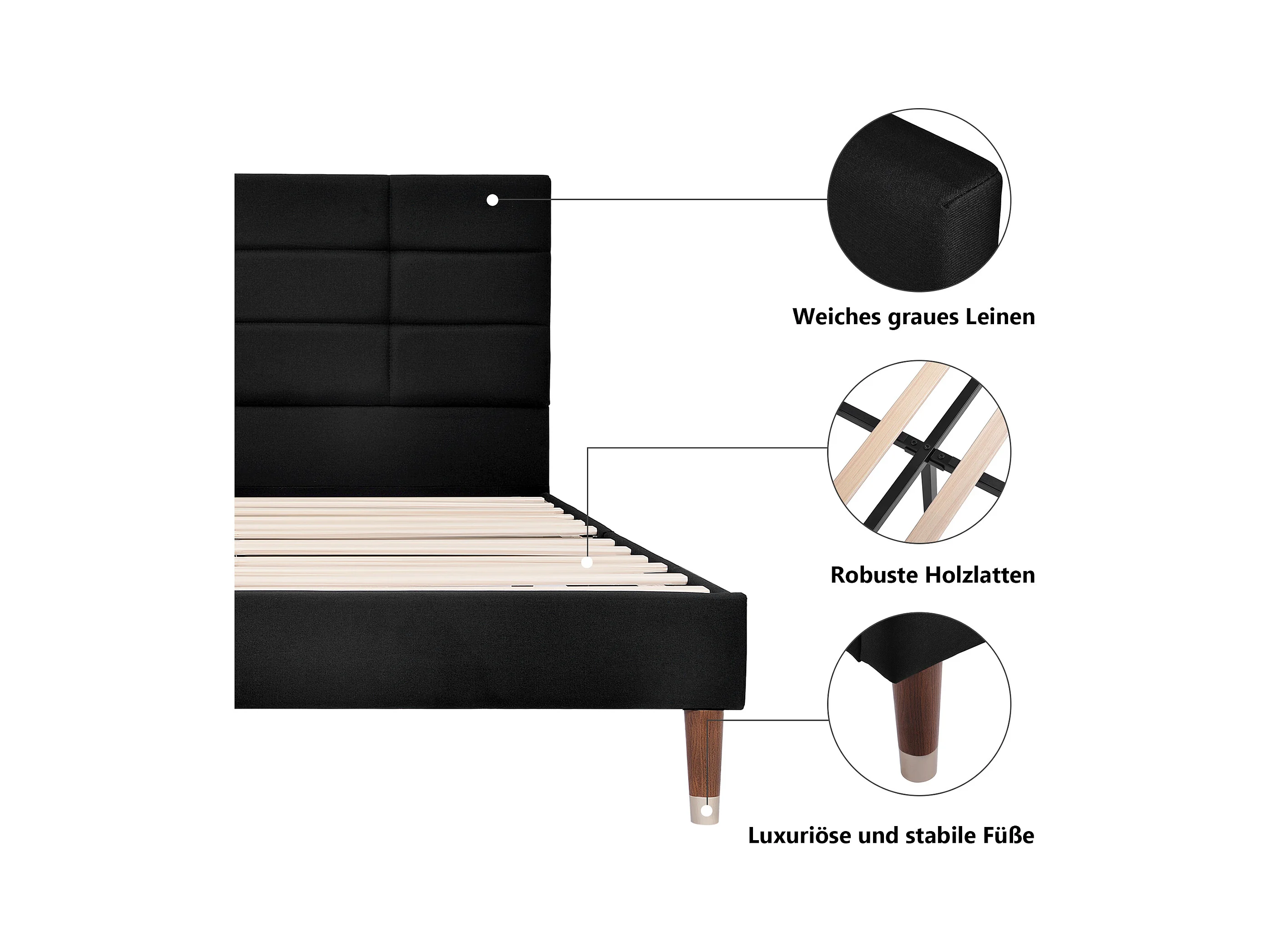 Letto matrimoniale imbottito con rete a doghe, testiera spessa, lino nero, struttura in legno massello (141x209x101cm)