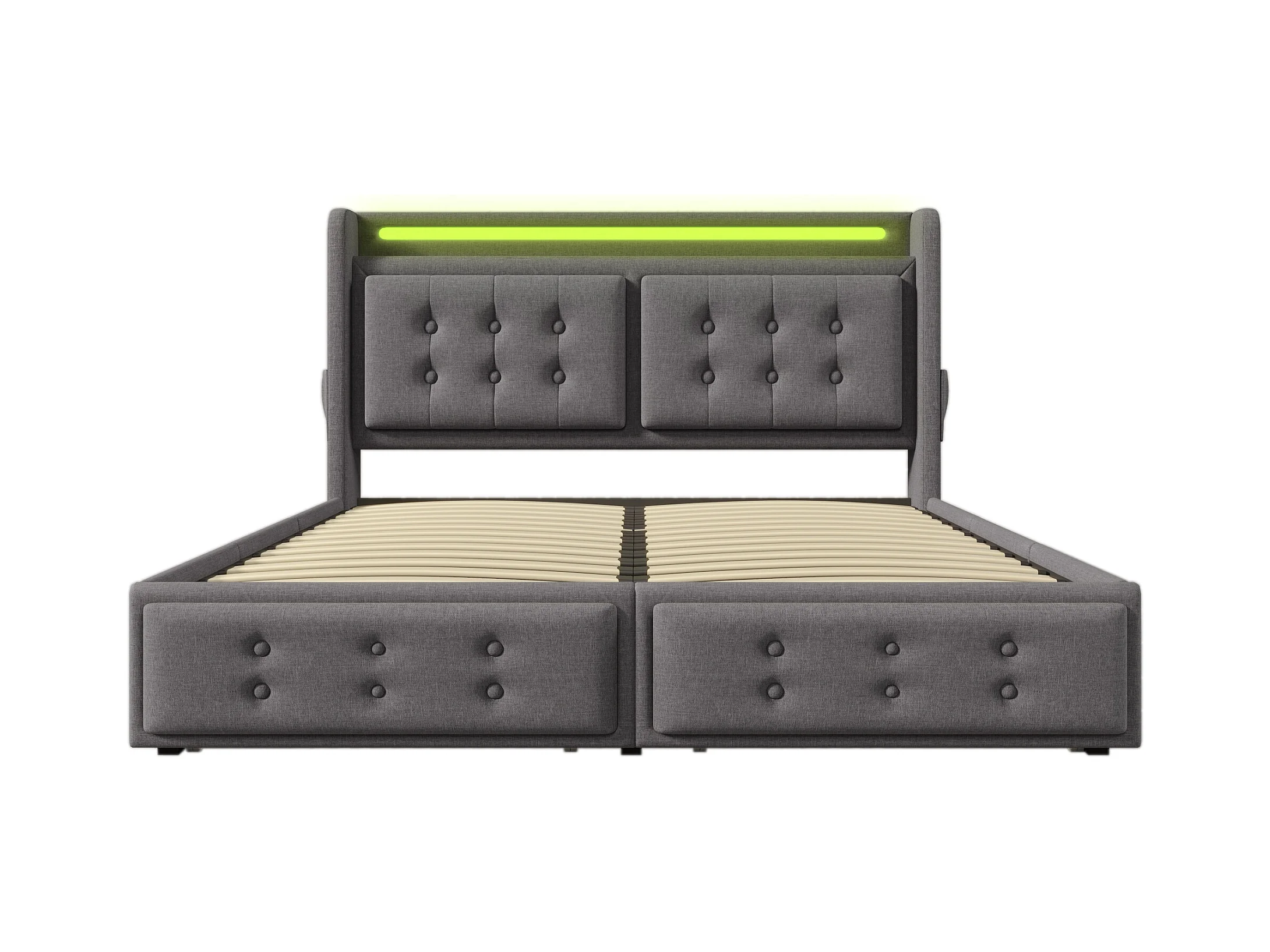 Letto matrimoniale 180x200 cm grigio in lino con 4 cassetti e LED, rete a doghe, senza materasso