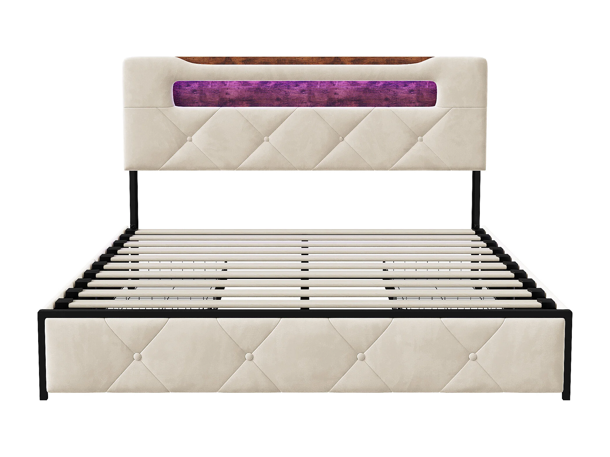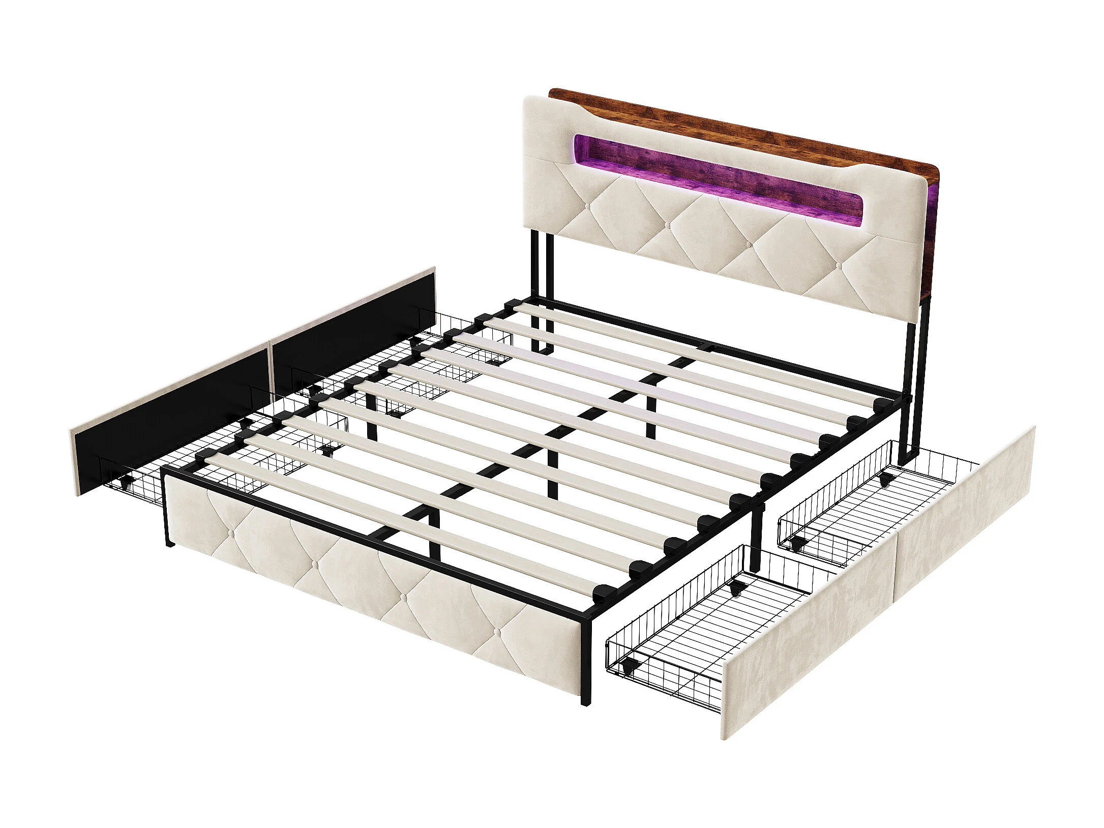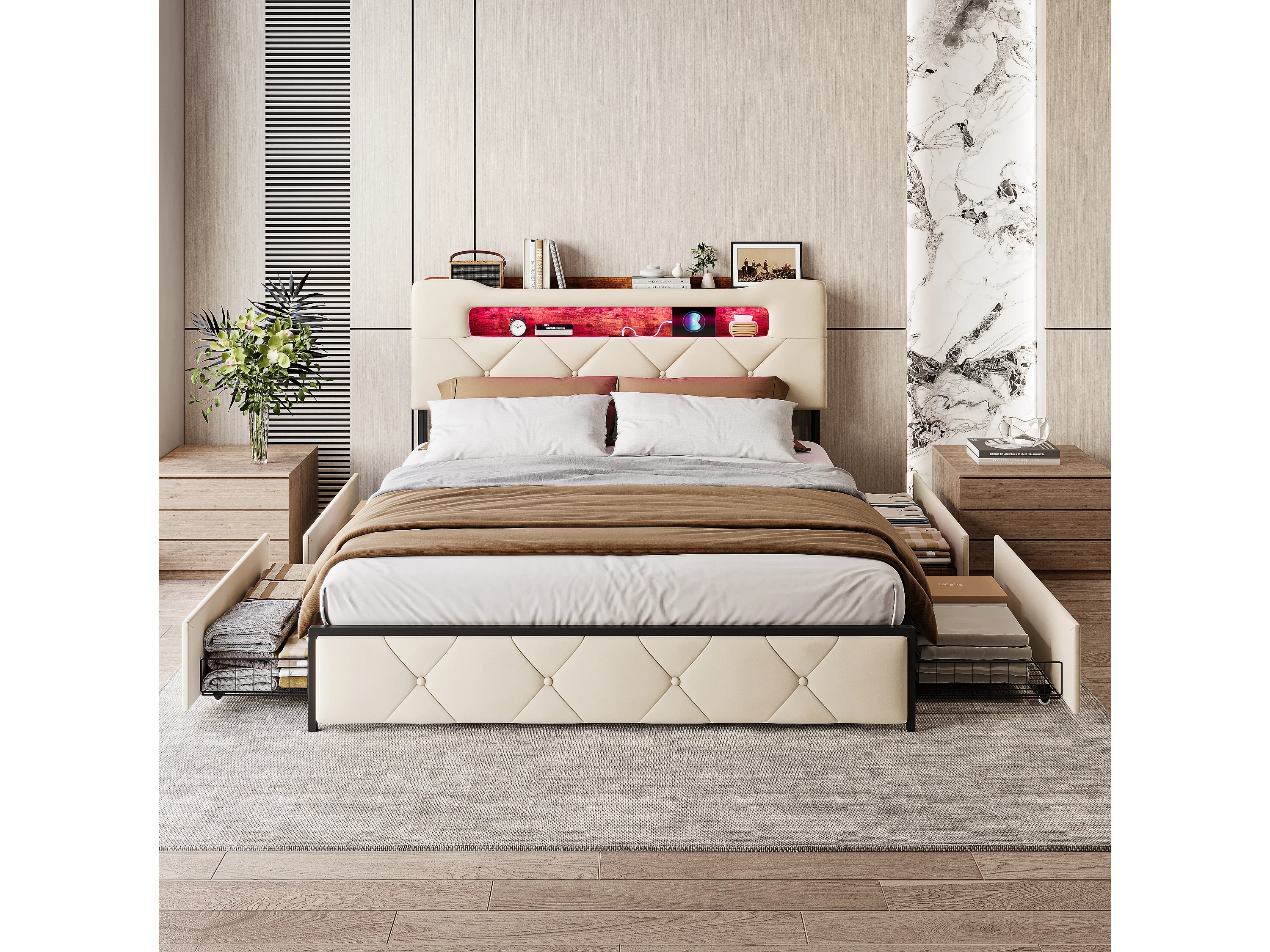 Letto matrimoniale imbottito in velluto beige 160x200 cm con 4 cassetti, illuminazione LED e porte USB integrate