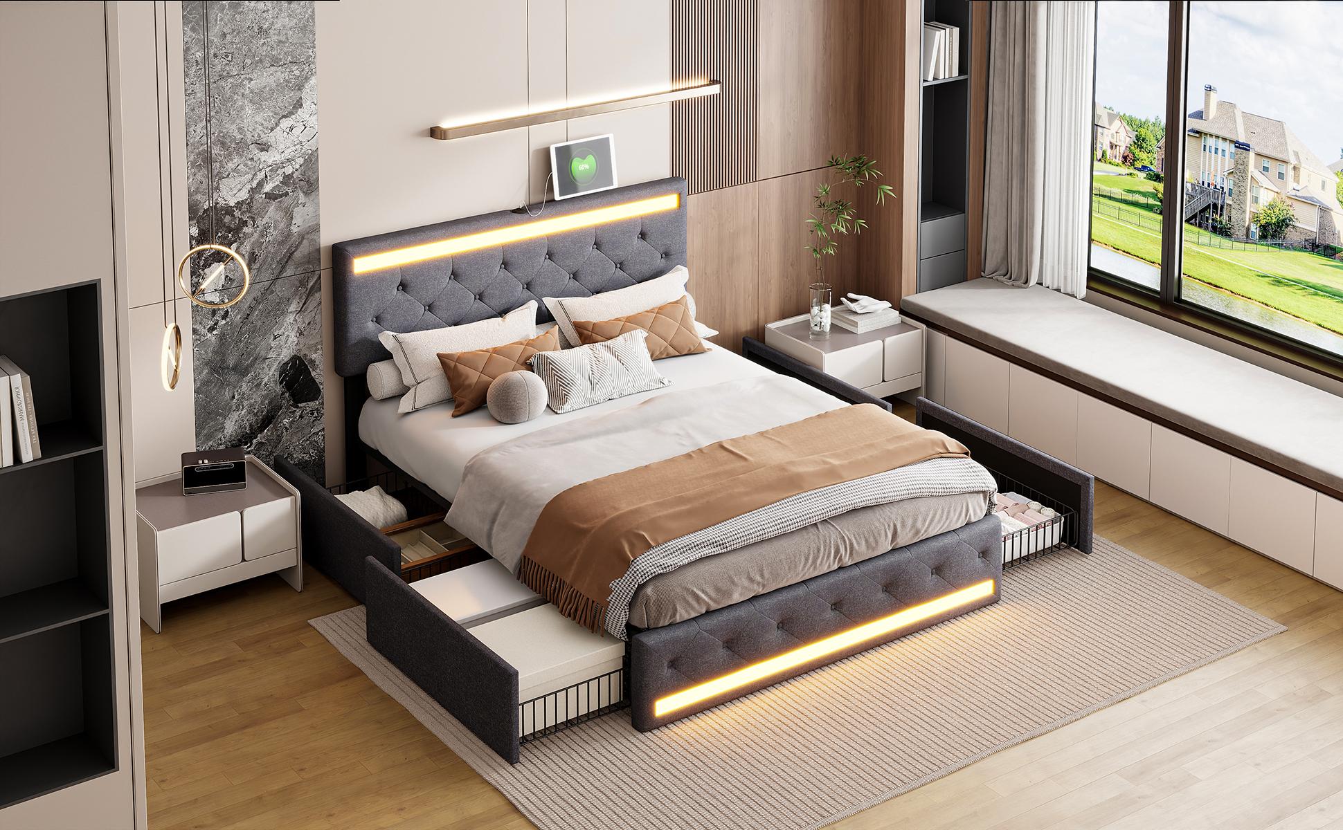 Letto matrimoniale in lino grigio scuro 140x190 cm – LED integrati, porte USB/Type-C, 4 cassetti in metallo