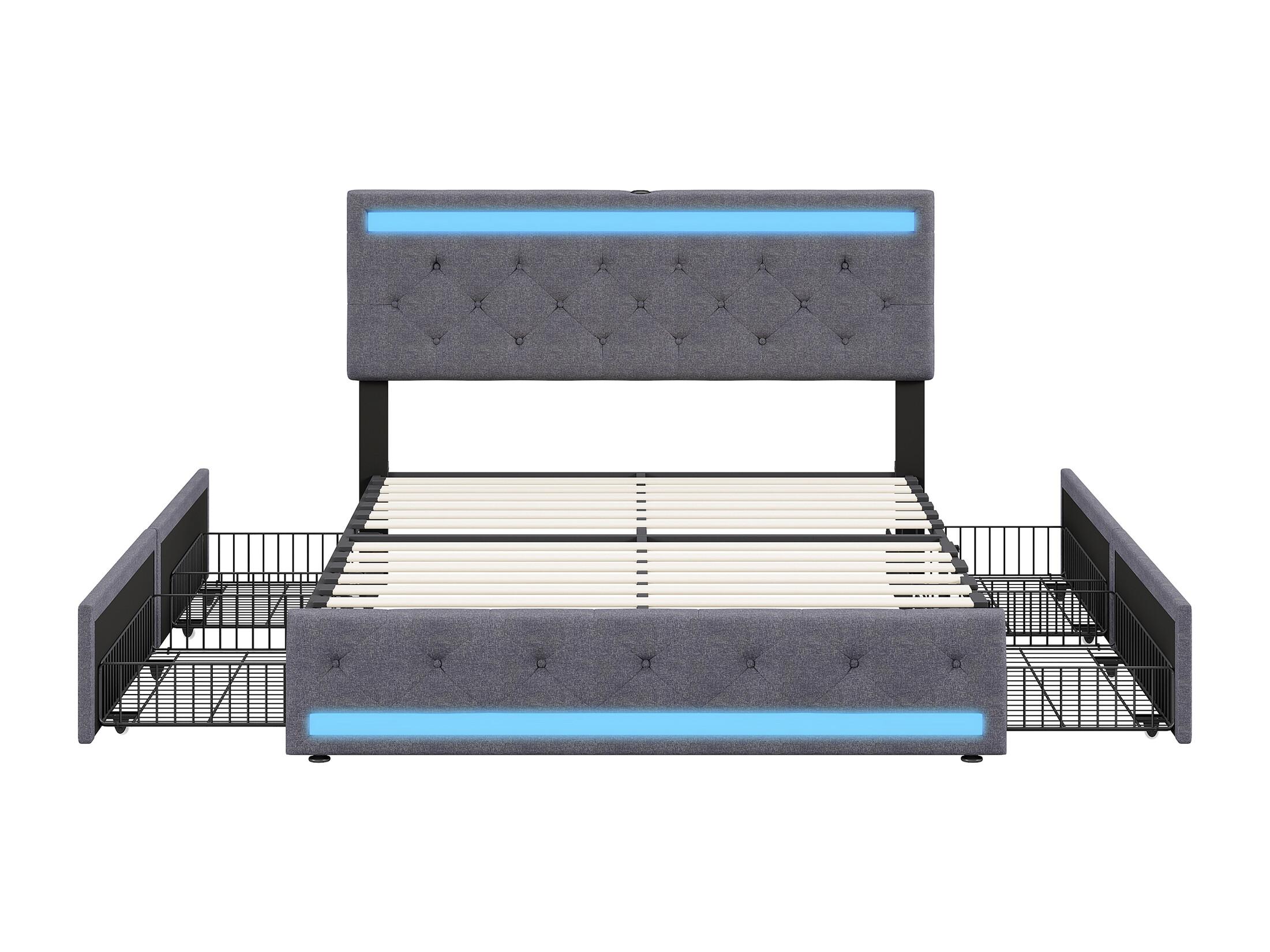 Letto matrimoniale in lino grigio scuro 160x200 cm – LED integrati, porte USB/Type-C, 4 cassetti in metallo