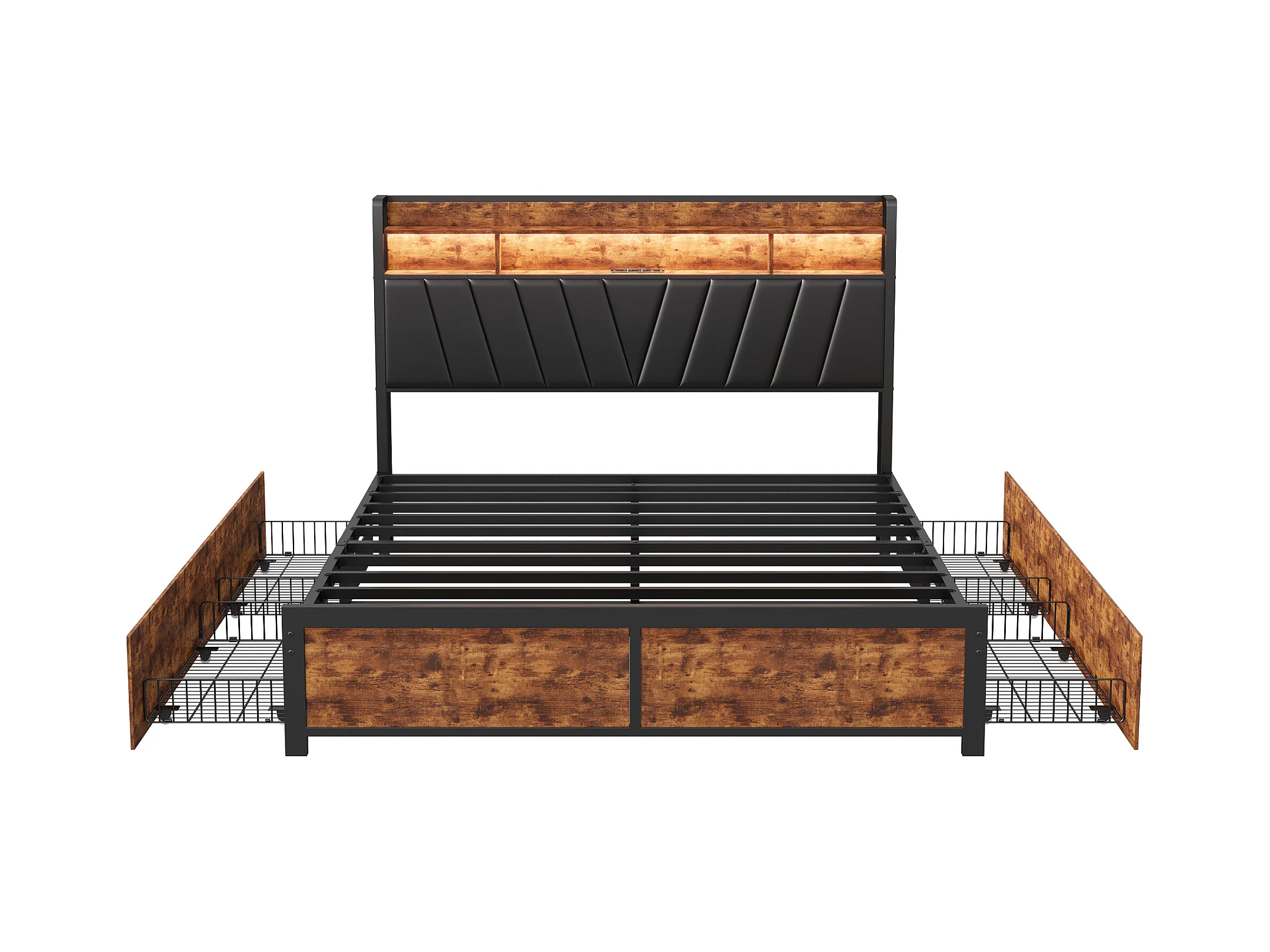 Letto matrimoniale in metallo 140x200 cm, con LED e USB, 4 cassetti, con rete a doghe, Nero