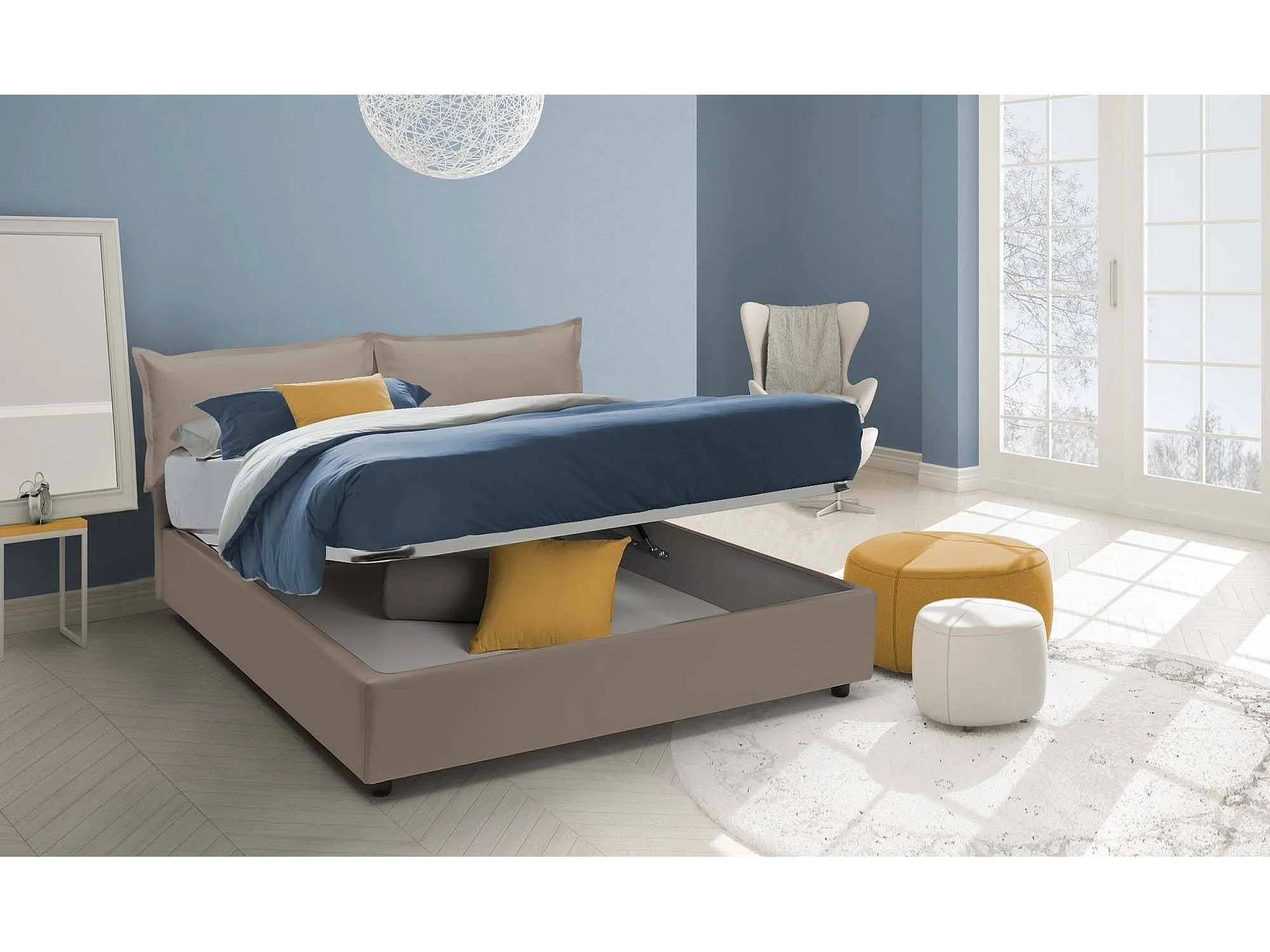 Letto matrimoniale Lucrezia, Letto contenitore con rivestimento in ecopelle, 100% Made in Italy, Apertura frontale, adatto per materasso Cm 140x200, Tortora
