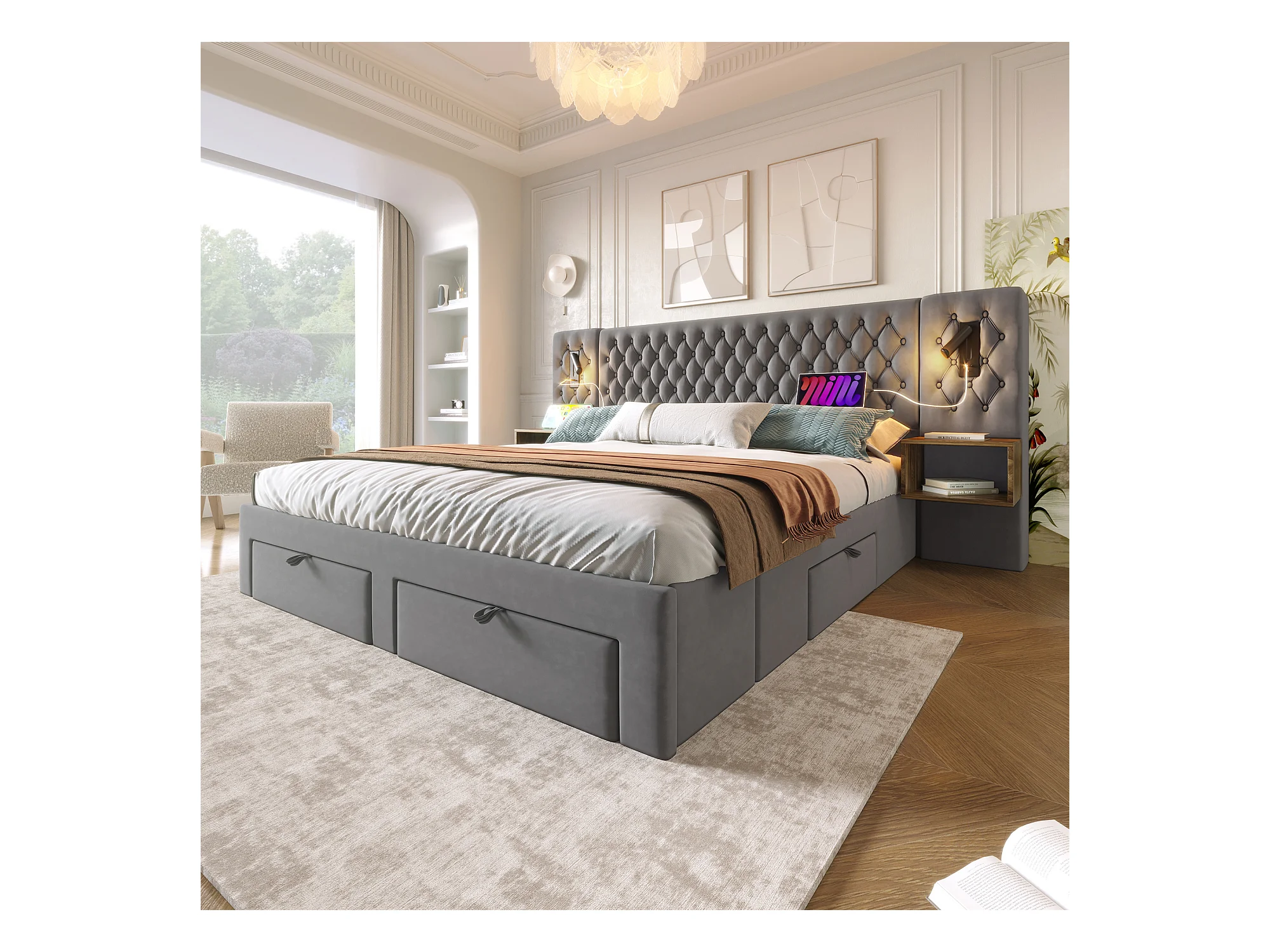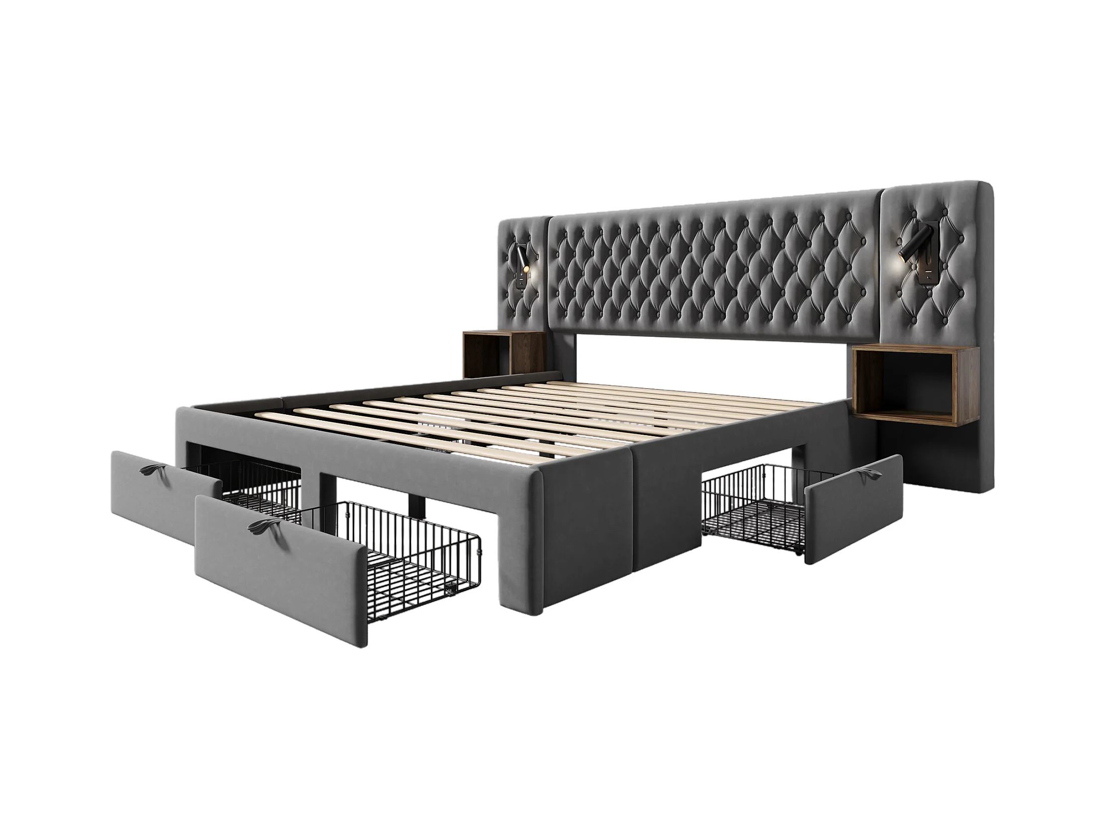 Letto matrimoniale per adulti 180x200cm in velluto grigio con 2 comodini, 4 cassetti, USB e luce di lettura, senza materasso
