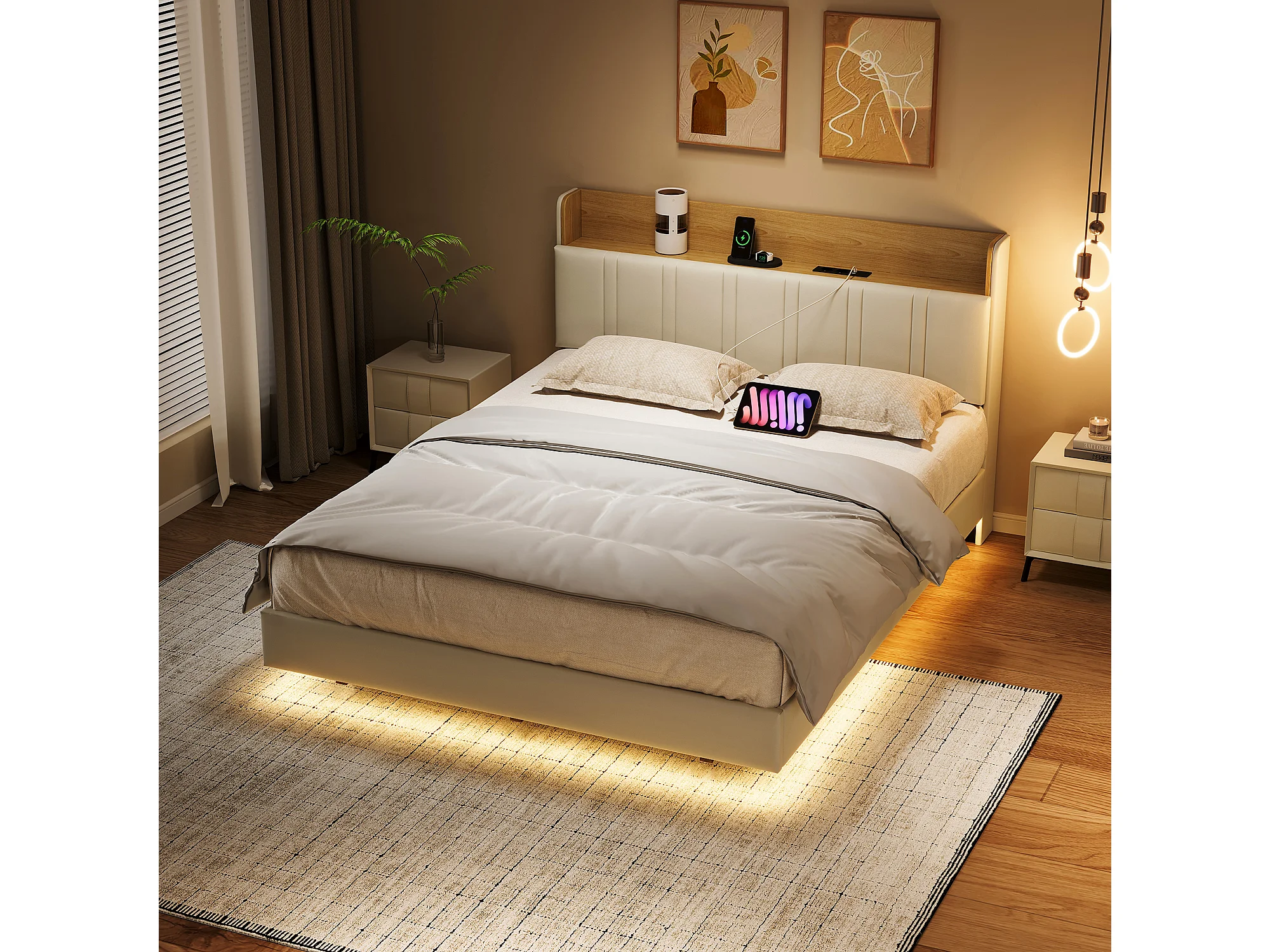 Letto matrimoniale sospeso di design con contenitore, LED multicolore e porte USB – 160x200 cm – Ecopelle bianca e rovere chiaro