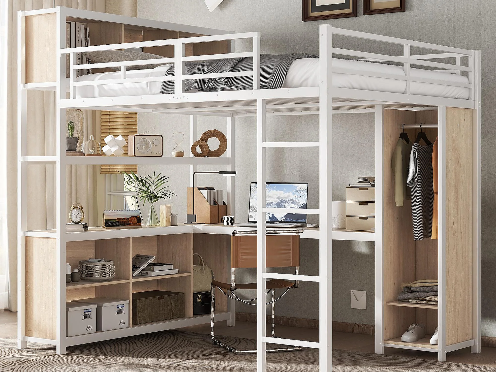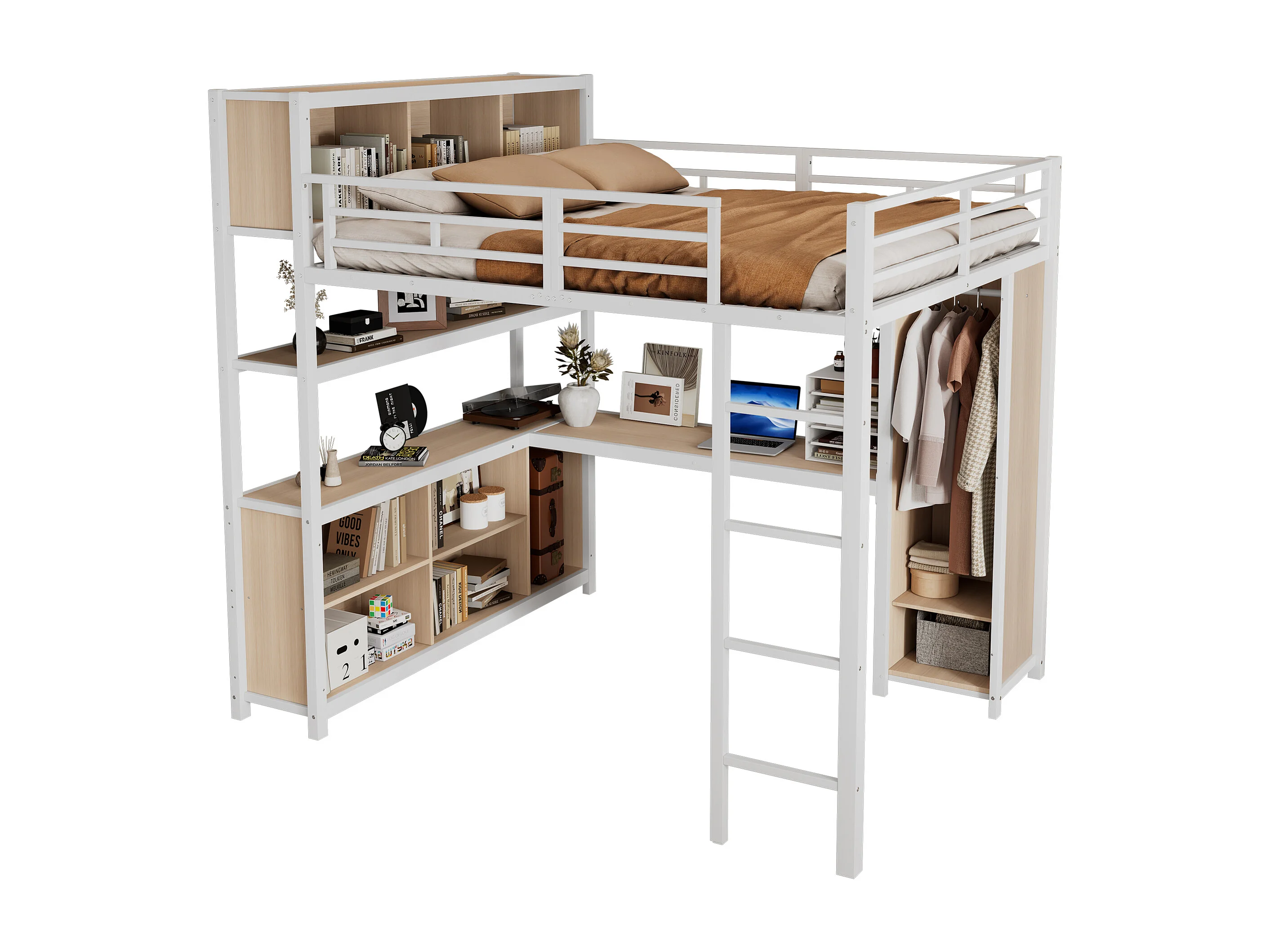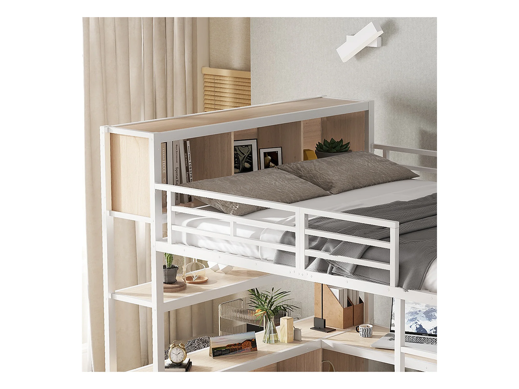 Letto mezzanina 140x200 cm - con scrivania e ripiano di archiviazione - con guardaroba - con scala - Metallo + pannelli di particelle - Bianco + Naturale