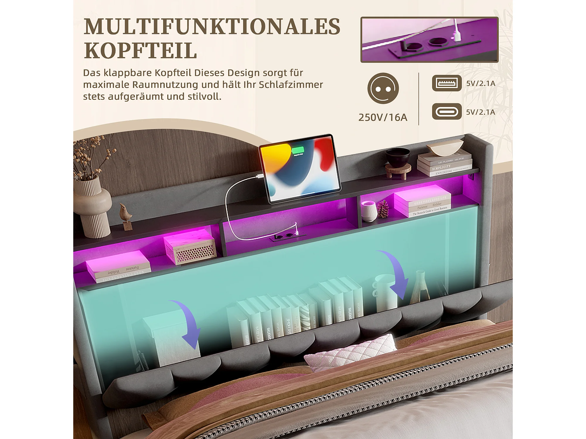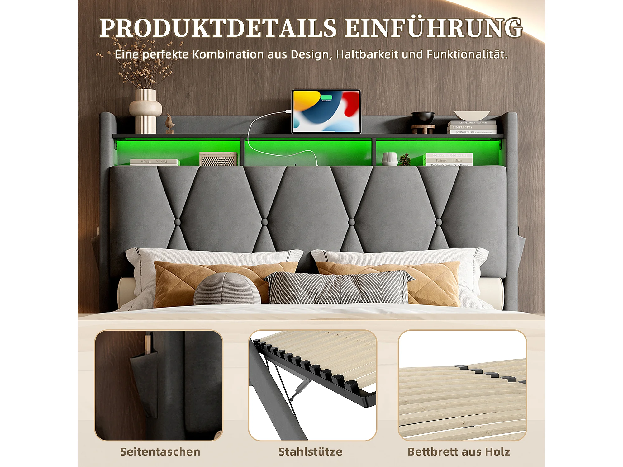 Letto matrimoniale con luce di lettura e funzione di ricarica USB, struttura con contenitore in velluto grigio (145x206x103cm)
