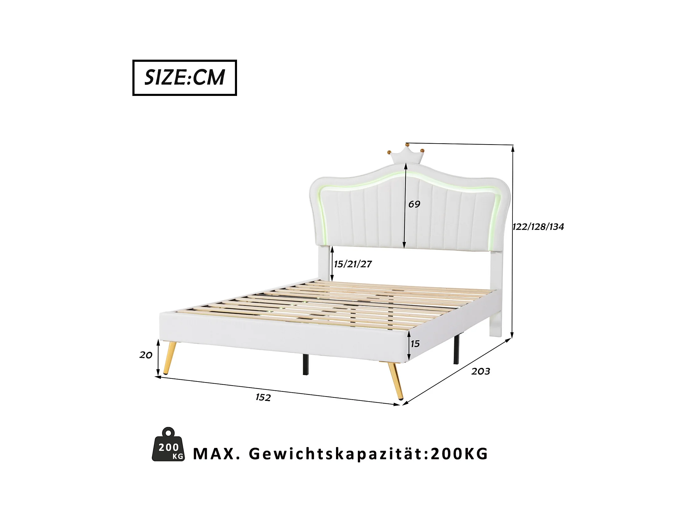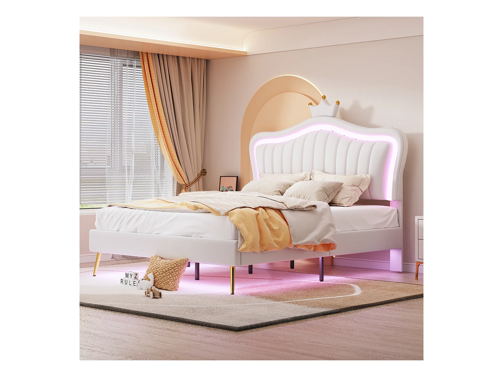 Letto per adulti 140 x 200 cm - Letto matrimoniale in similpelle con lampade a LED e rete a doghe e testiera a corona (acconciatura) per adolescente - Bianco