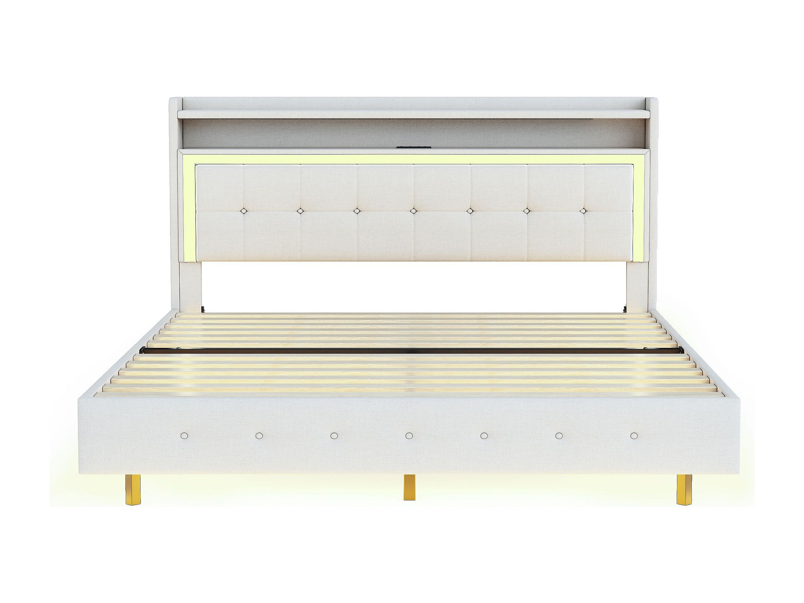 Letto matrimoniale 140x200 cm beige in lino, design sospeso con LED e USB, testiera con contenitore, senza materasso