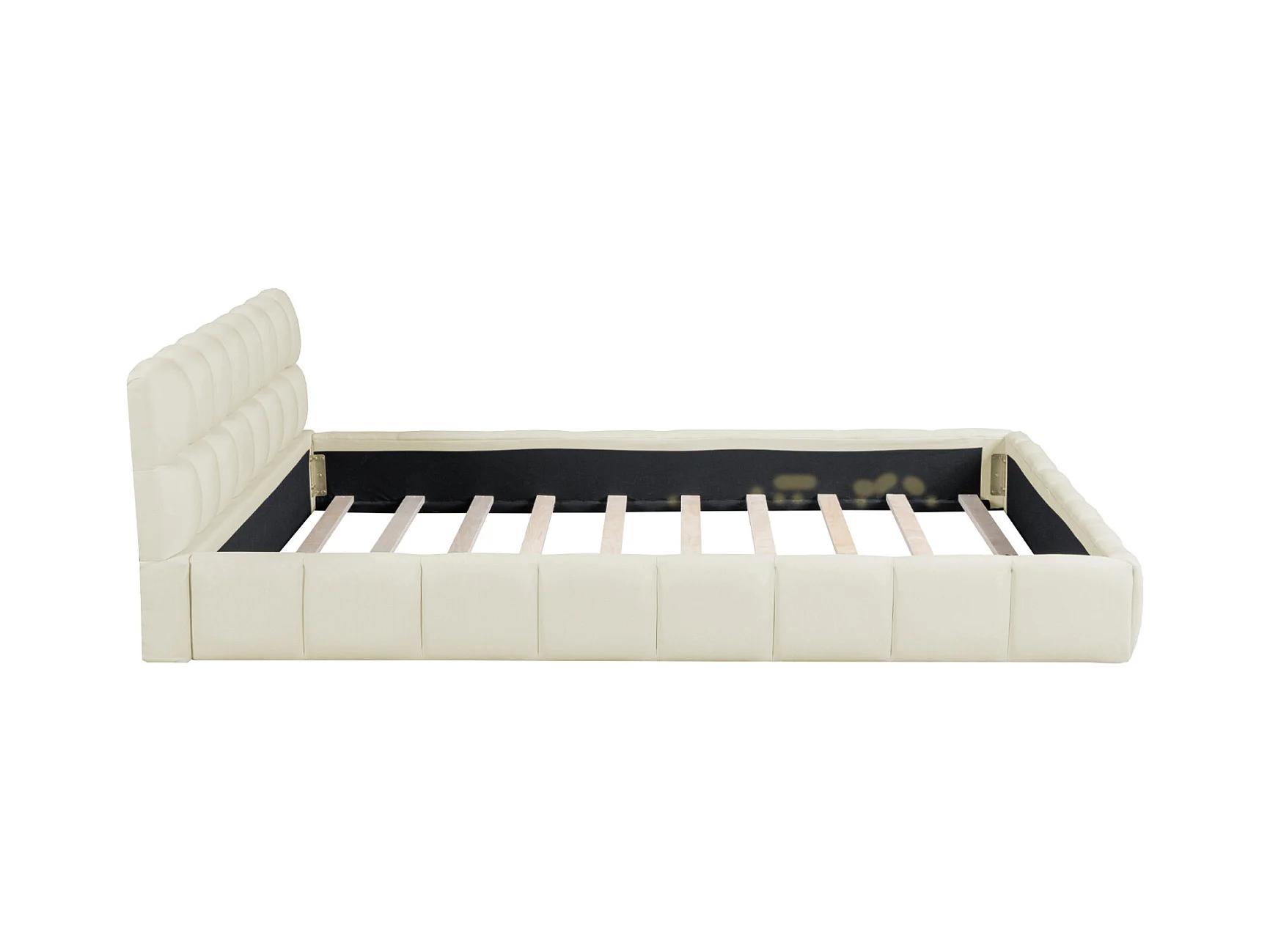 Letto matrimoniale 140x200 cm beige in lino, design sospeso con LED e USB, testiera con contenitore, senza materasso
