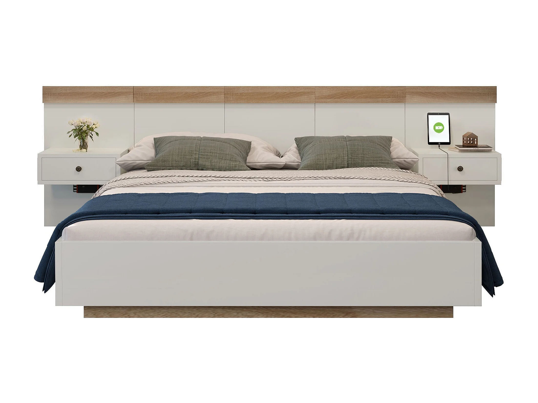 Letto matrimoniale 160 x 200 cm, con cassetti, luce di lettura, comodino, rovere + bianco