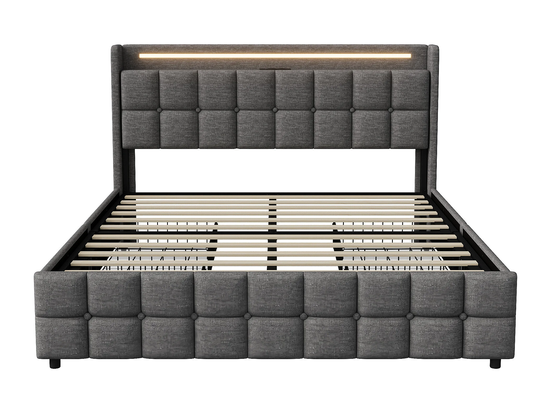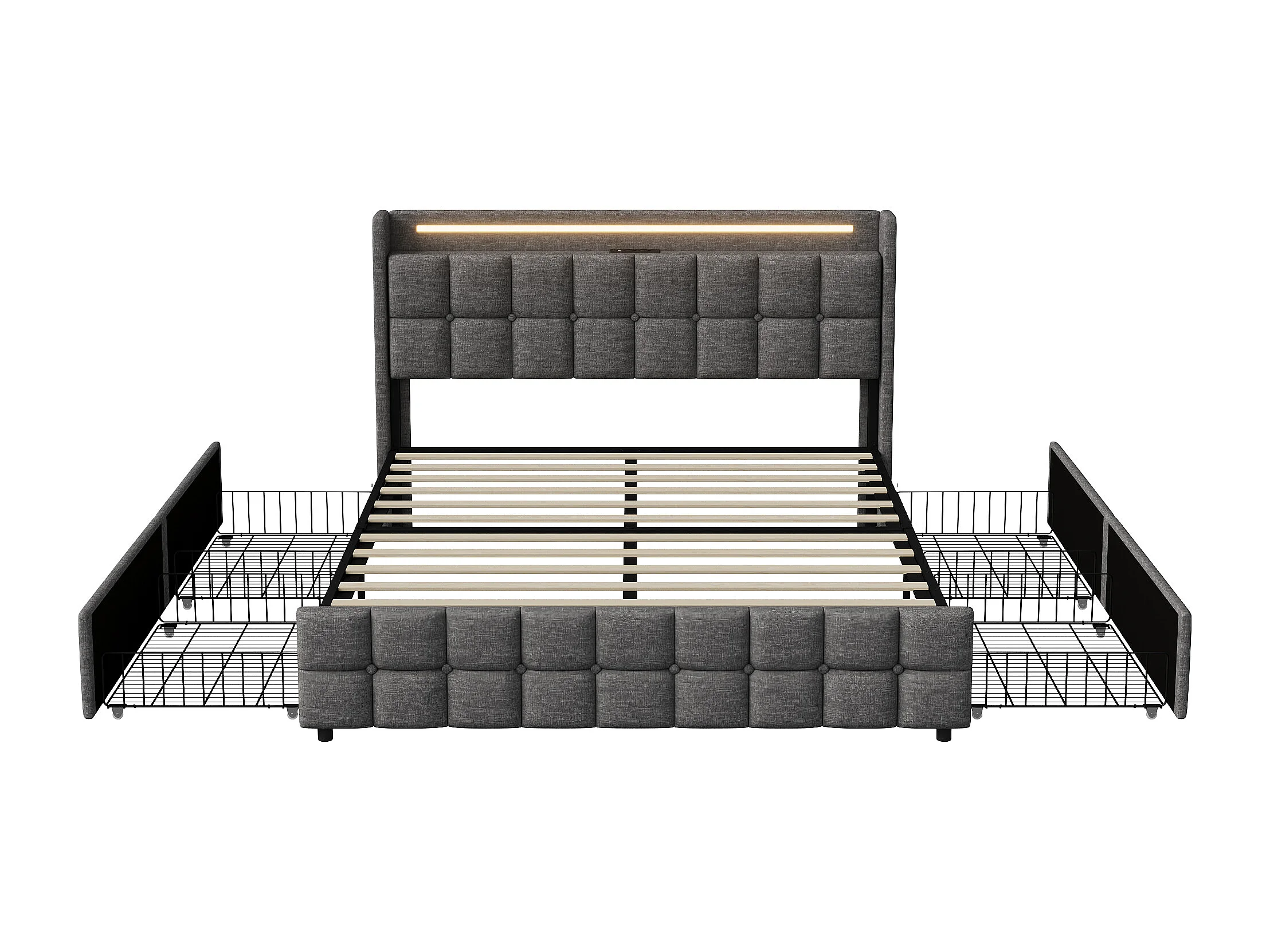 Letto per adulti 160x200 cm, letto matrimoniale imbottito con 4 cassetti e illuminazione a LED, porta USB e testiera, lino, grigio