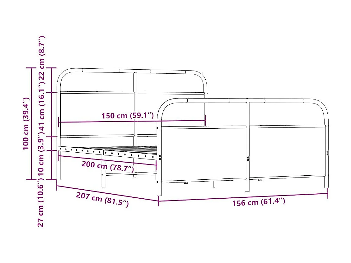 Letto per adulti | Letto matrimoniale | Giroletto senza Materaso in Metallo Rovere Fumo 150x200 cm