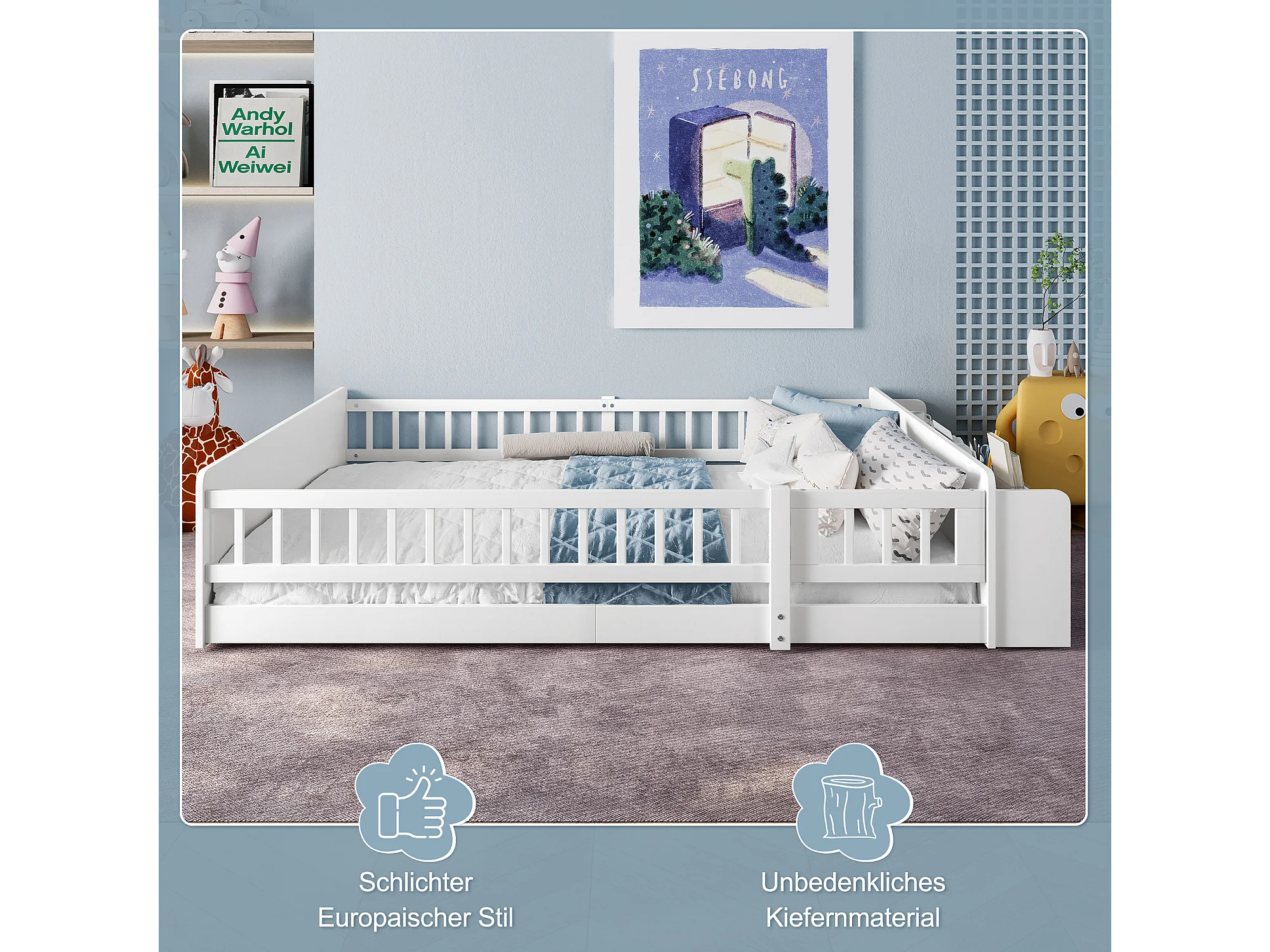 Letto per bambini 140x190 cm in pino, con vano contenitore, ripiani e porta blindata, bianco (213x145x45 cm)