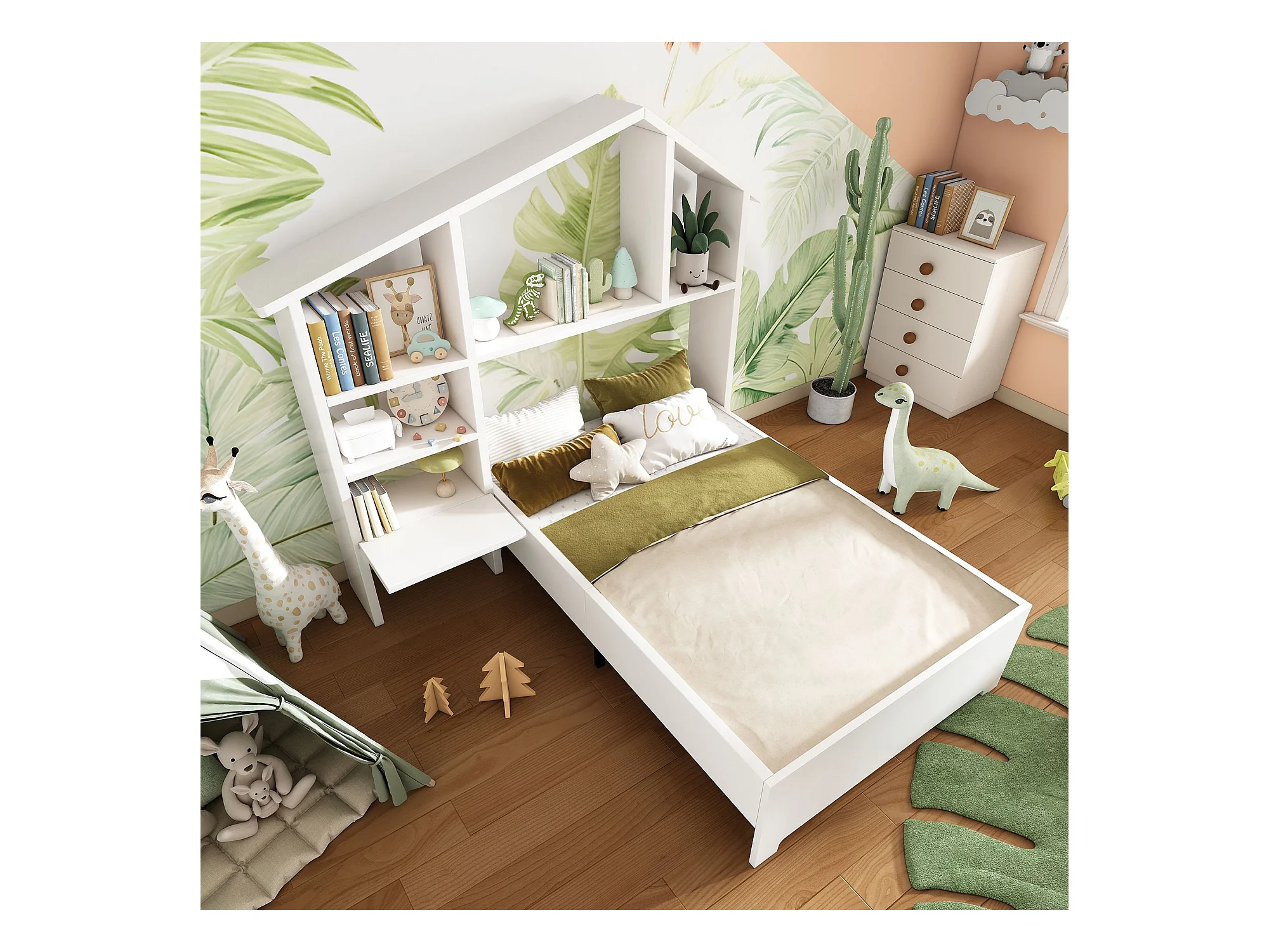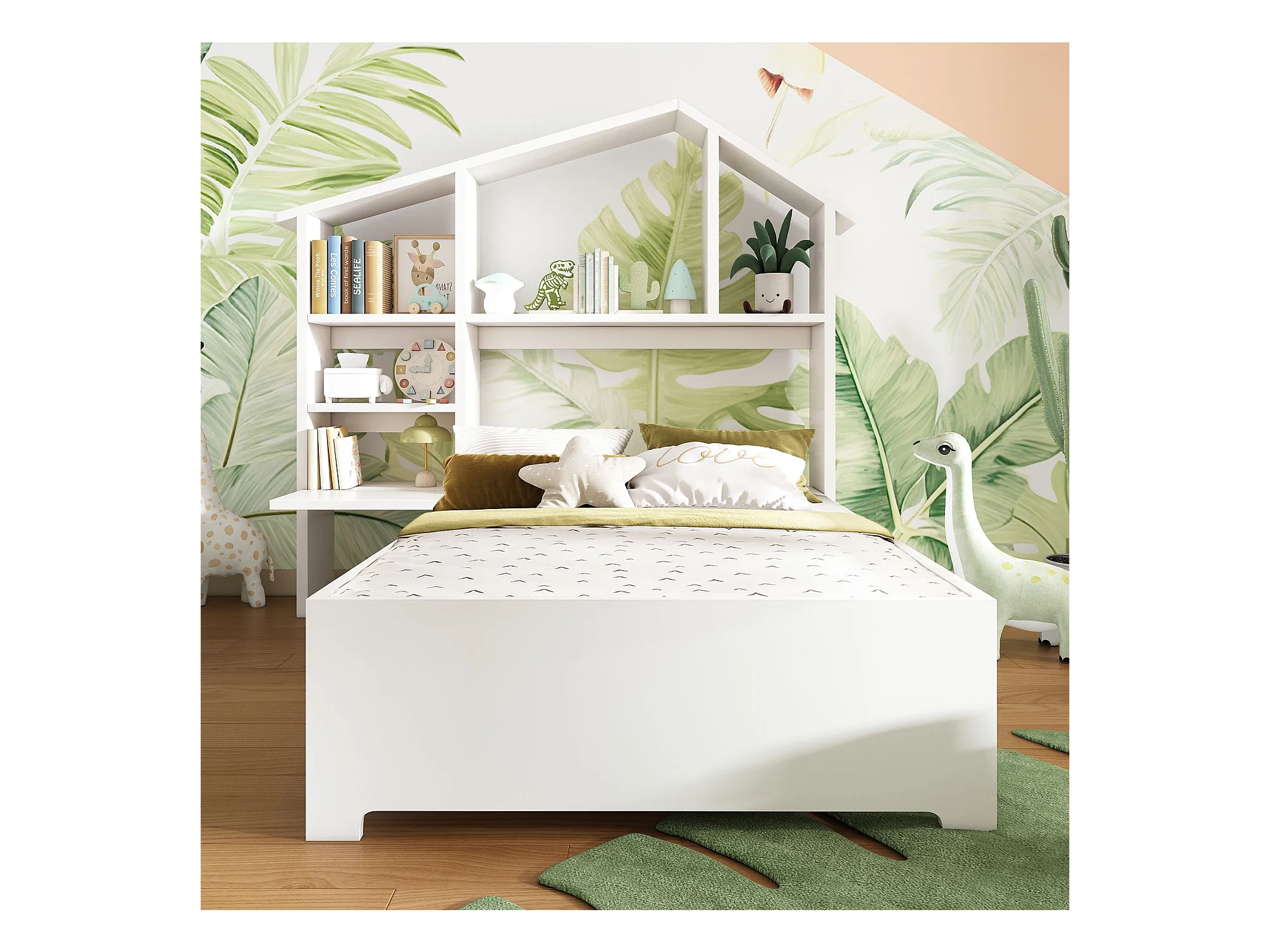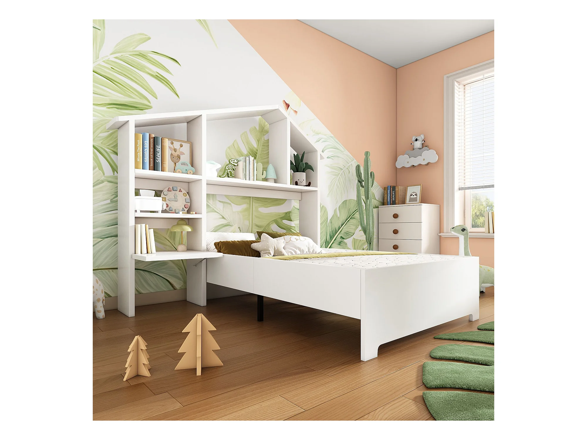 La libreria a capo del letto è suddivisa in diversi scomparti, in modo da poter riporre sia i giocattoli che i libri del bambino. La libreria è dotata di un dispositivo antiribaltamento, per cui non dovrete preoccuparvi di problemi di sicurezza.