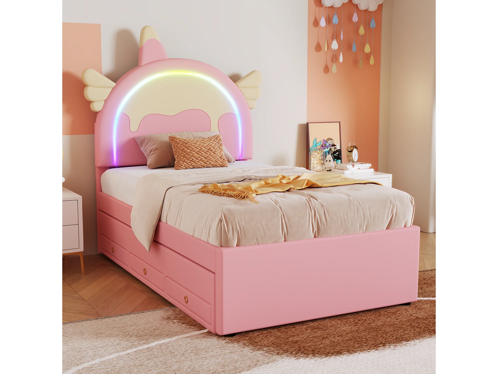 Letto per bambini 90x200 cm, a forma di unicorno, con letto estraibile, PU, rosa (203x94x135,5 cm)