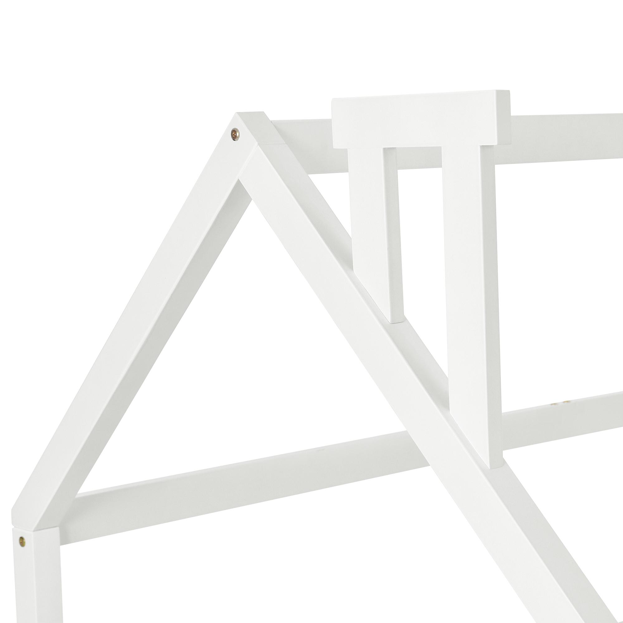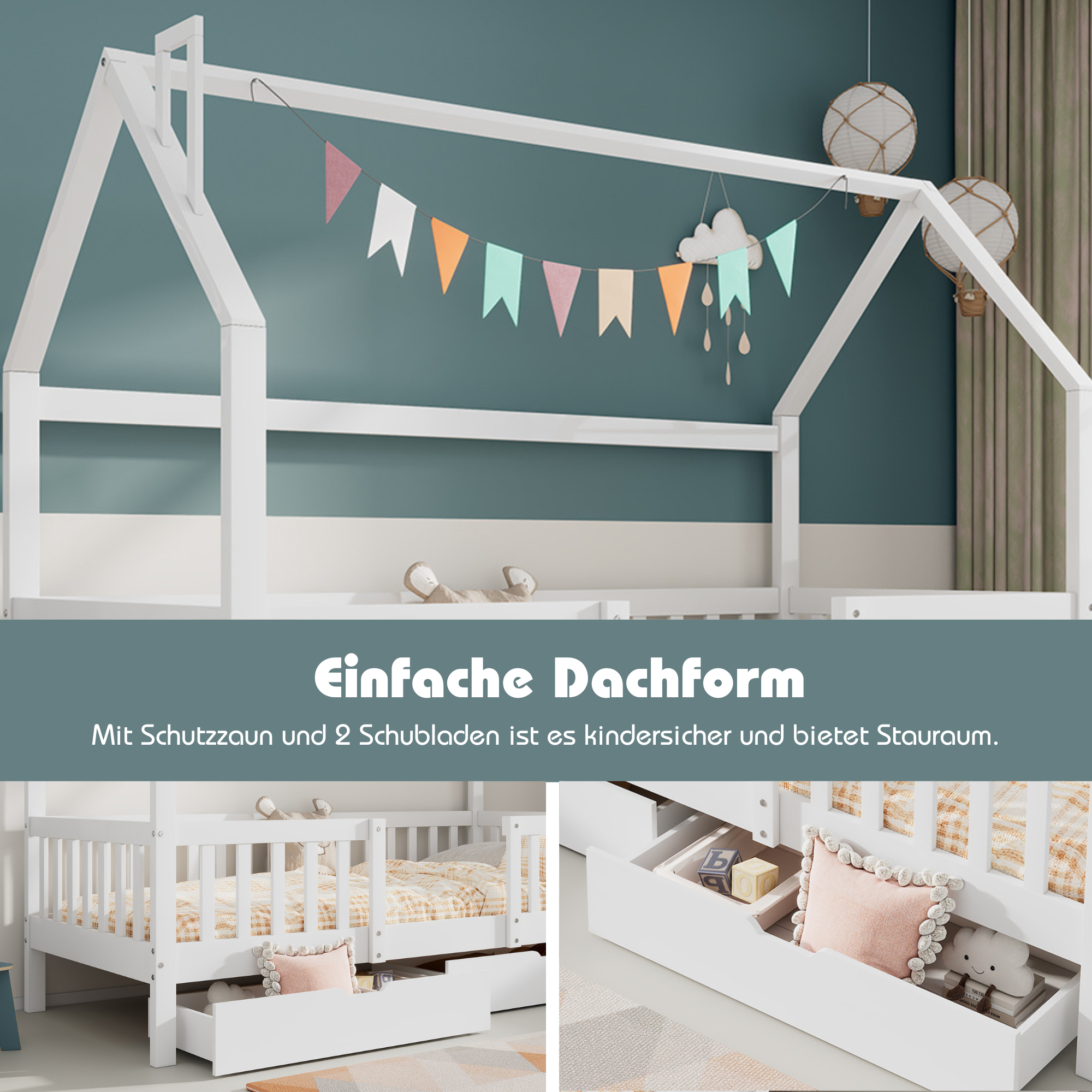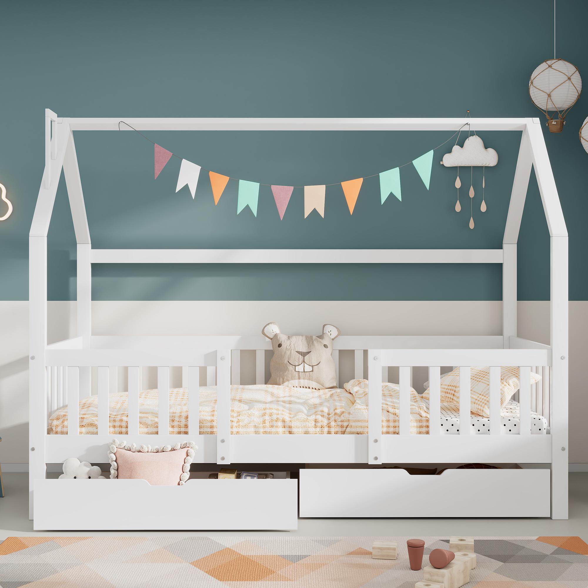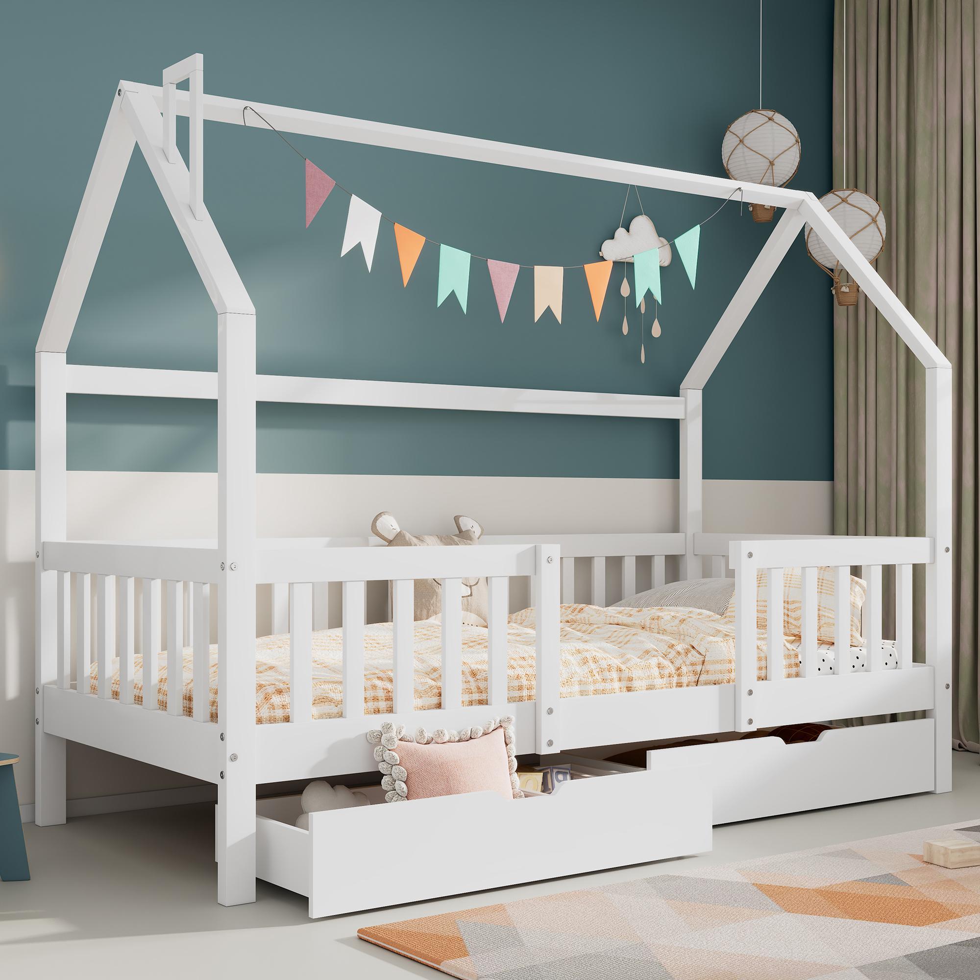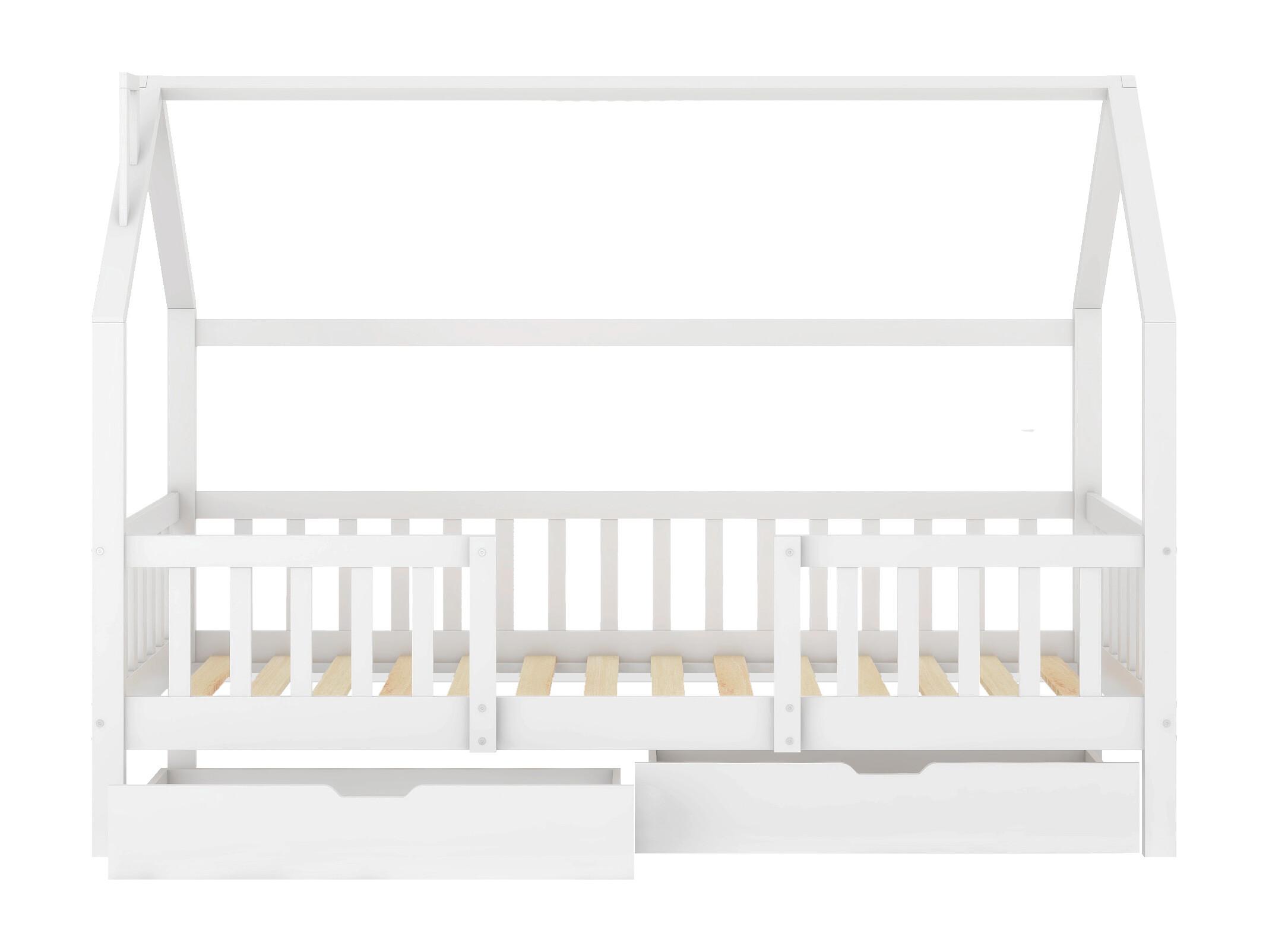 Letto per bambini a forma di casa, con contenitore e sponde di sicurezza, in legno di pino, bianco (200x90 cm)
