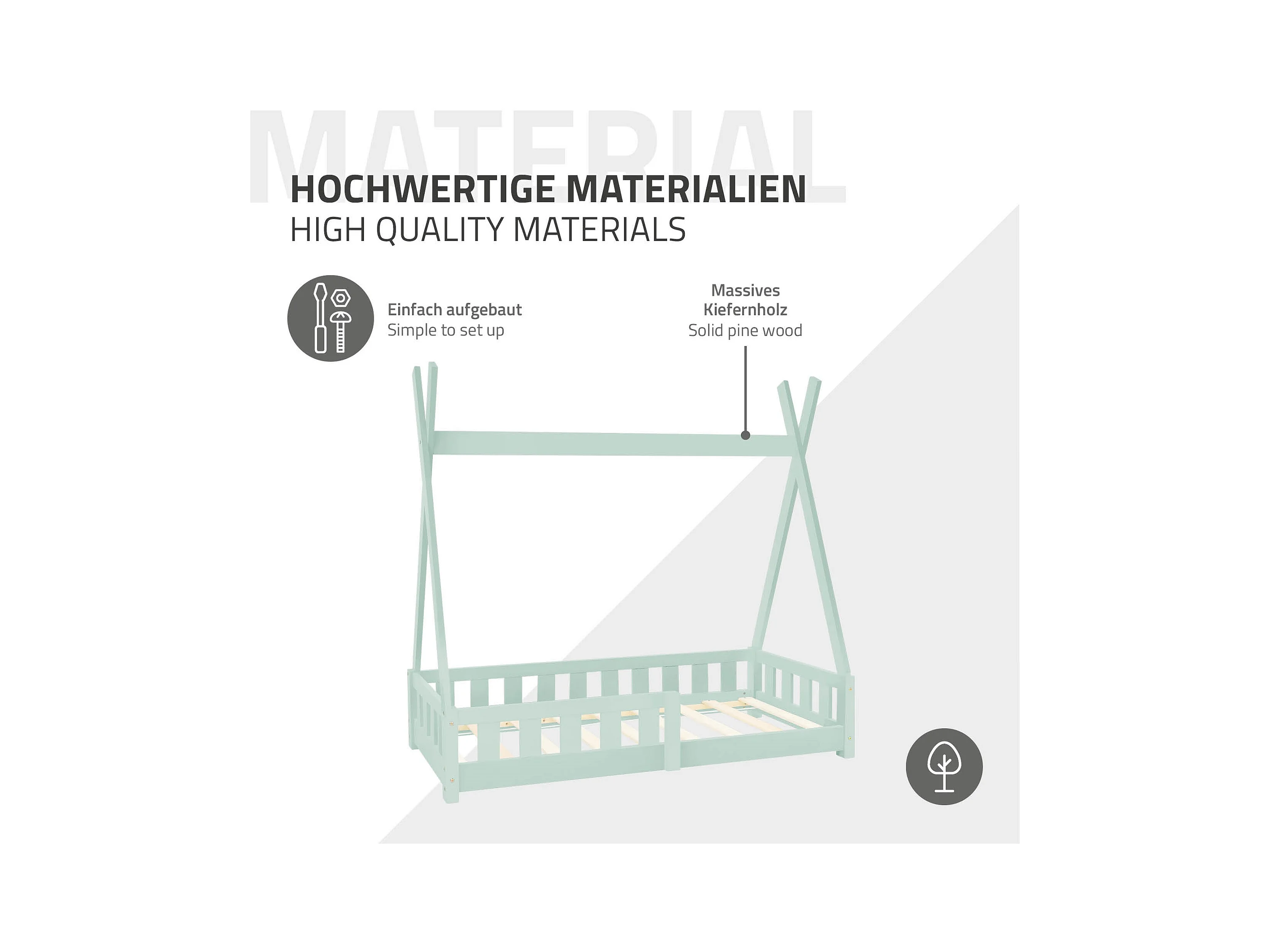 ML-Design Letto per bambini a forma di tenda 70x140 cm verde menta in pino massiccio con sponde stile montessori e materasso in schiuma fredda