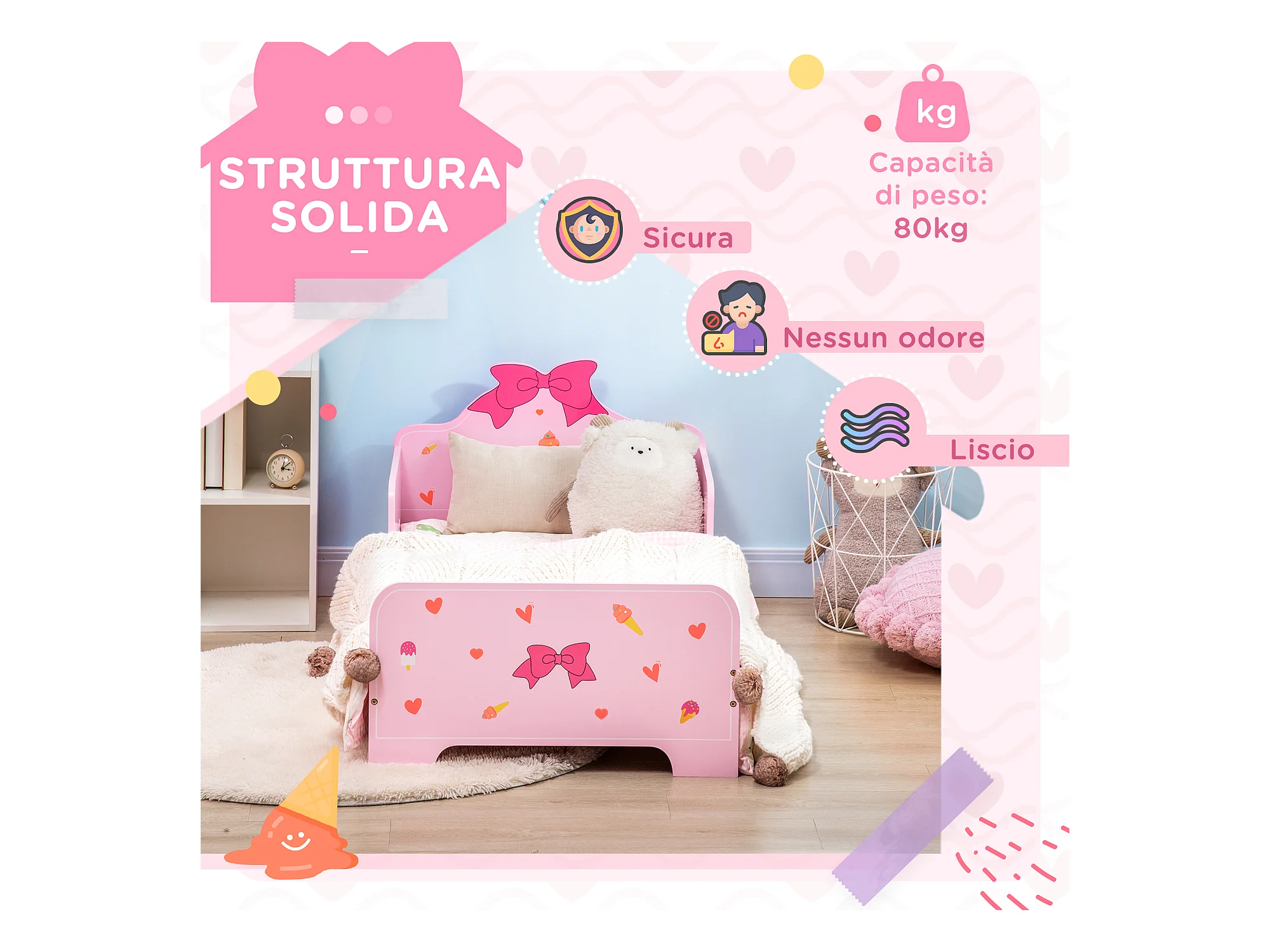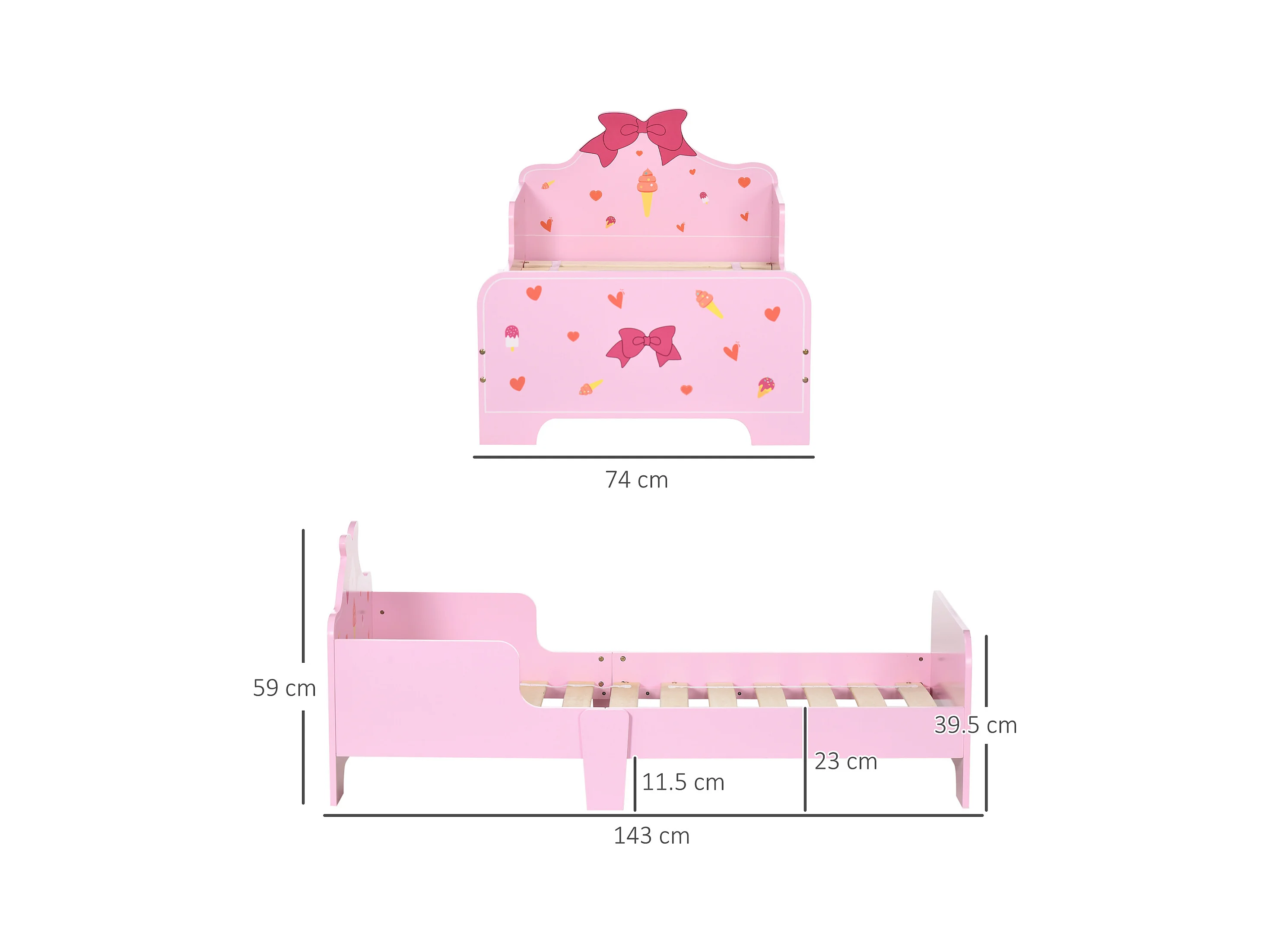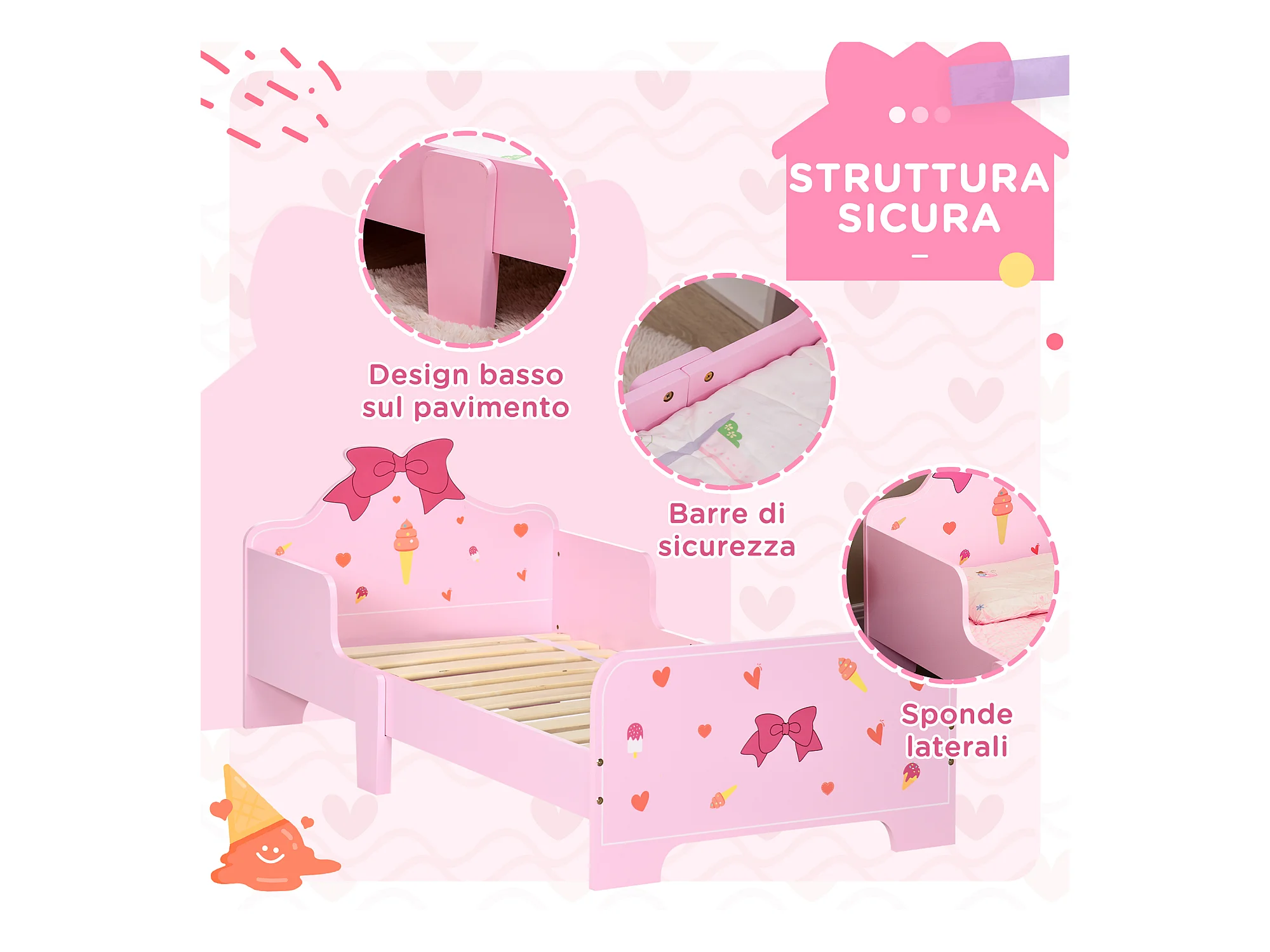 Letto per bambini con sponde e fantasia a fiocchi età 3-6 anni rosa