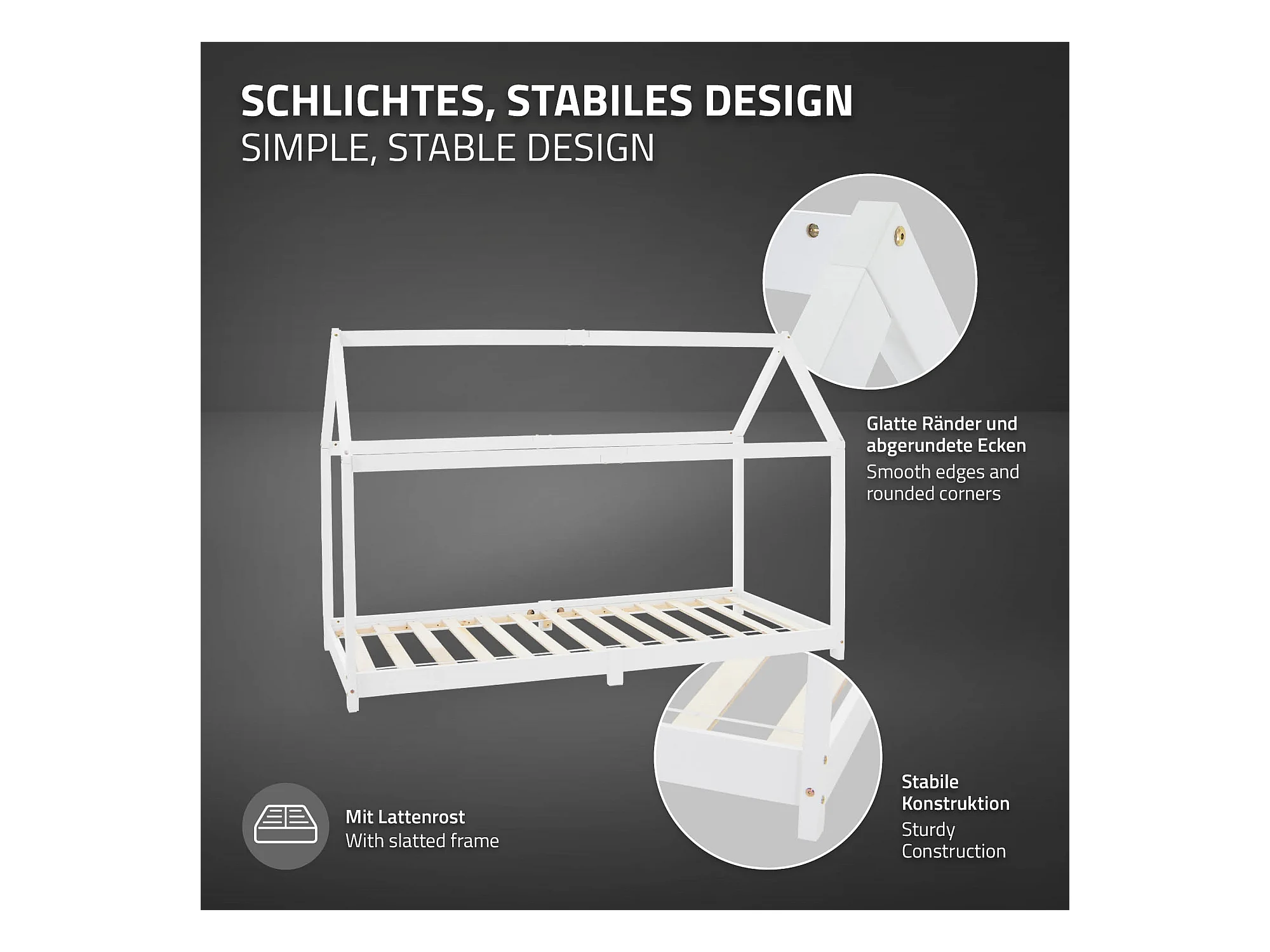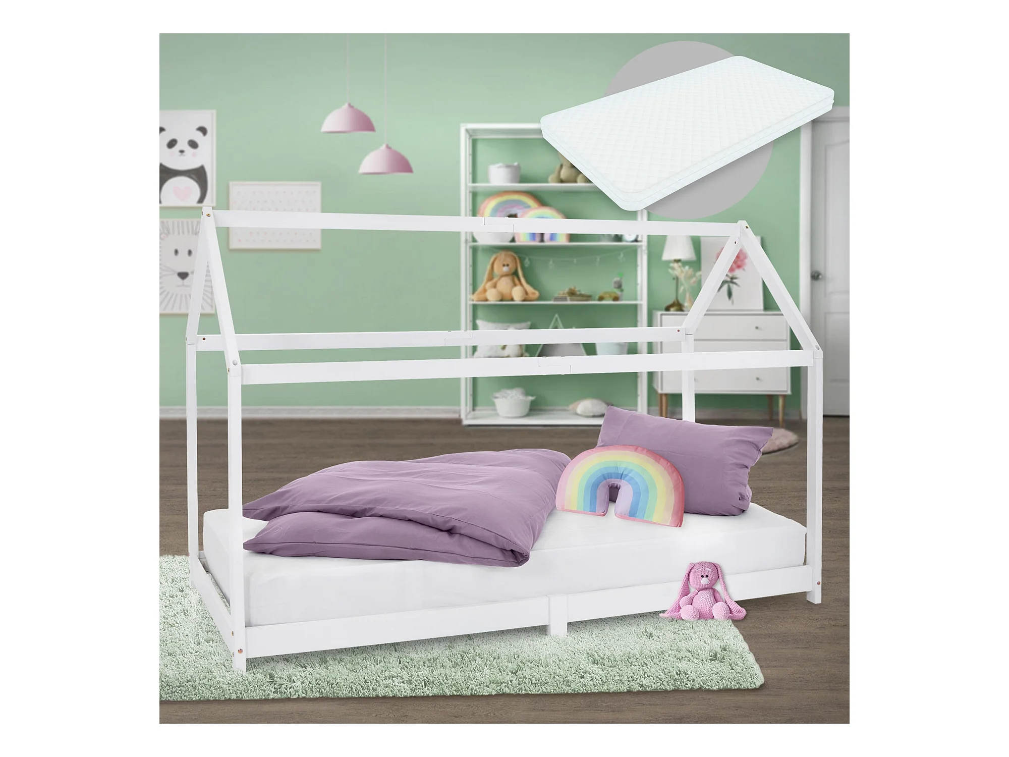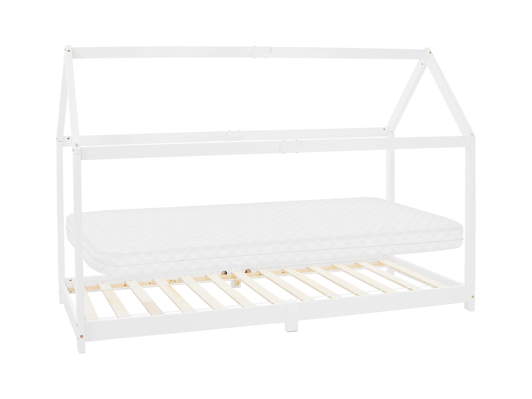 ML-Design Lettino casetta per bambini 90x200 cm bianco in pino massiccio con tetto, rete a doghe e materasso in schiuma fredda stile montessori