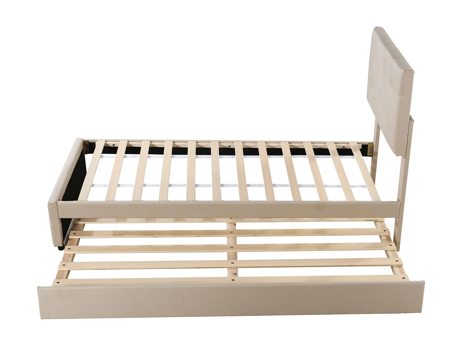 Letto per bambini estensibile 90x200 cm in tessuto beige, testiera regolabile, morbida imbottitura in lino, ideale per la camera dei ragazzi o degli ospiti