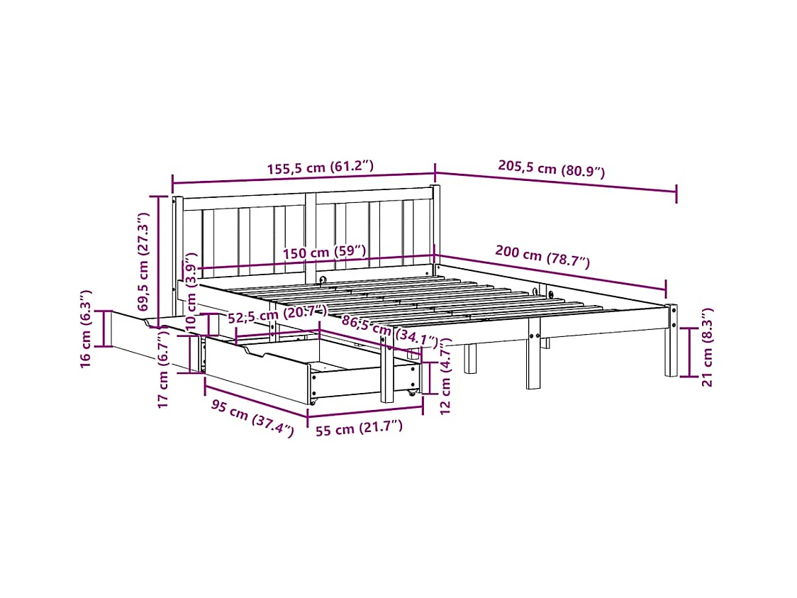 Letto senza Materasso 150x200 cm in Legno Massello di Pino