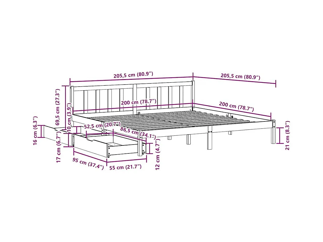 Letto senza Materasso 200x200 cm in Legno Massello di Pino