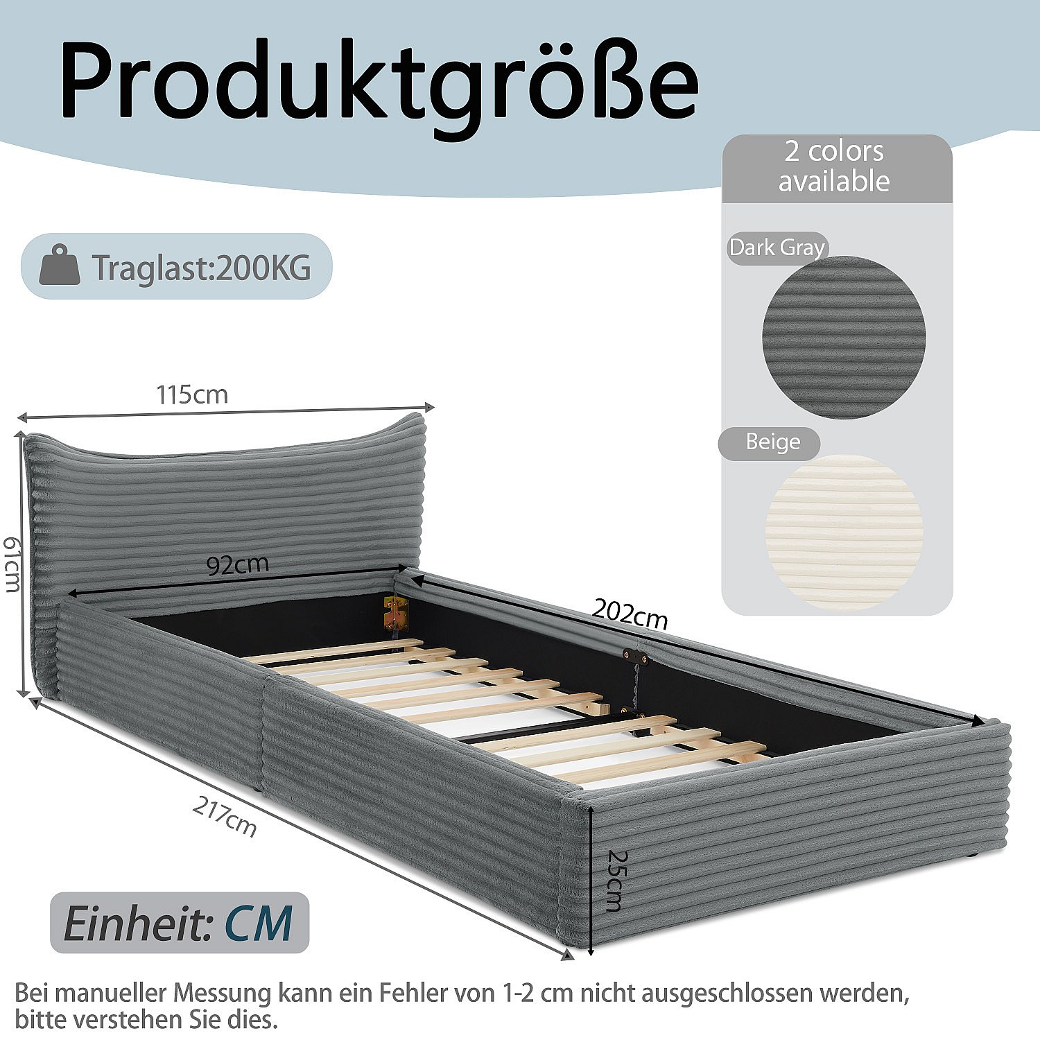 Letto singolo 90x200 cm con rete a doghe e testiera regolabile – struttura in lino (materasso non incluso)