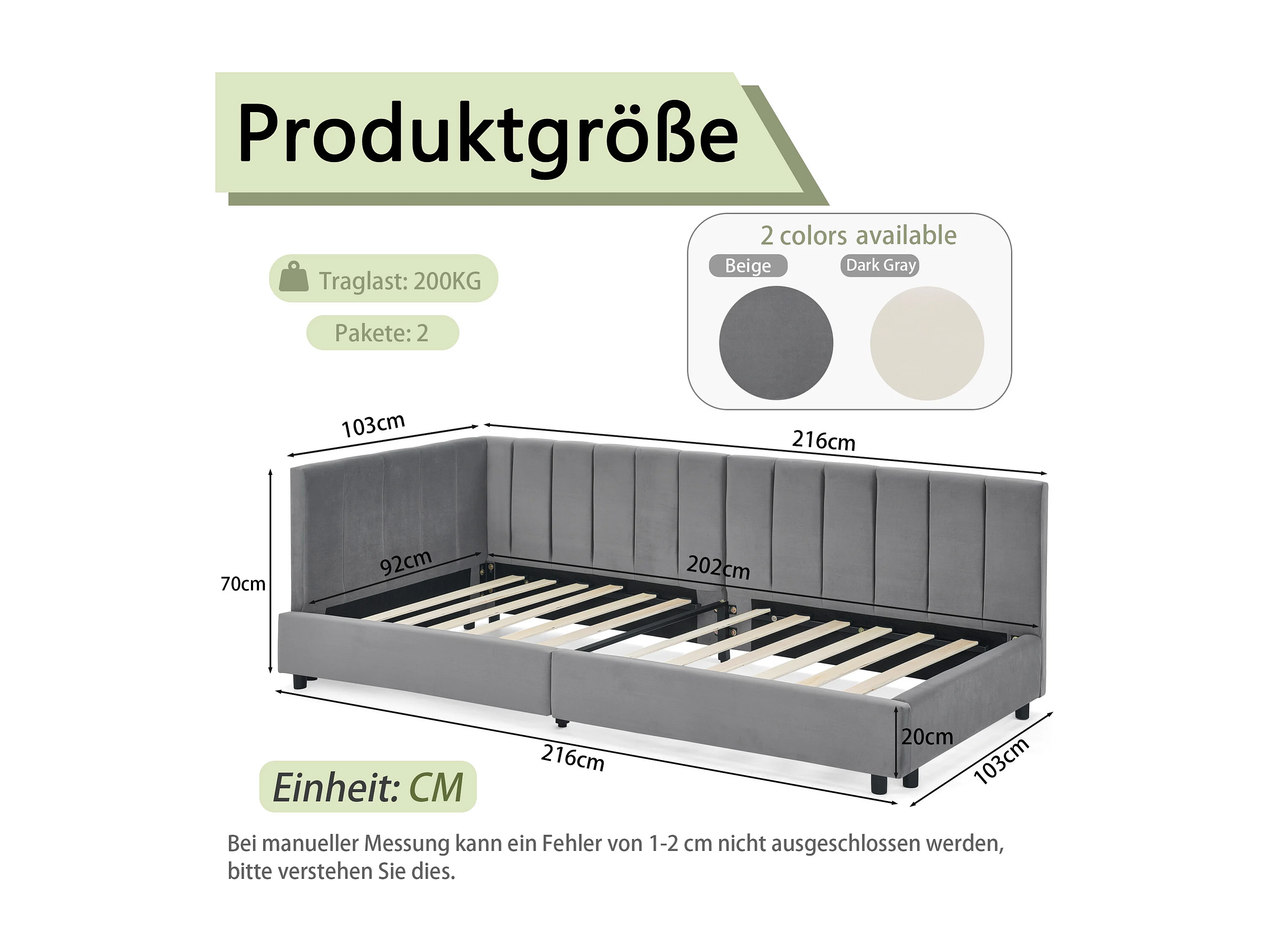 Divano letto imbottito in velluto 90x200 cm - con 2 cassetti grandi e rete a doghe - Grigio