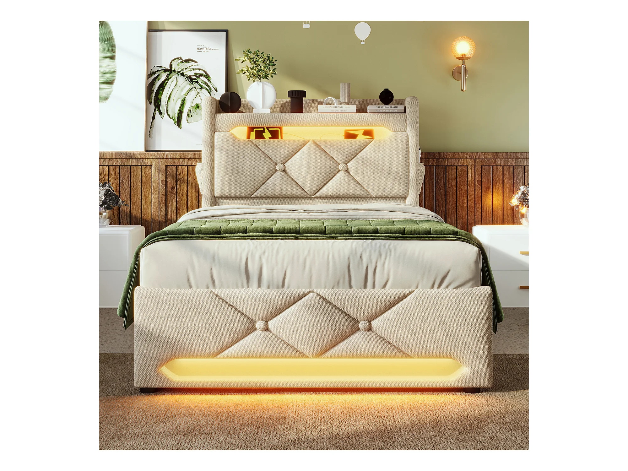 Letto singolo 90\200 cm, beige cotone, con contenitore idraulico, testiera USB Type-C e funzione LED su 3 lati (senza materasso)