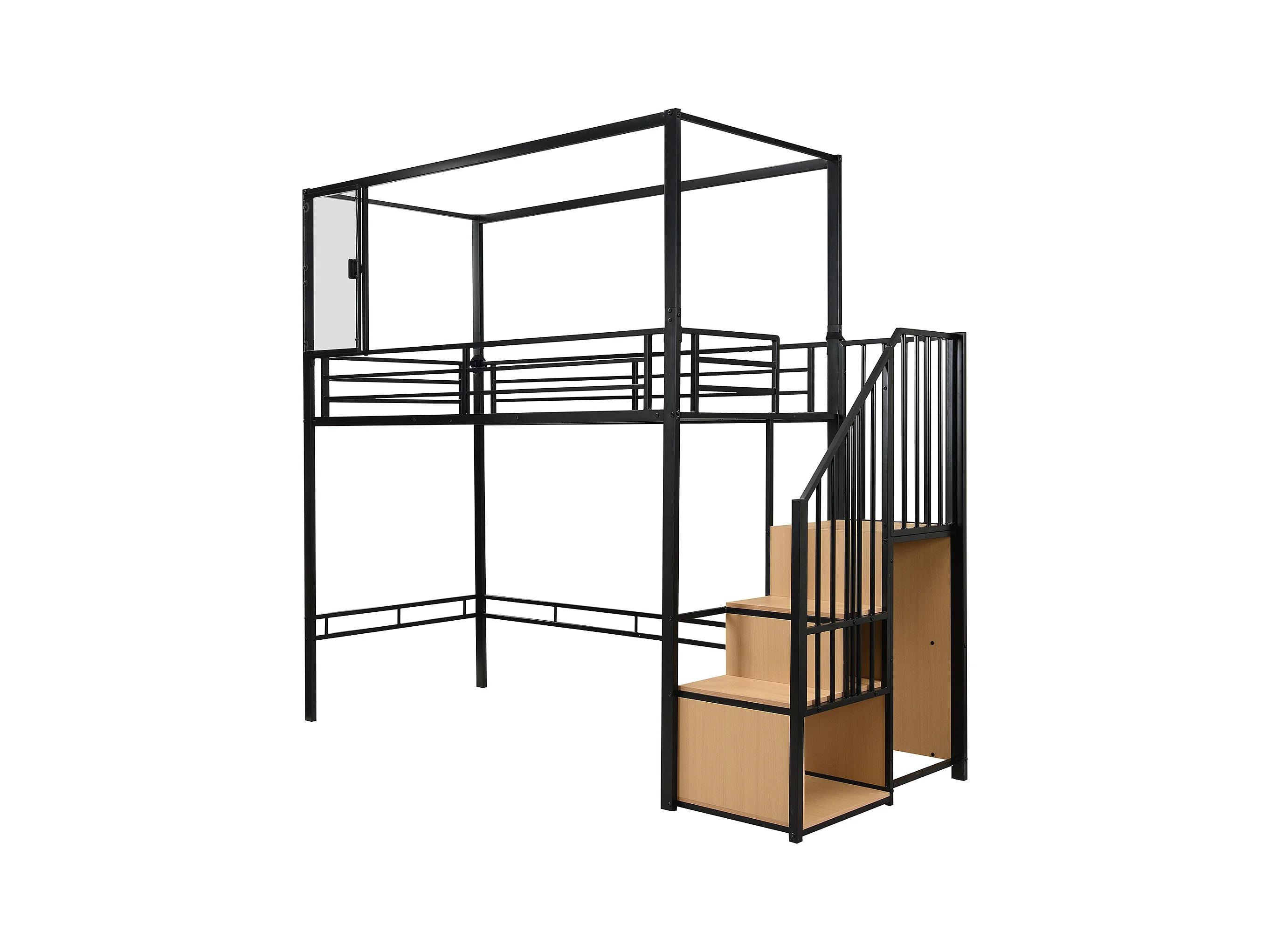 Letto singolo a soppalco 90x200cm con armadio, finestra e scaletta portaoggetti, ferro + MDF, nero + naturale (senza materasso)