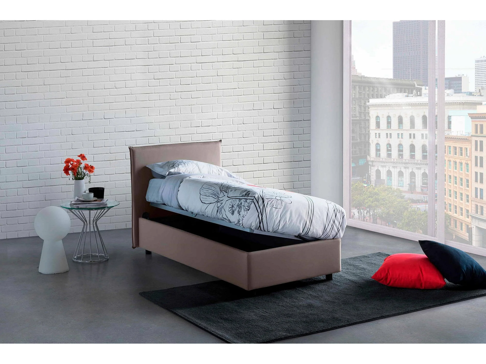 Letto singolo Carola, Letto contenitore con rivestimento in tessuto, 100% Made in Italy, Apertura laterale, con materasso Cm 80x190 incluso, Tortora