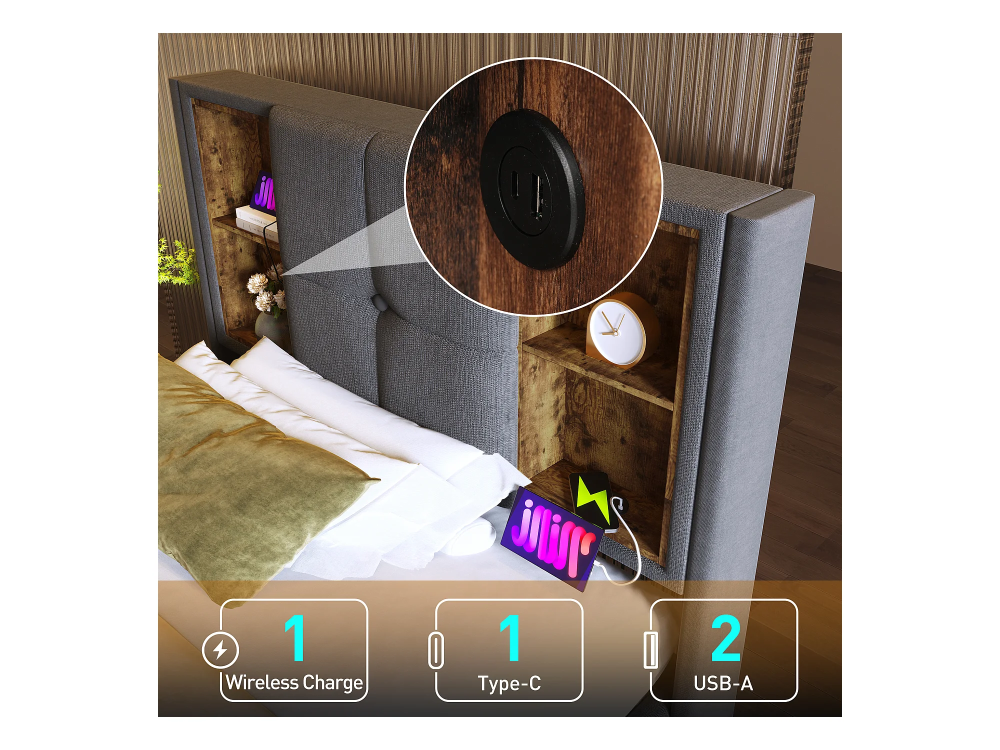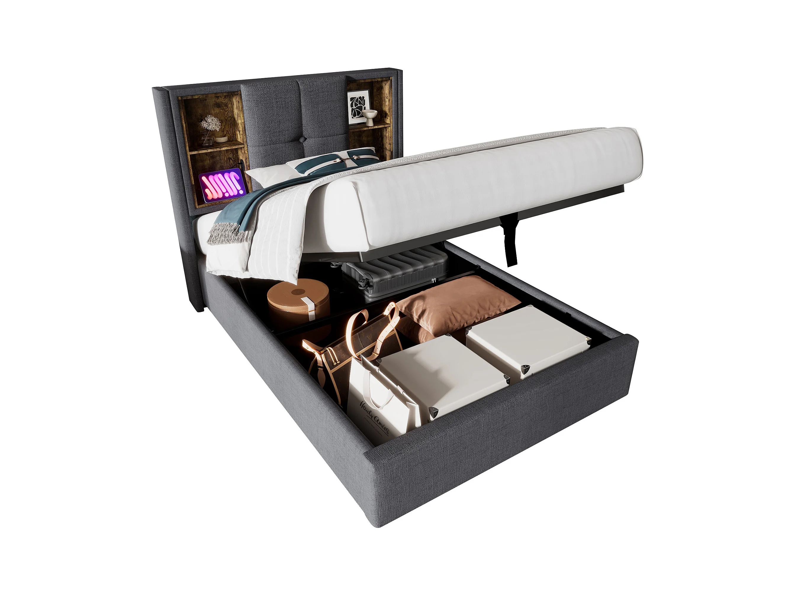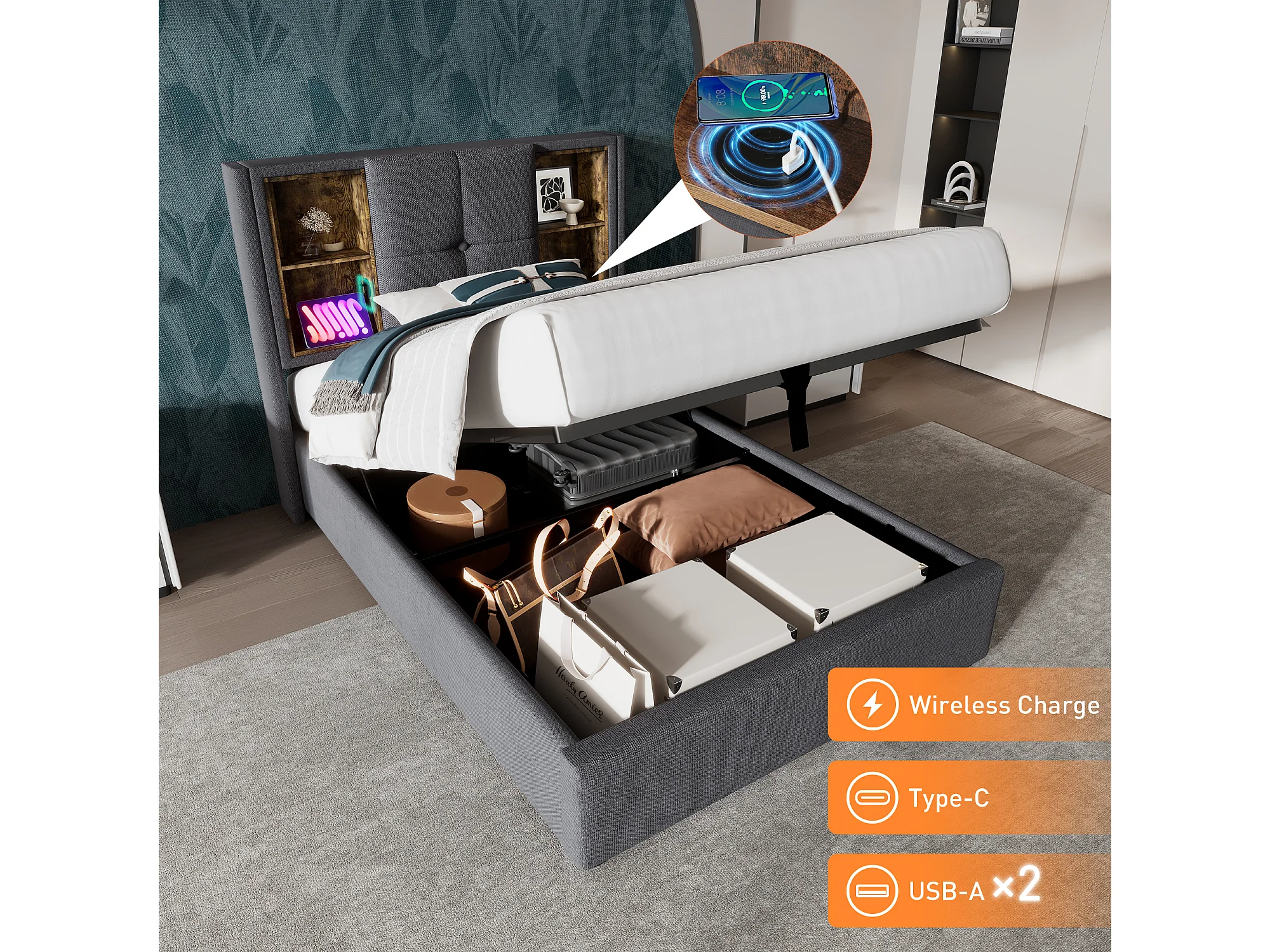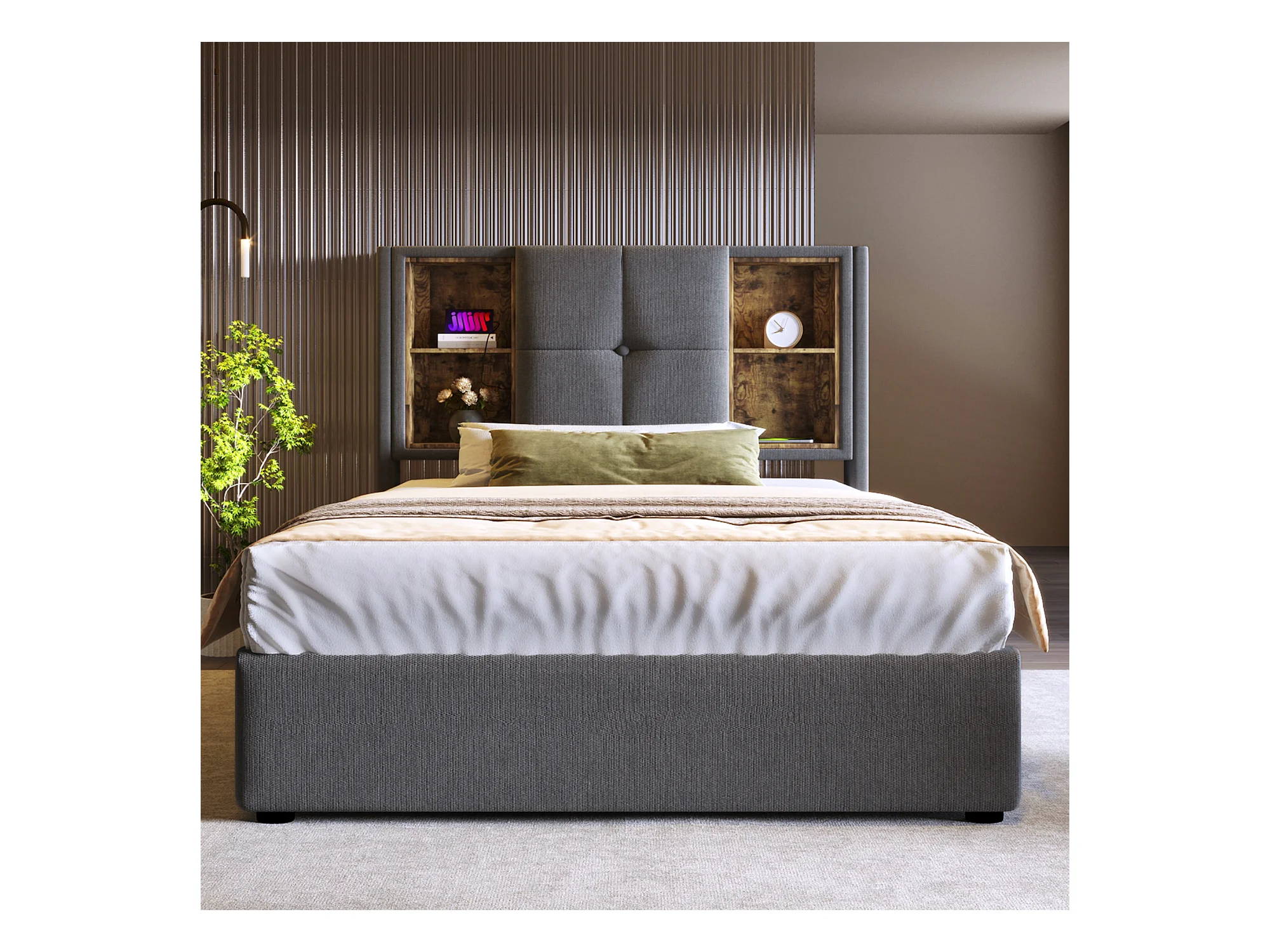 Letto singolo con caricabatterie wireless USB-C, struttura imbottita in cotone grigio, contenitore integrato, 90x200 cm (206x95x100,5 cm)