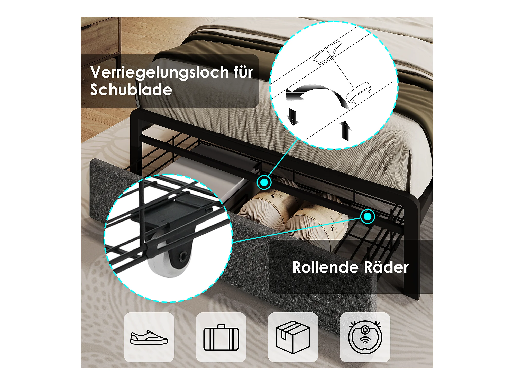 Letto matrimoniale con 4 cassetti e presa USB-C, base in legno, lino grigio (143x204x92-104cm)