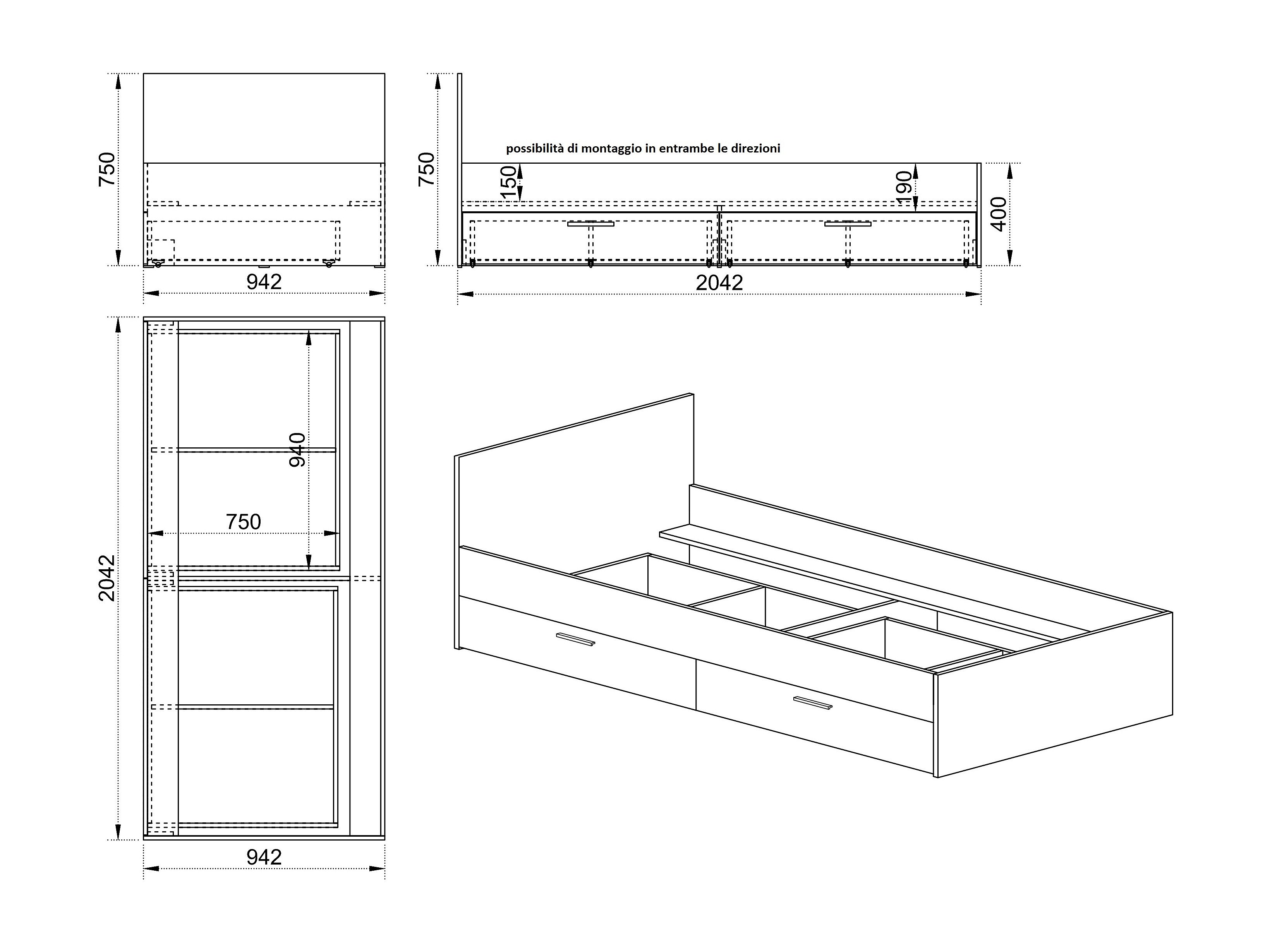 Letto singolo effetto legno e antracite con cassetti 90x200 effetto legno e antracite LI35