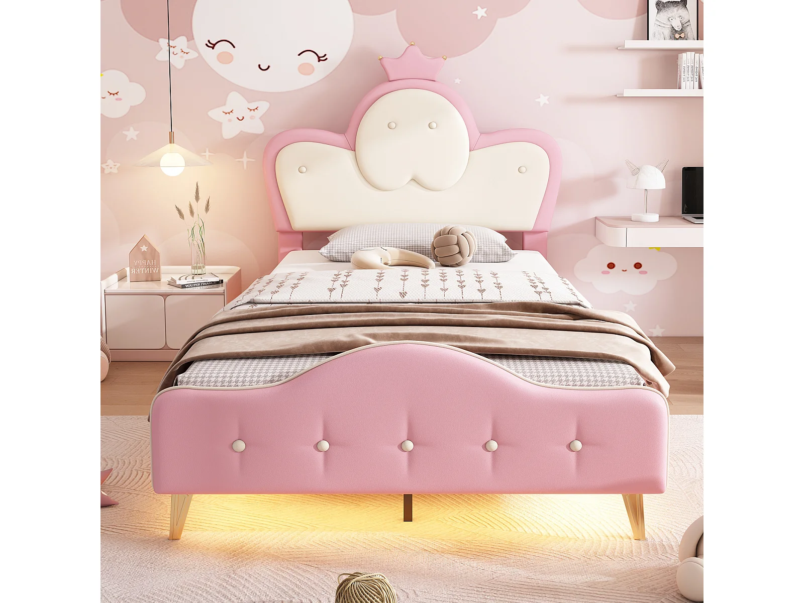 Letto imbottito per bambini con luci a LED, 90 x 200 cm, rete a doghe e testiera regolabile, PU, rosa