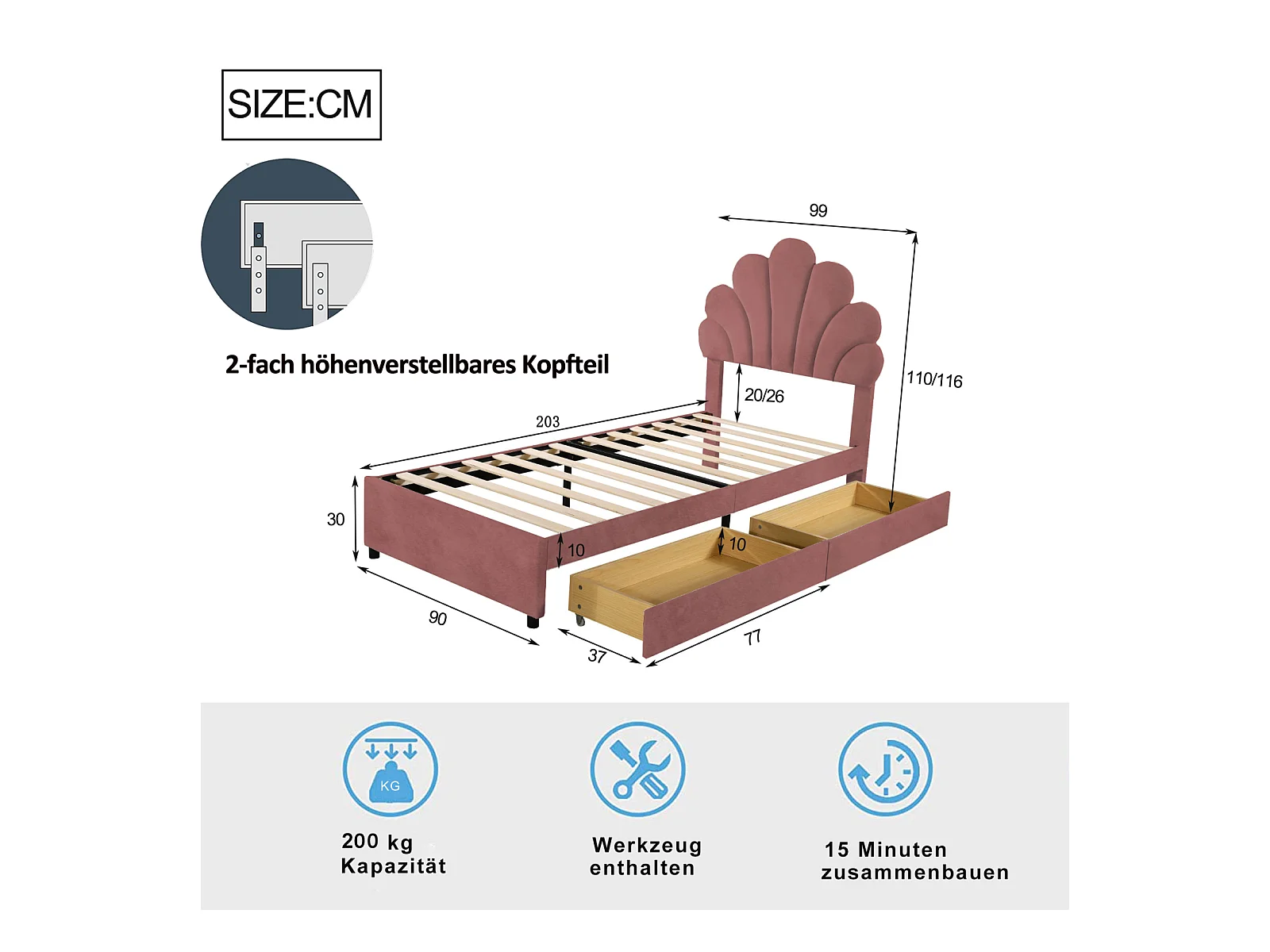 Letto contenitore 90 x 200 cm con testiera fiorata regolabile - tessuto in velluto - rosa (senza materasso)