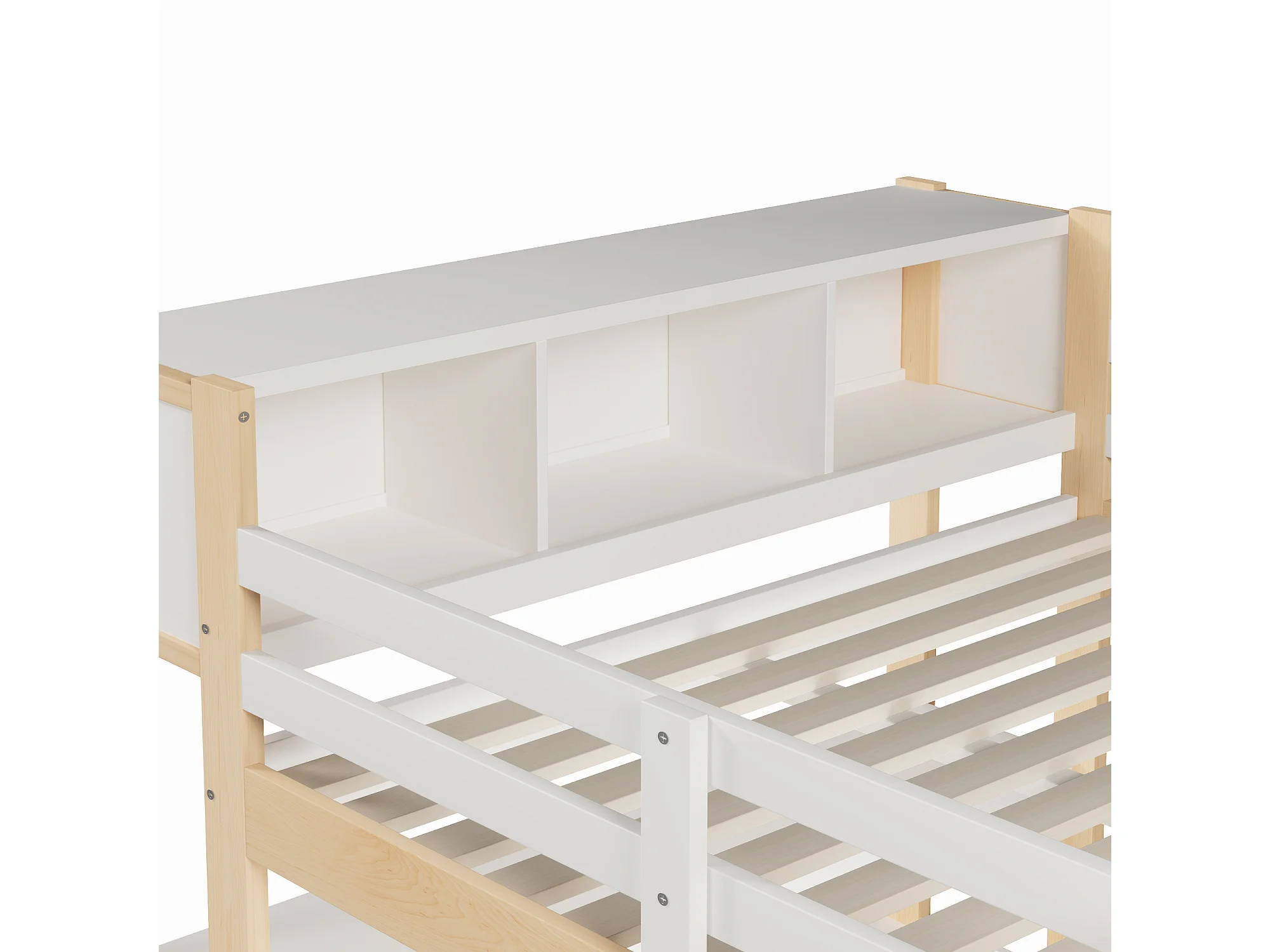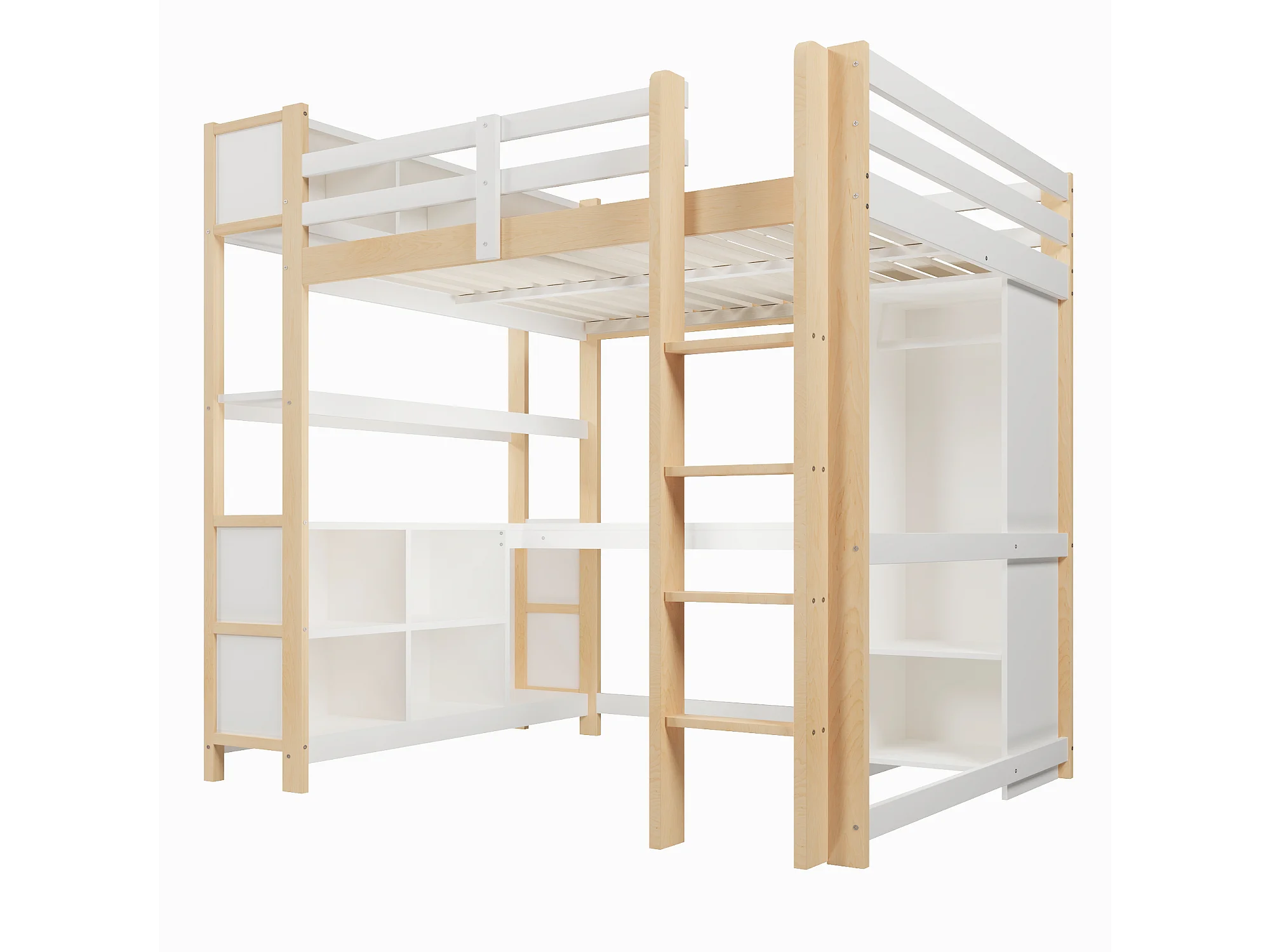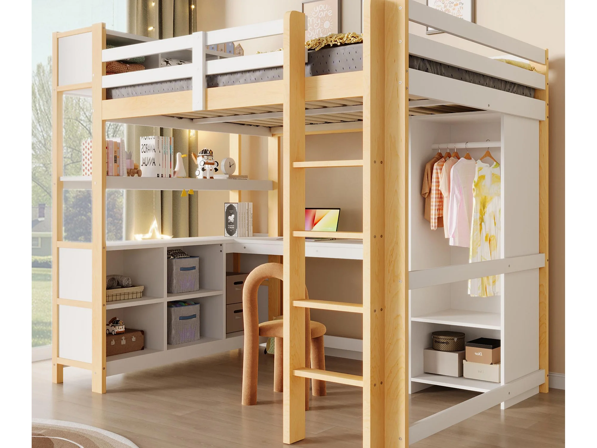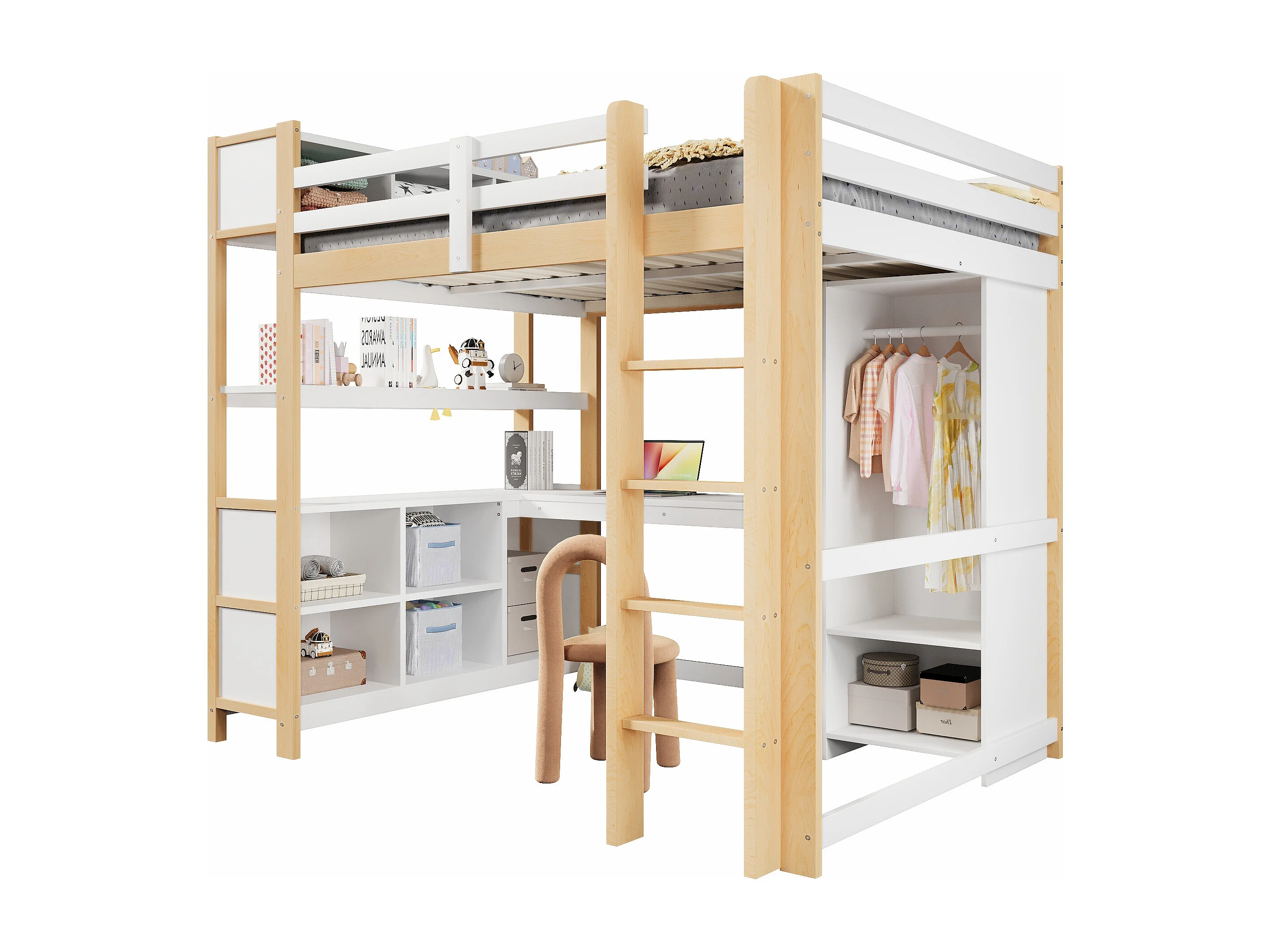 Letto soppalcato 140x200 cm - con riporre - con scrivania e appendiabiti - Naturale​ (materasso non incluso)