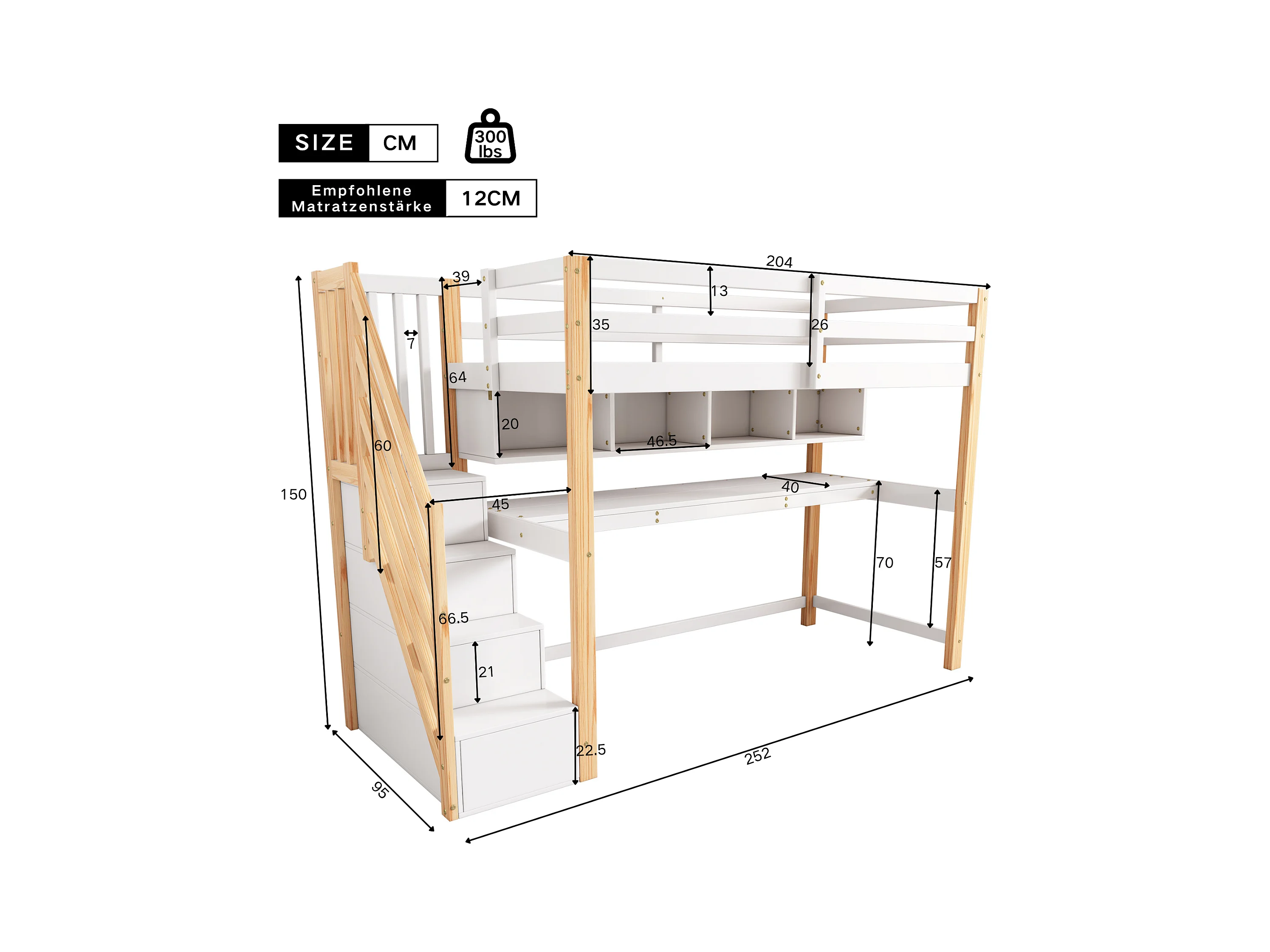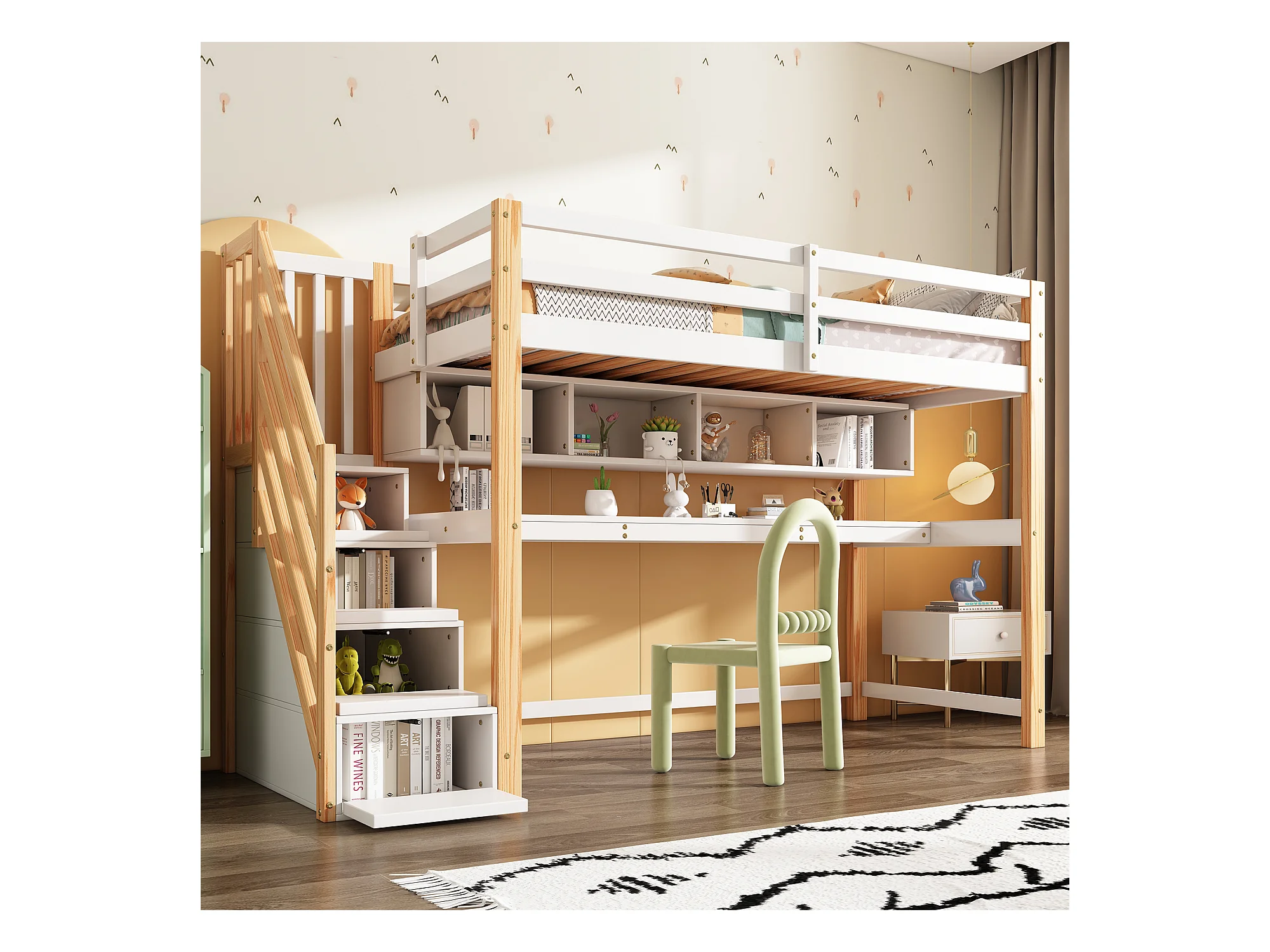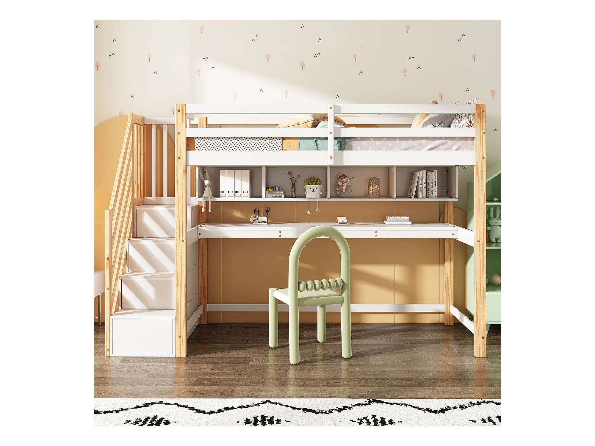 Letto a soppalco 90 x 200 cm con scrivania, ripiani e 4 cassetti - legno di pino - colori: naturale e bianco