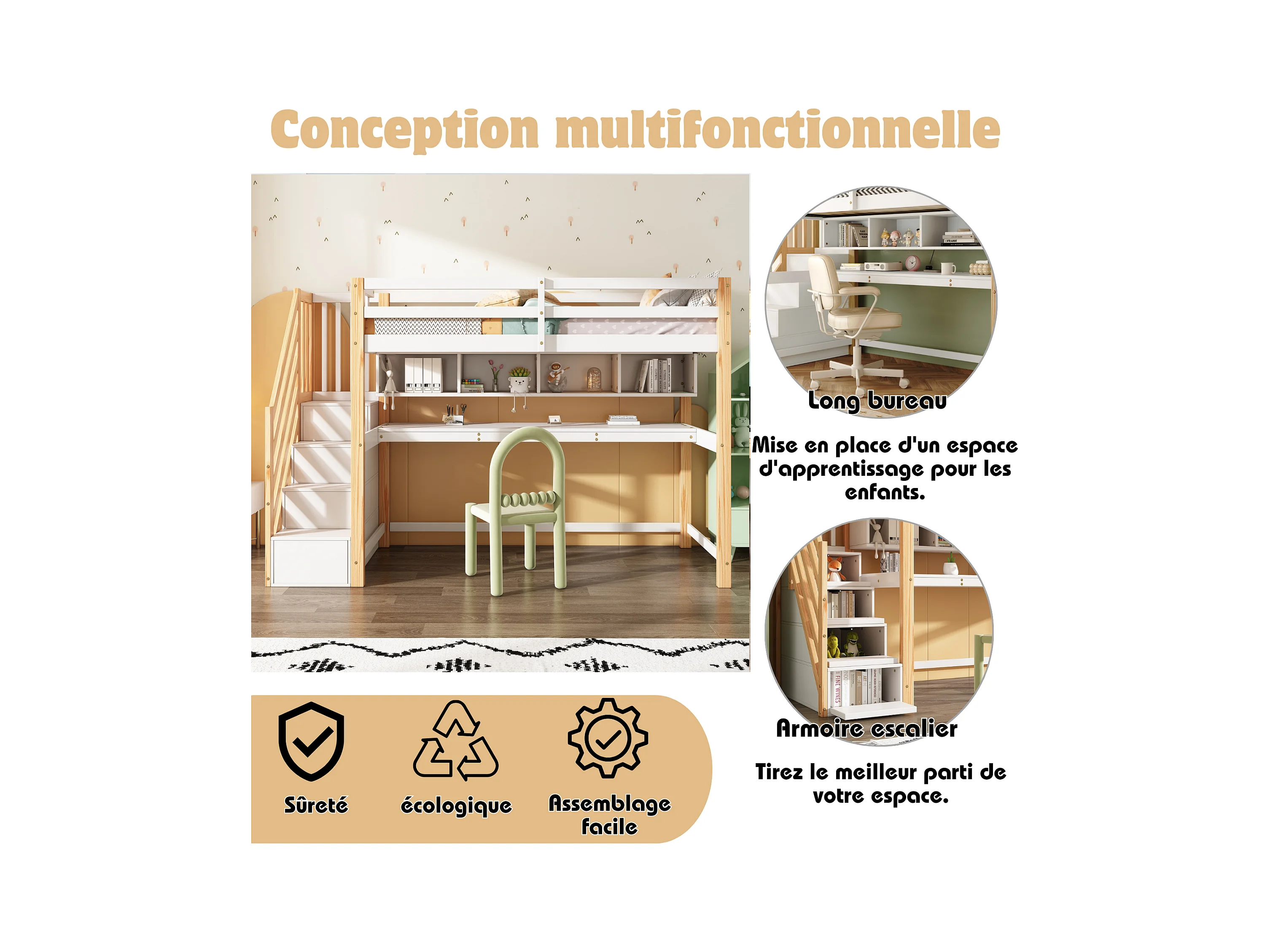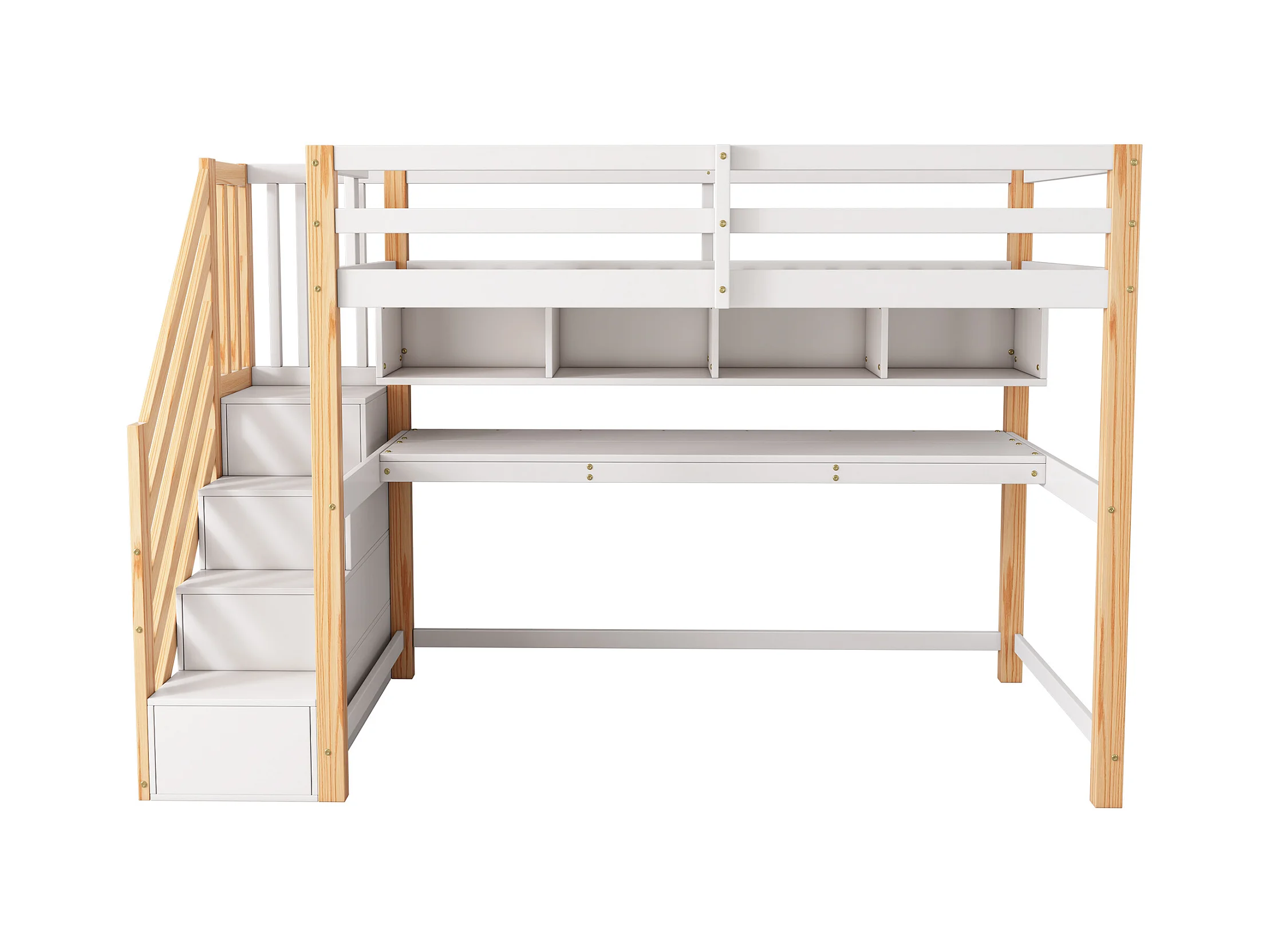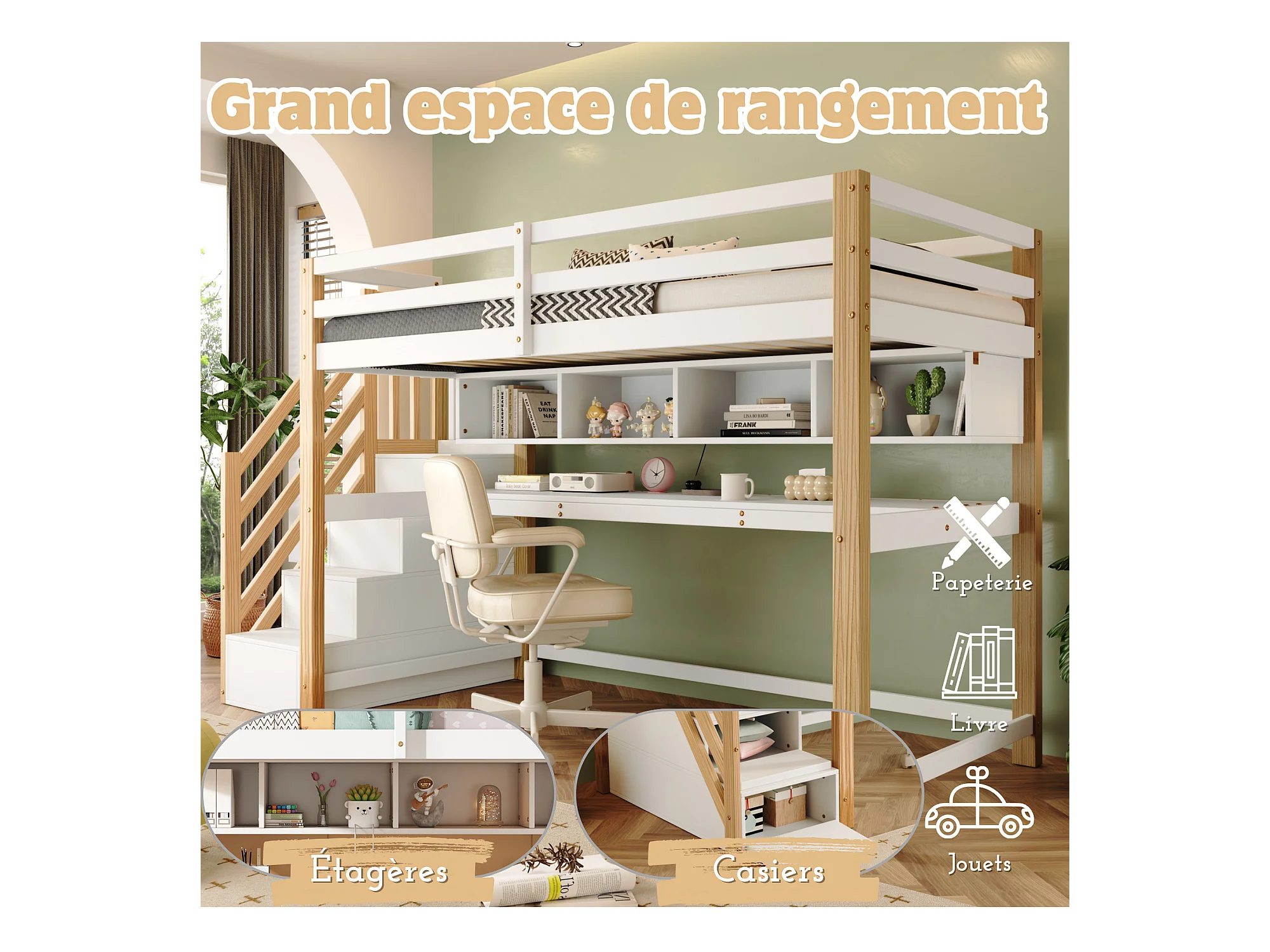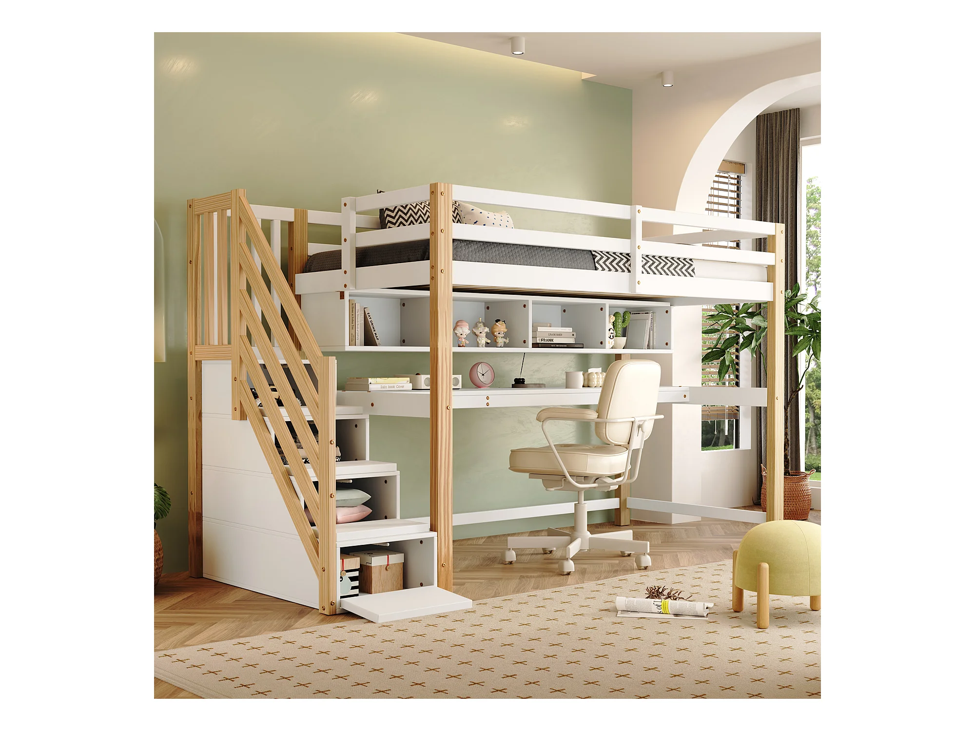 Letto a soppalco 90 x 200 cm con scrivania, ripiani e 4 cassetti - legno di pino - colori: naturale e bianco