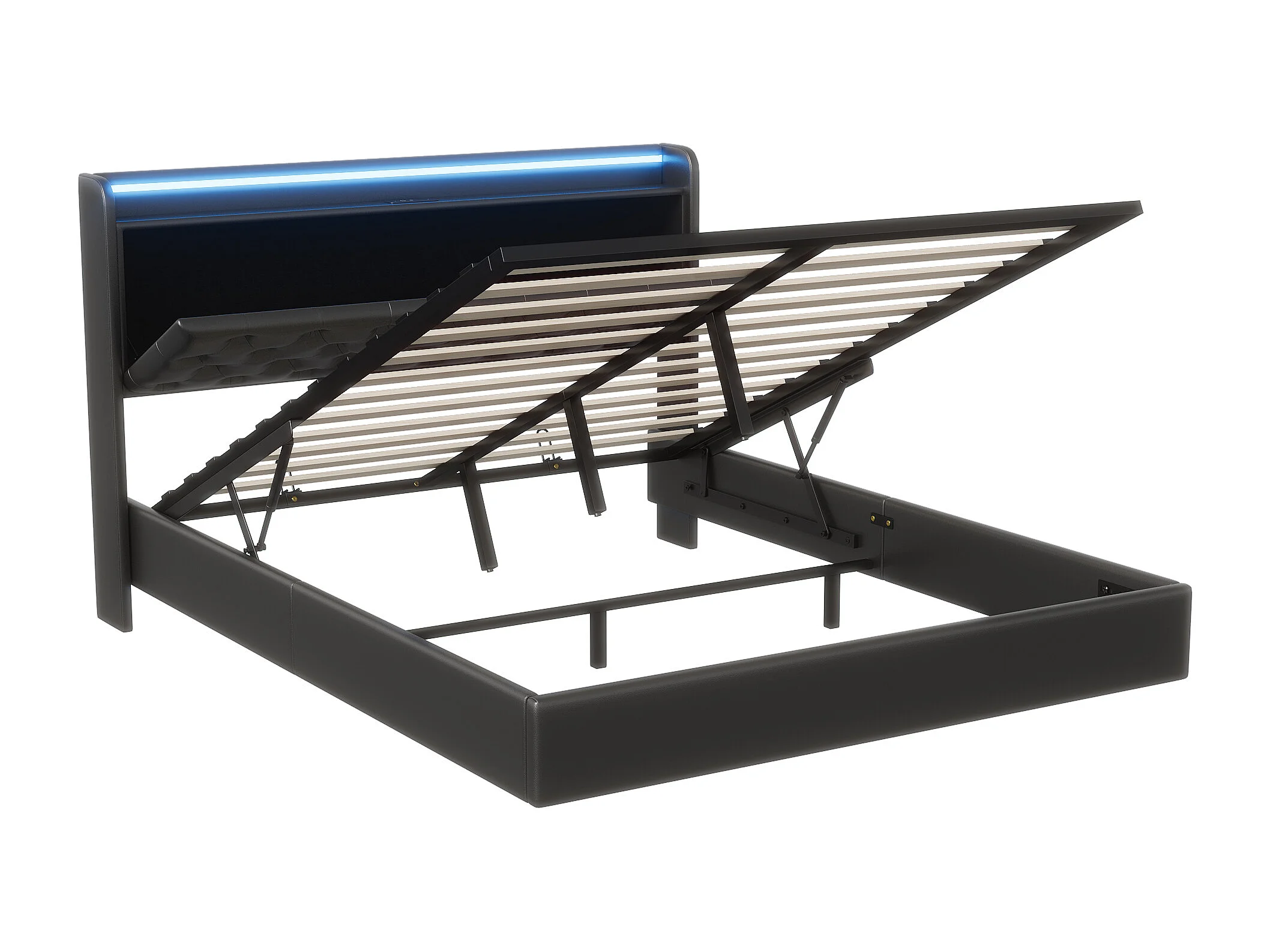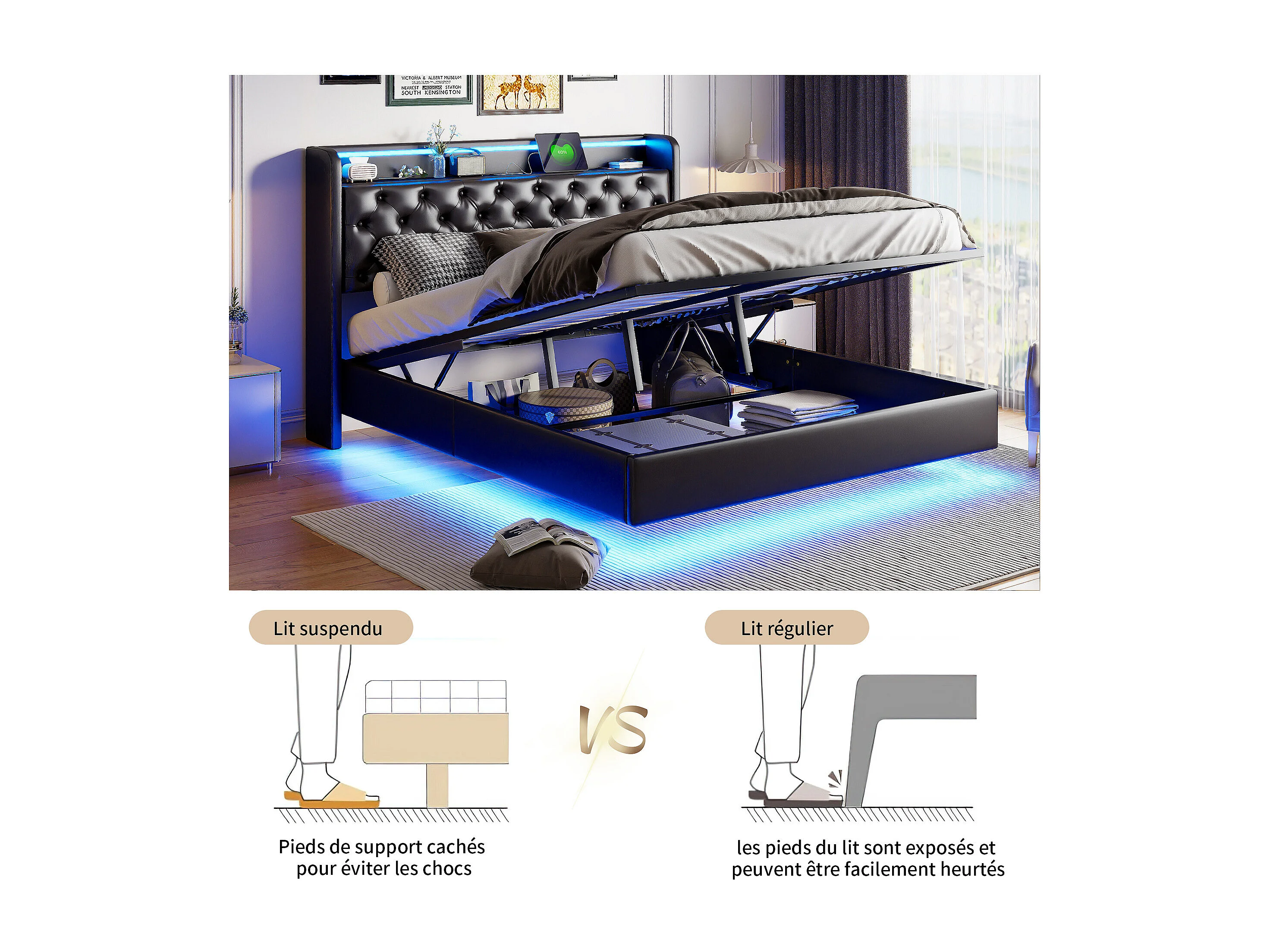 Letto sospeso 140x200 cm con contenitore integrato, testiera a LED, rivestimento in PU nero, prese USB e di corrente, moderno telaio idraulico