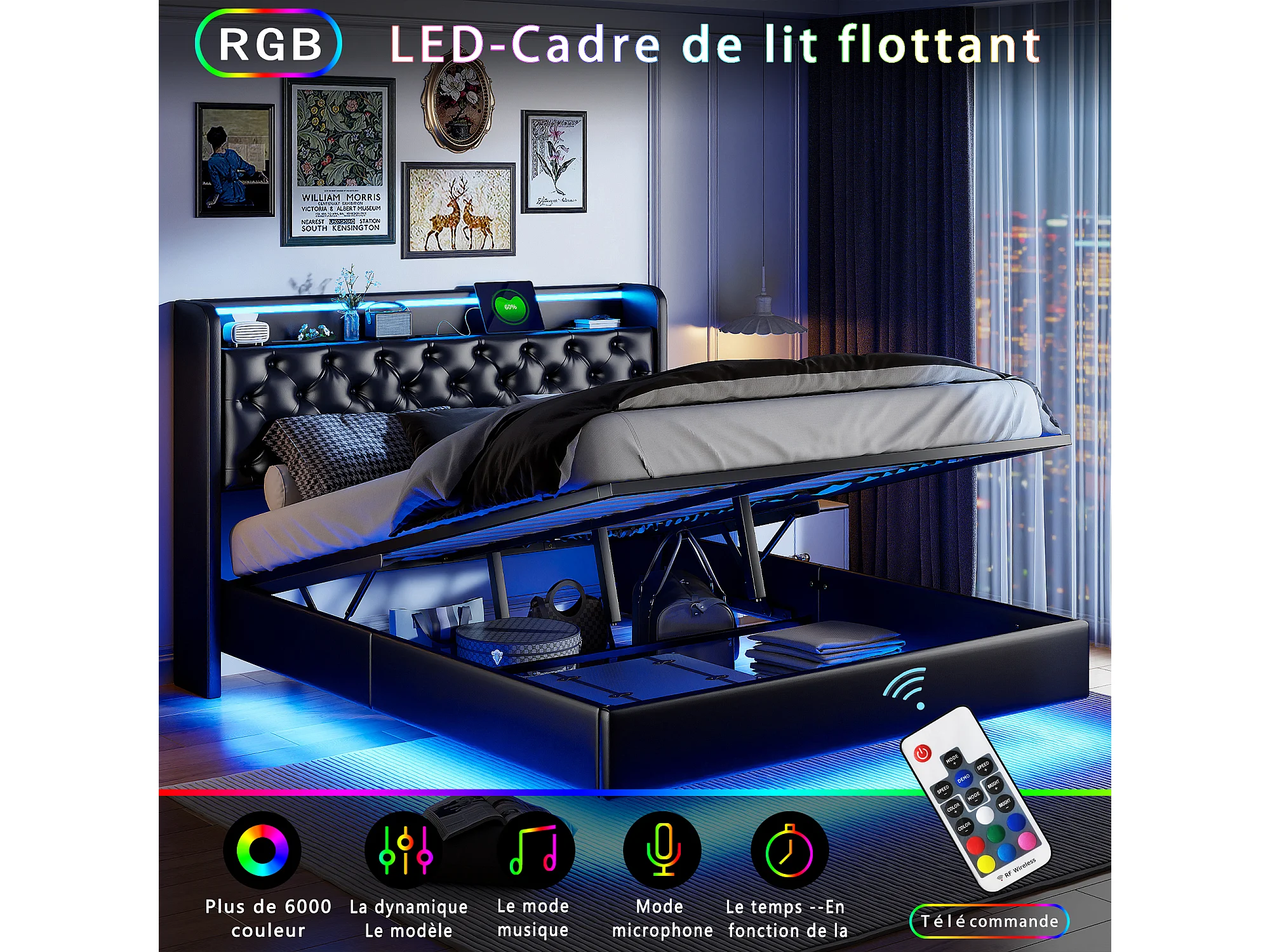 Letto sospeso 160x200 cm con contenitore integrato, testiera a LED, rivestimento in PU nero, prese USB e di corrente, moderno telaio idraulico