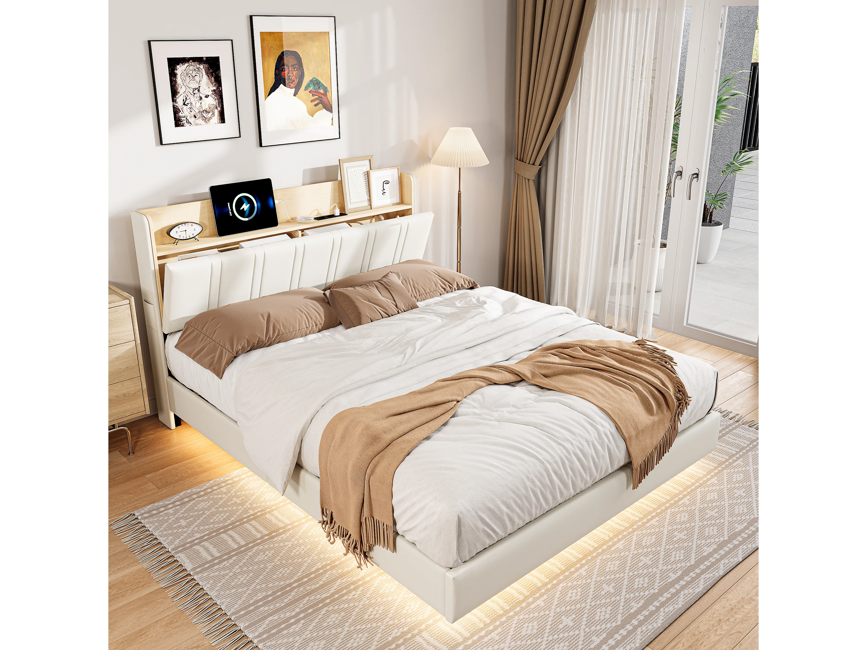 Letto sospeso 160x200 cm, letto matrimoniale imbottito con rete a doghe, illuminazione a LED e ricarica USB, PU, bianco