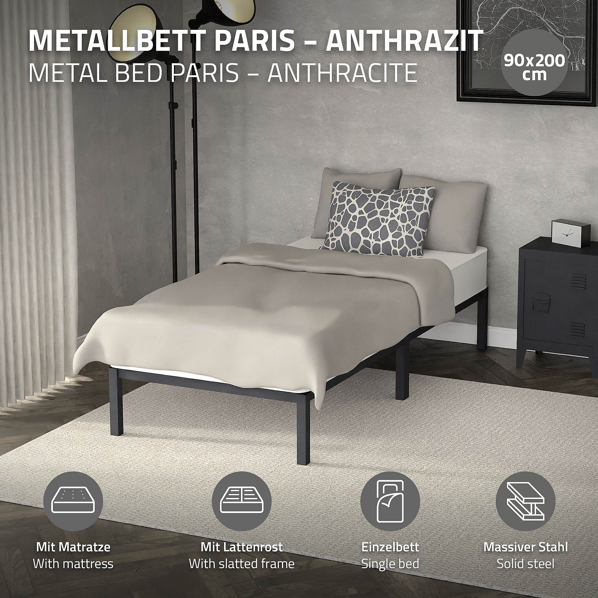 Letto telaio in acciaio antracite 200 x 90 cm con materasso singolo a schiuma