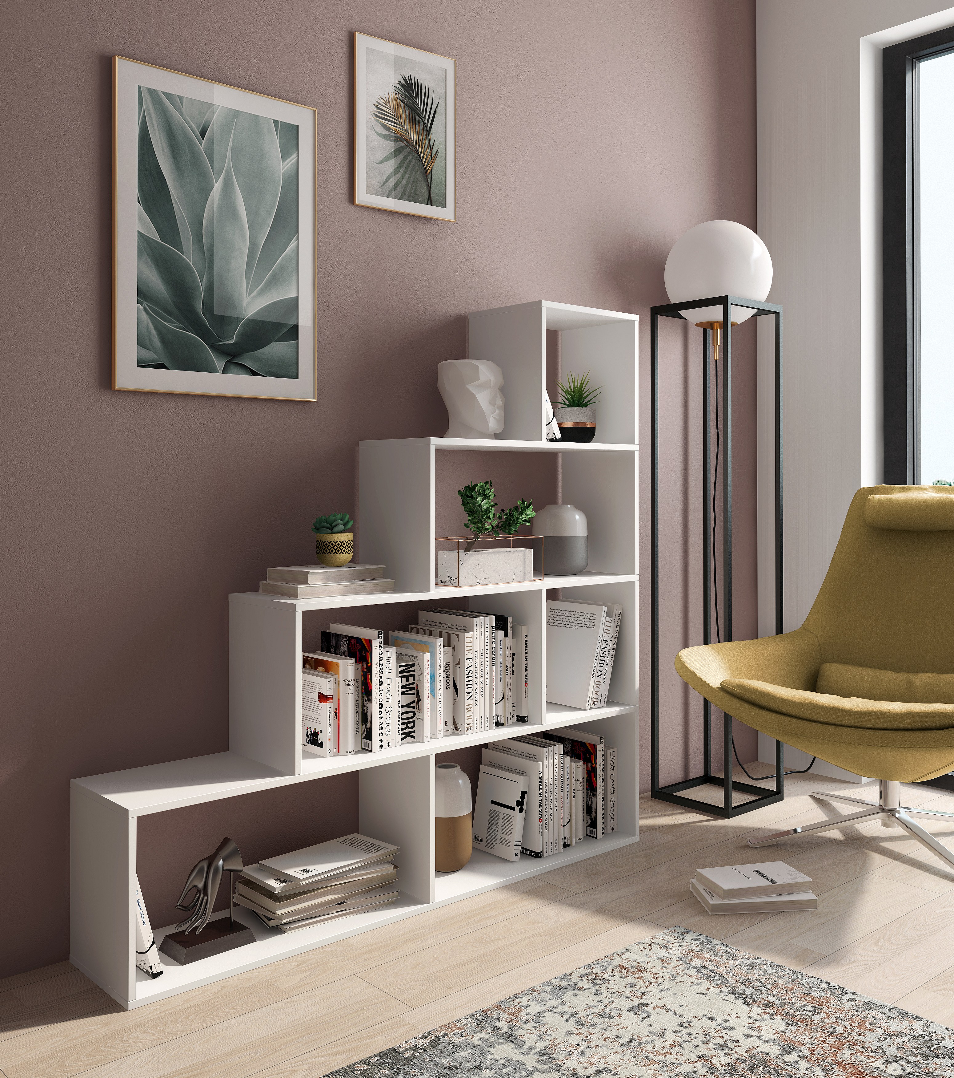 Libreria Moderna Asimmetrica Porta Libri Mensole Ripiani Design Bifacciale Con Vani Aperti e Chiusi Soggiorno Salotto 145 x 27,8 x 142 Cm Bianco
