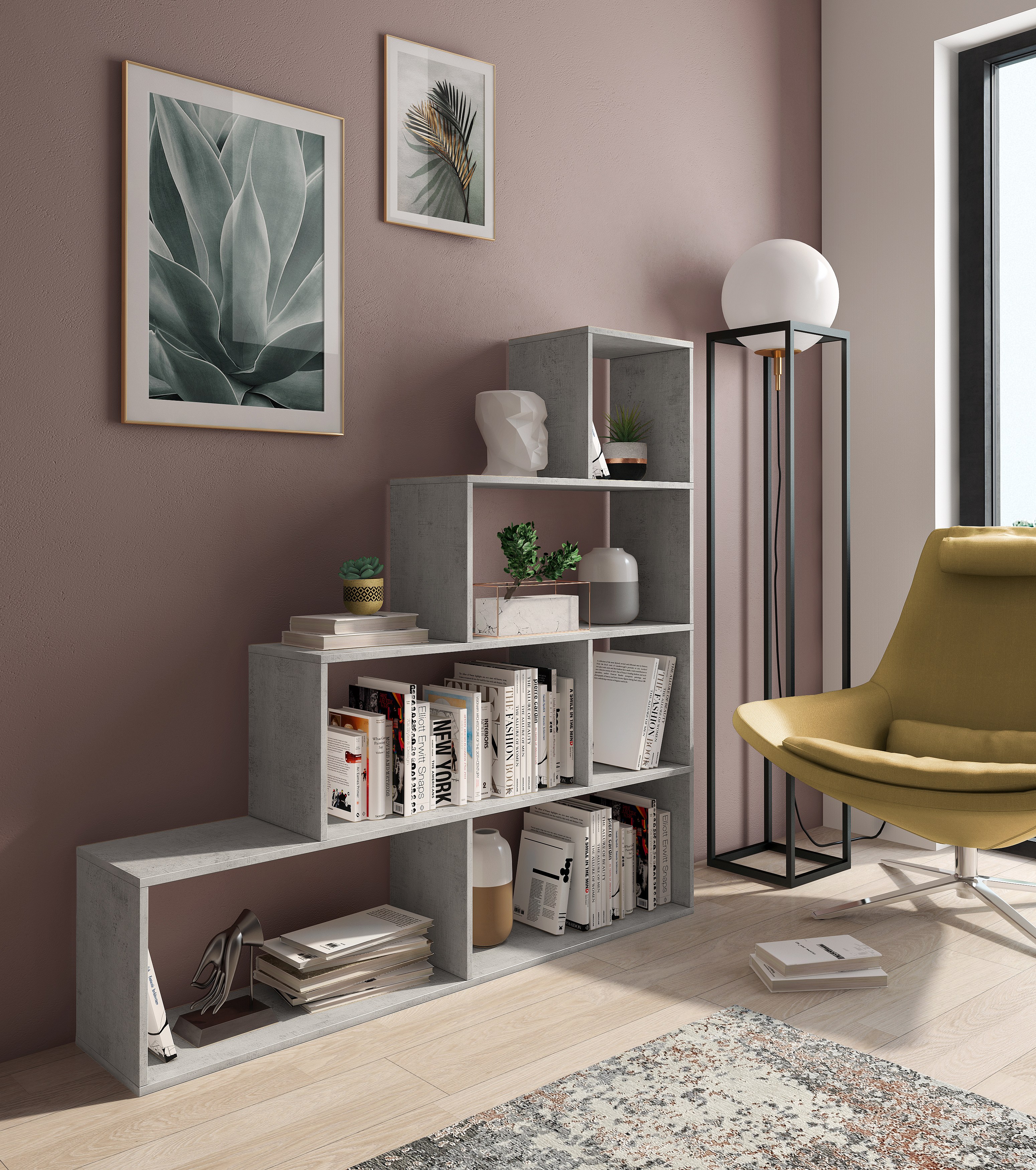 Libreria Friburgo Design Scaffale Mensola Moderna Grigio Cemento Mobile per Libri con Ripiani per Soggiorno Salotto 110 x 97 x 25 cm (Colore Grigio Cemento)
