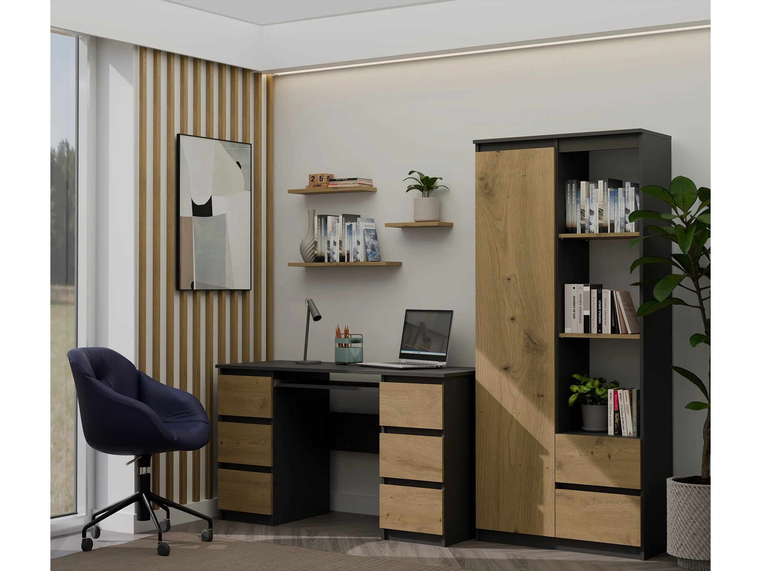 Libreria moderna 60x180x35 cm con cassetti rovere e antracite LBT6
