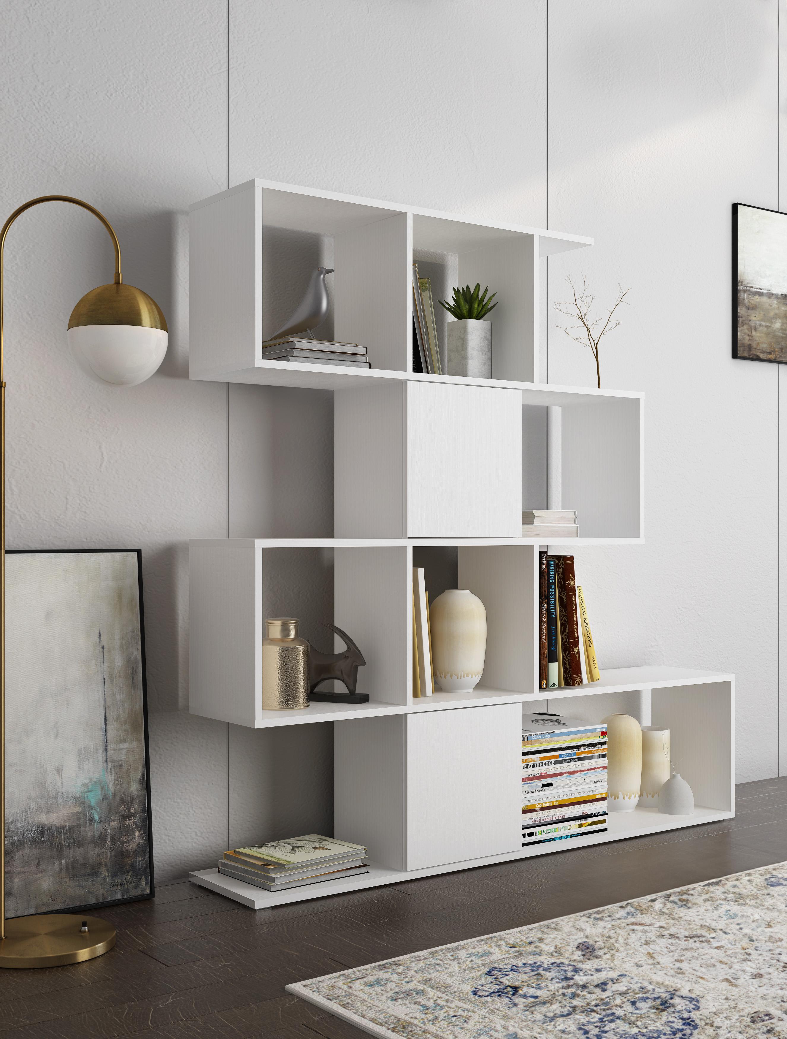 Libreria Moderna Asimmetrica Porta Libri Mensole Ripiani Design Bifacciale Con Vani Aperti e Chiusi Soggiorno Salotto 145 x 27,8 x 142 Cm Bianco